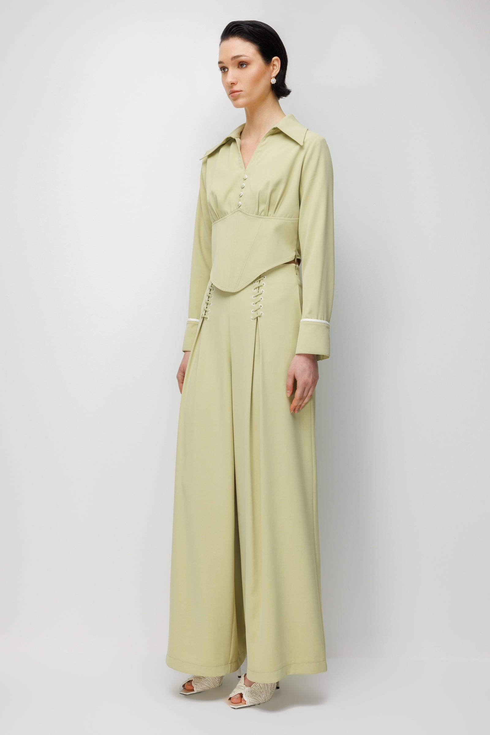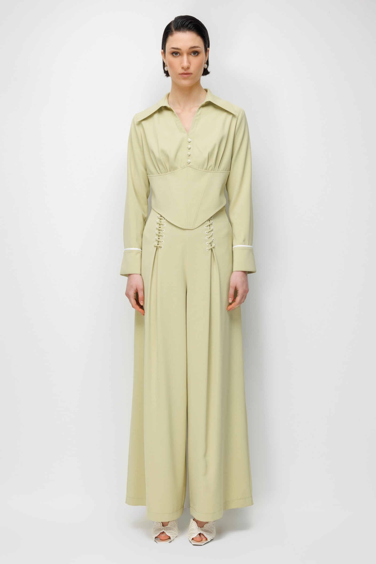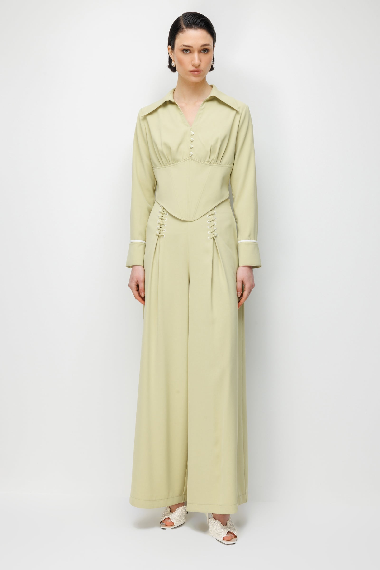 Bu pantolonu eşsiz kılan en dikkat çekici detay, bel hizasında yer alan korsaj ilhamlı şerit bağcık sistemi; ön yüzde çapraz geçen beyaz şeritler ve metal iliklerin yarattığı korse efekti, klasik bir pantolona cesur ve feminen bir karakter katarken bel çevresini zarif bir şekilde çerçeveliyor. Yüksek belden başlayan derin pili detayları vücut hatlarına yapılandırılmış bir çerçeve oluştururken, belden aşağıya doğru genişleyen geniş paça formu her adımda akıcı bir hareket sunuyor. Manşet hizasındaki ince beyaz kontrast biye detayı pantolonun genelindeki beyaz şerit temasını tamamlayarak bütünlüklü bir tasarım dili oluşturuyor. İster aynı renk korsajlı gömlek ile total mint şıklığı yakalayarak ister beyaz veya ekru bir üst parçayla taze bir kombin oluşturarak her ortamda cesur bir etki bırakıyor.