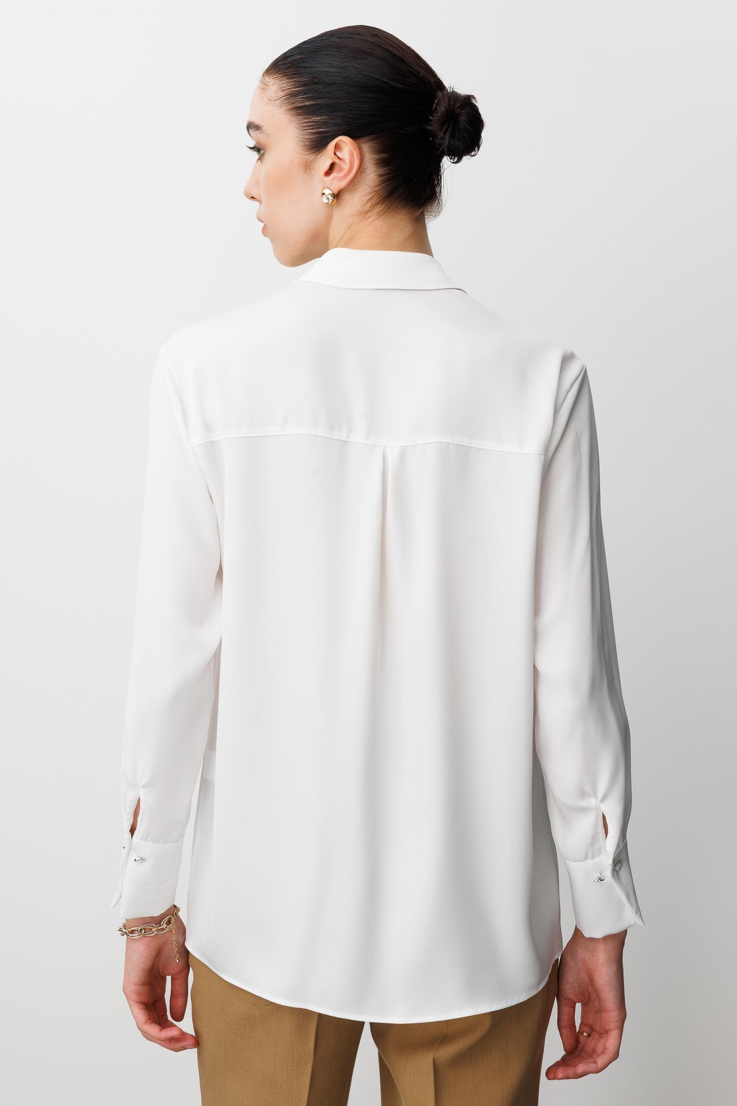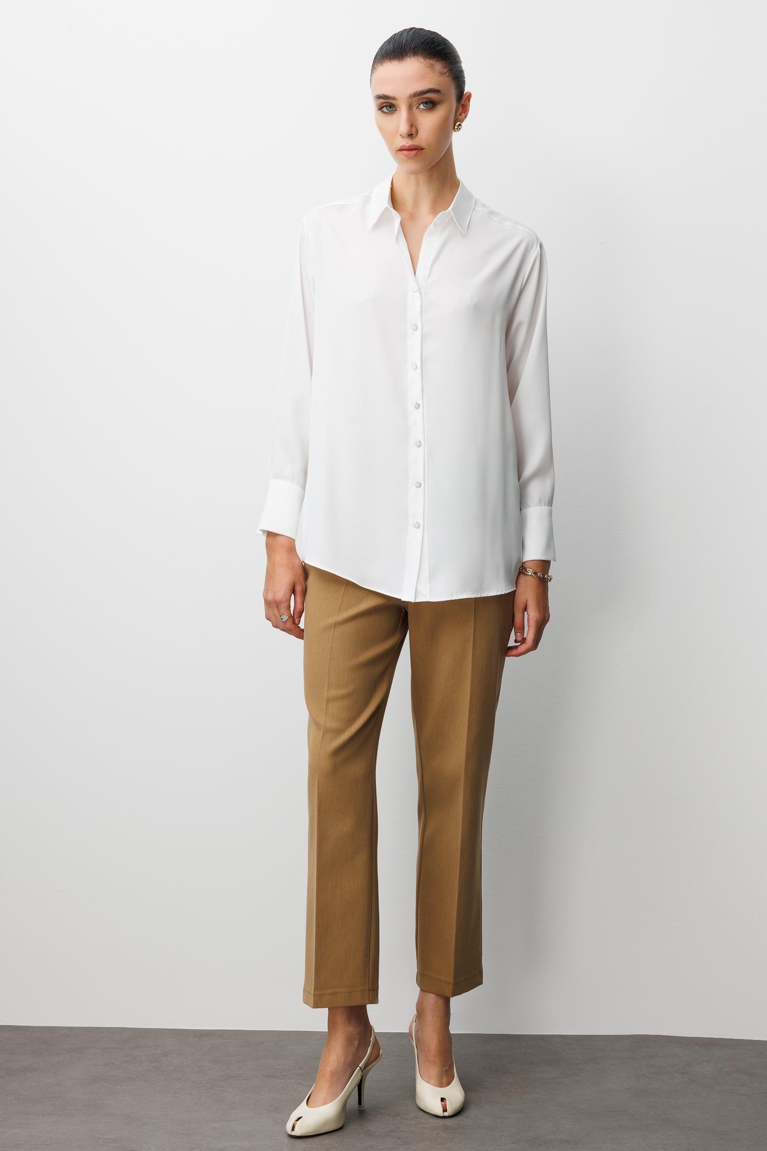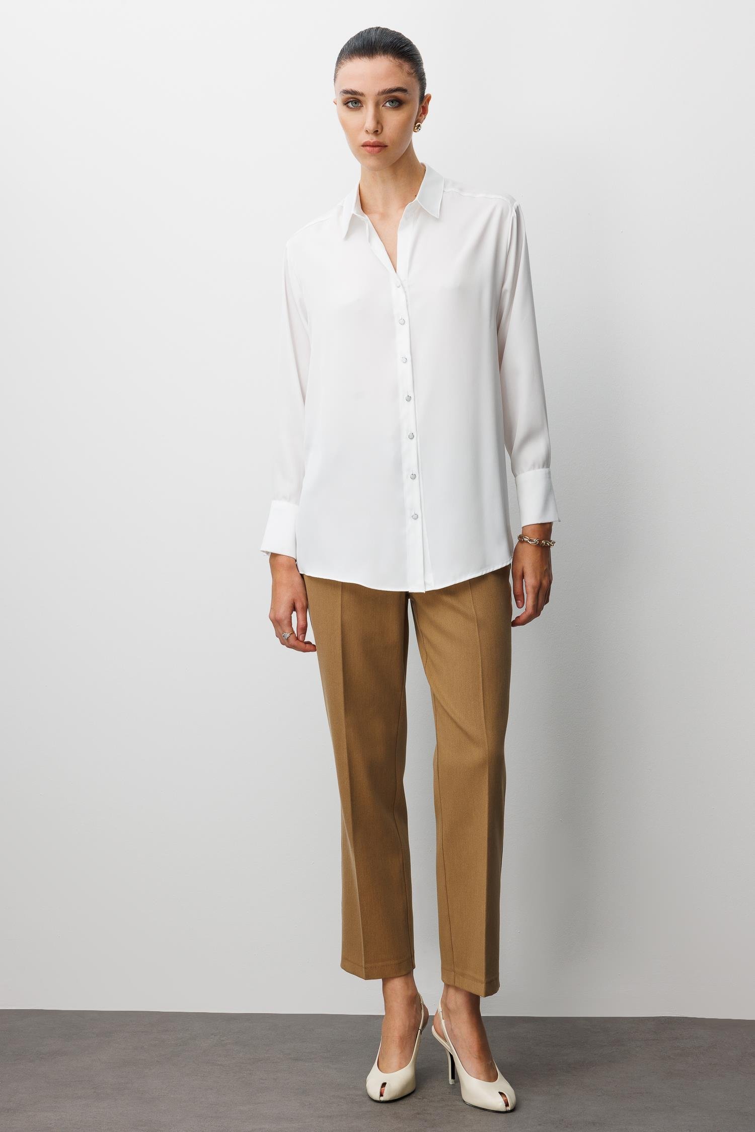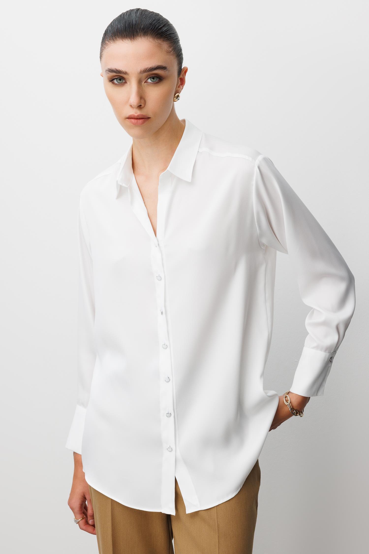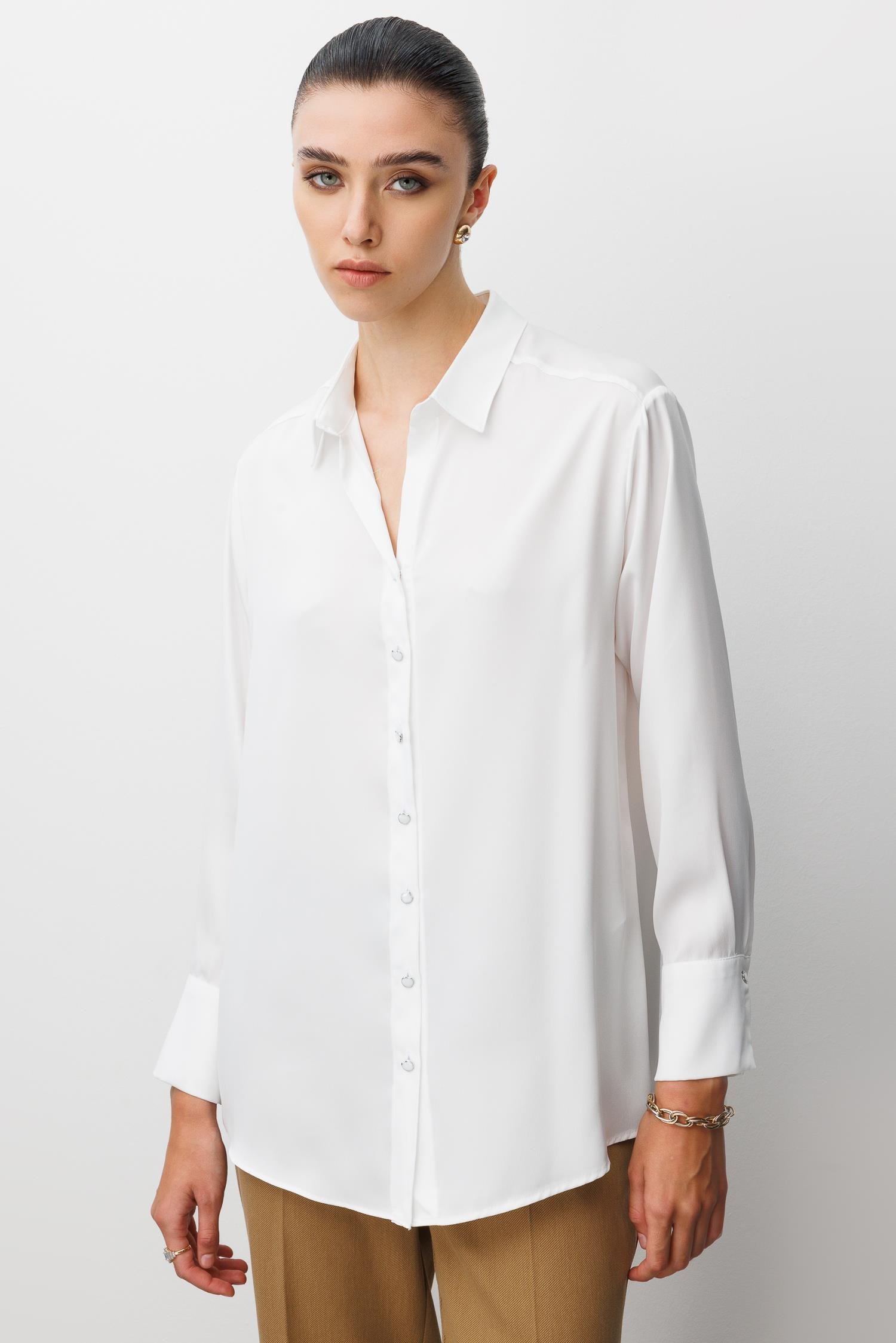 Sade zarafet Modailgi dokunuşuyla buluşuyor. Bu ekru saten gömlek, hem klasik hem de modern stillerle kusursuz uyum sağlayarak gardırobun en özel parçalarından biri olmaya aday.