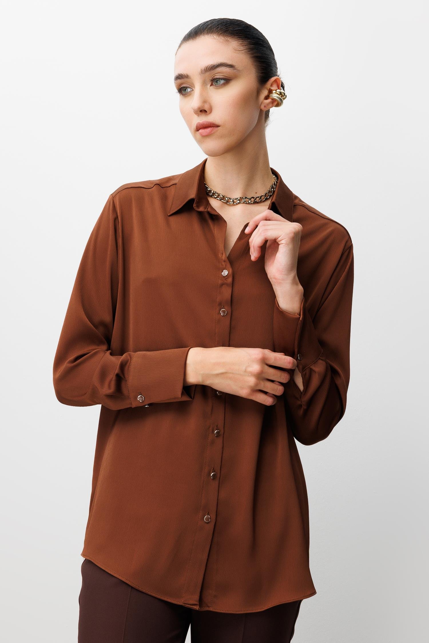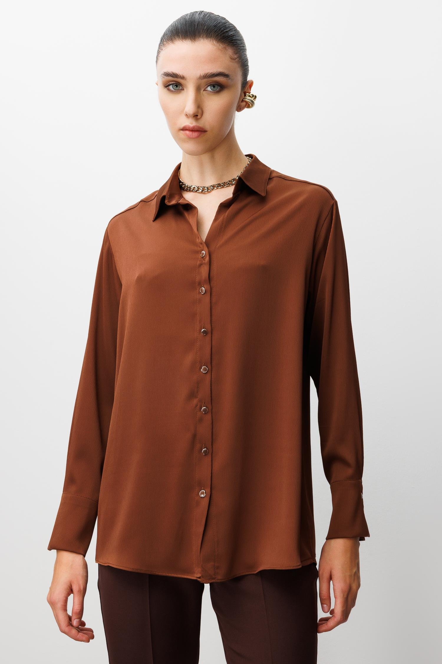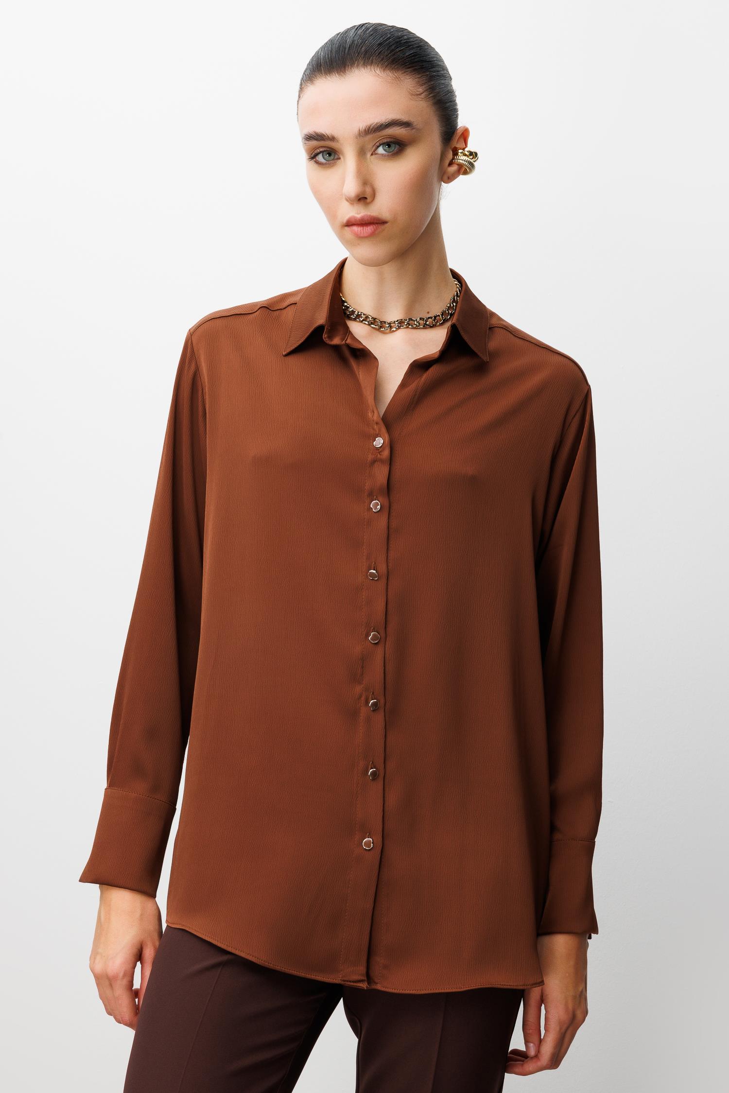 Modailgi Salaş Kalıp Saten Gömlek - Kahve