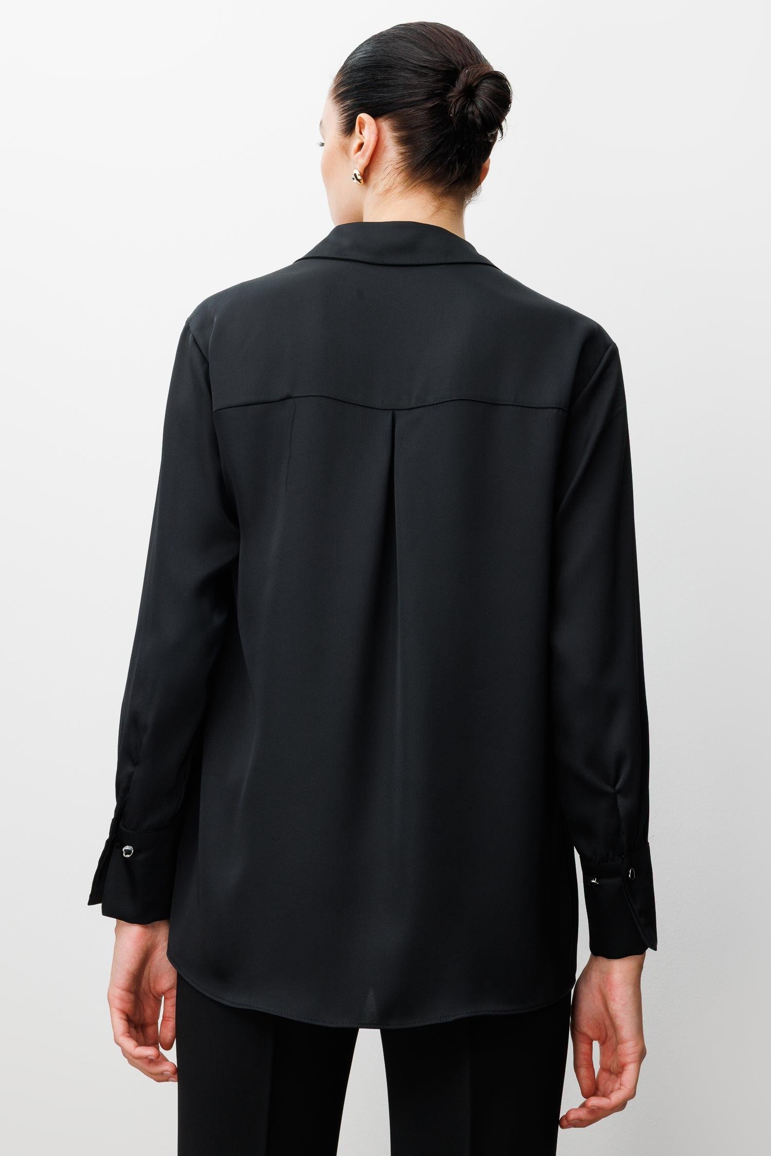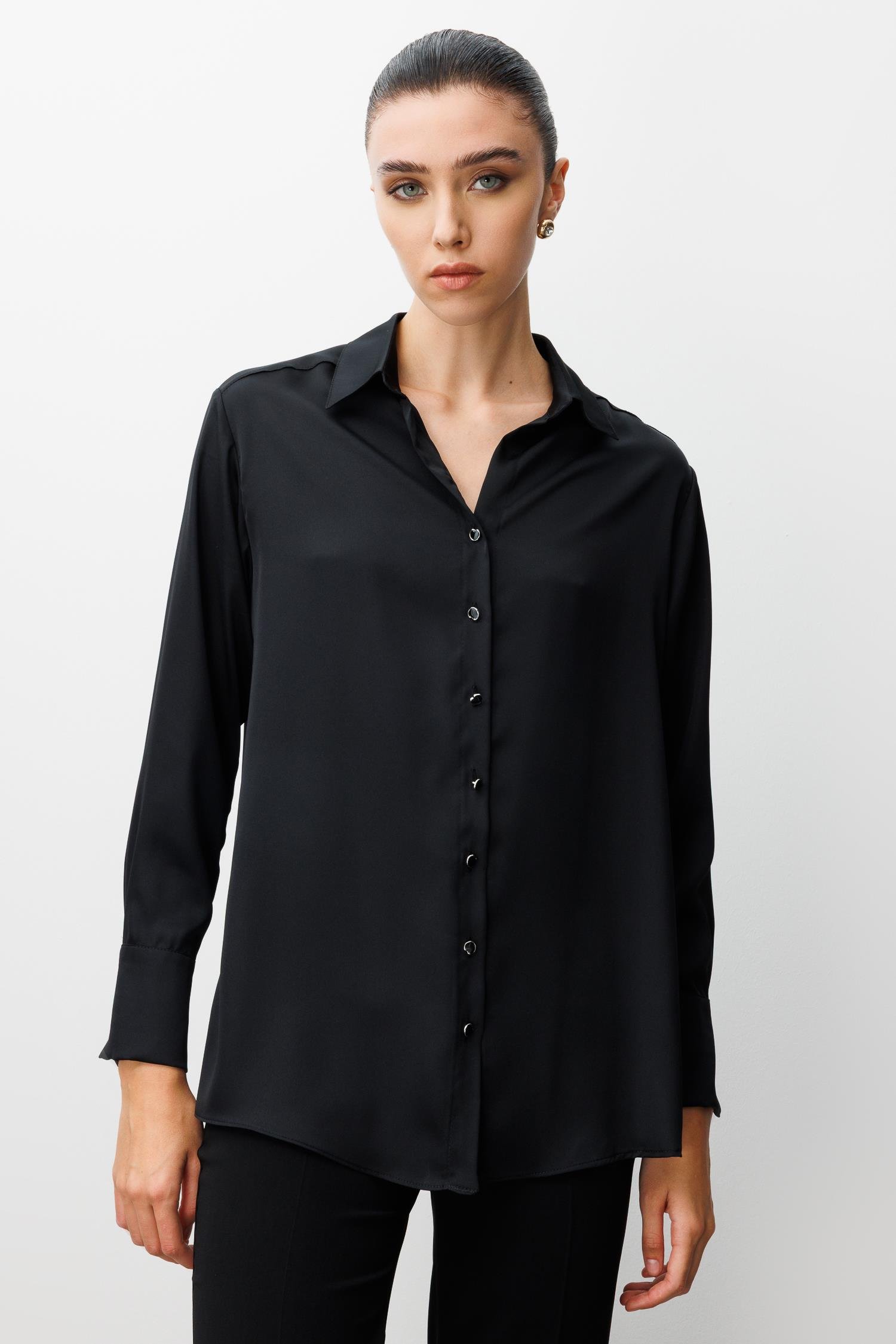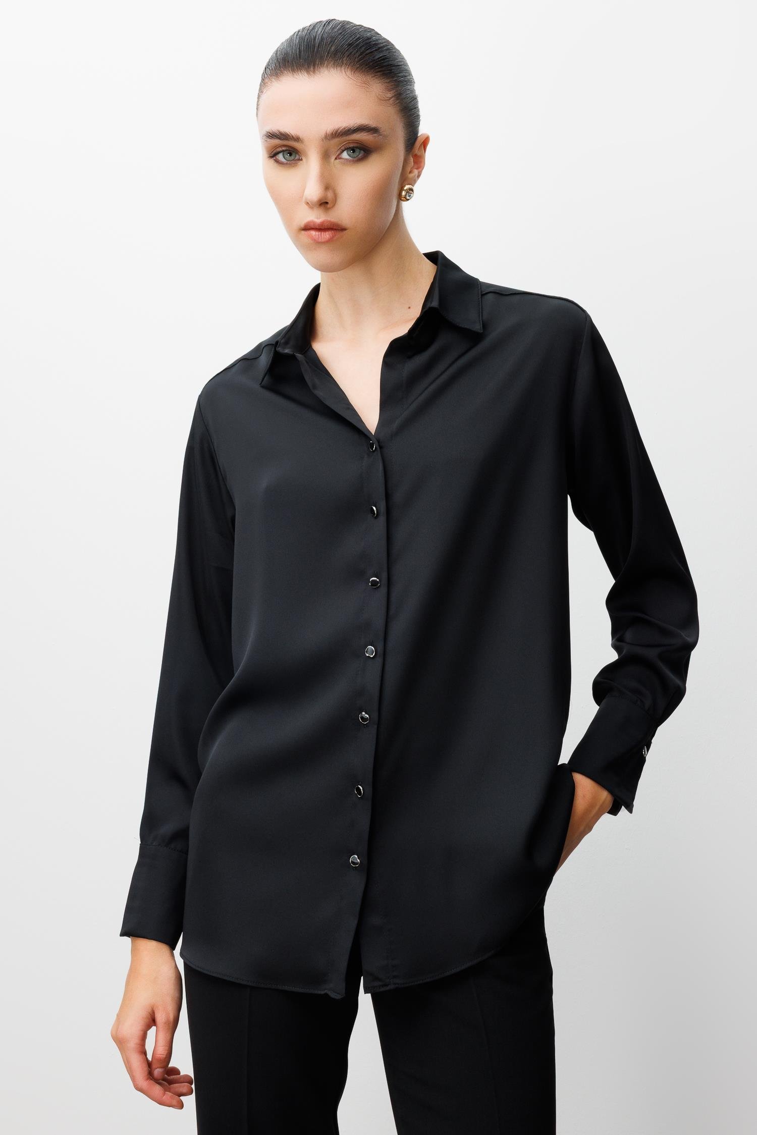 • Model: Salaş kesim, klasik yaka, uzun kollu saten gömlek