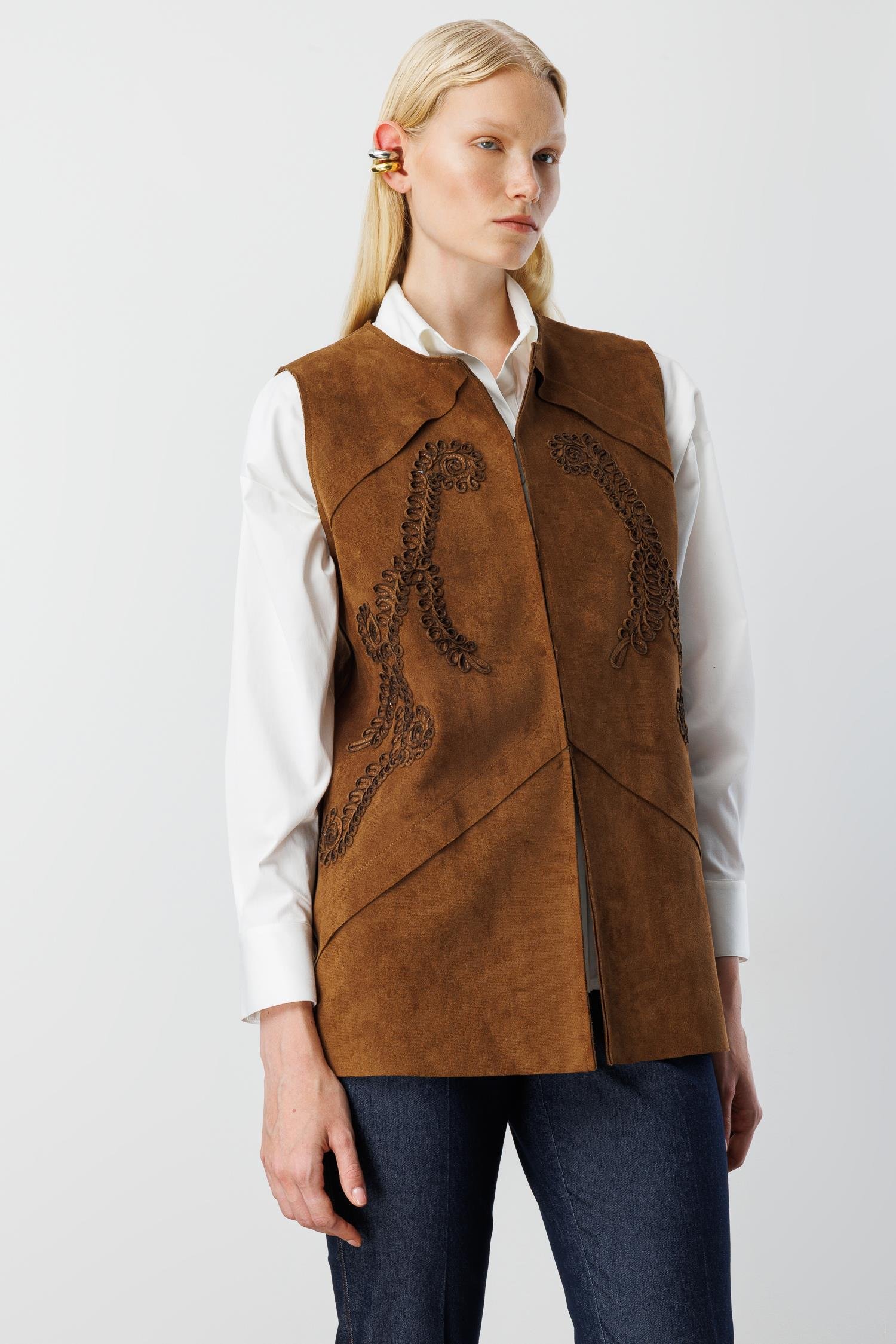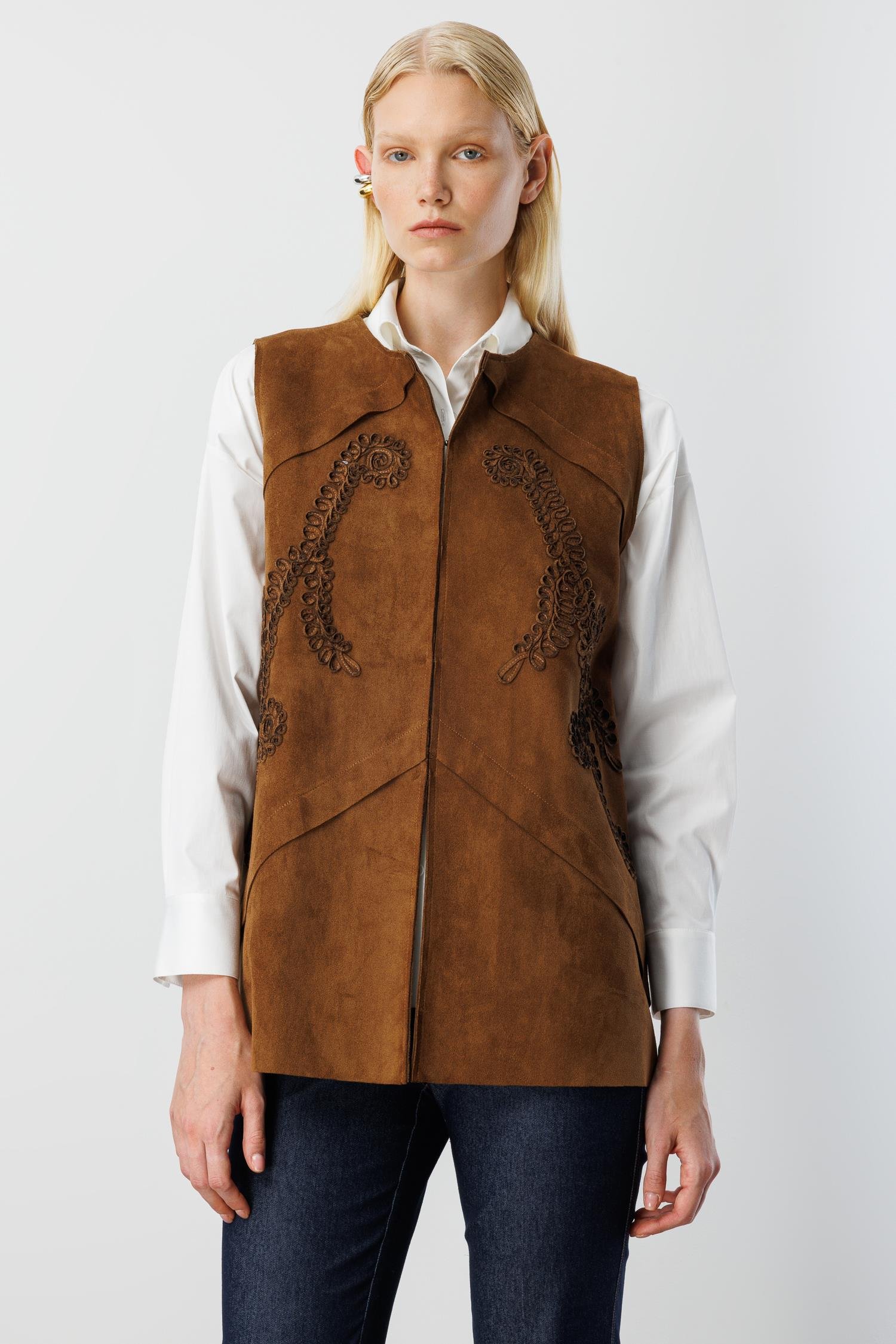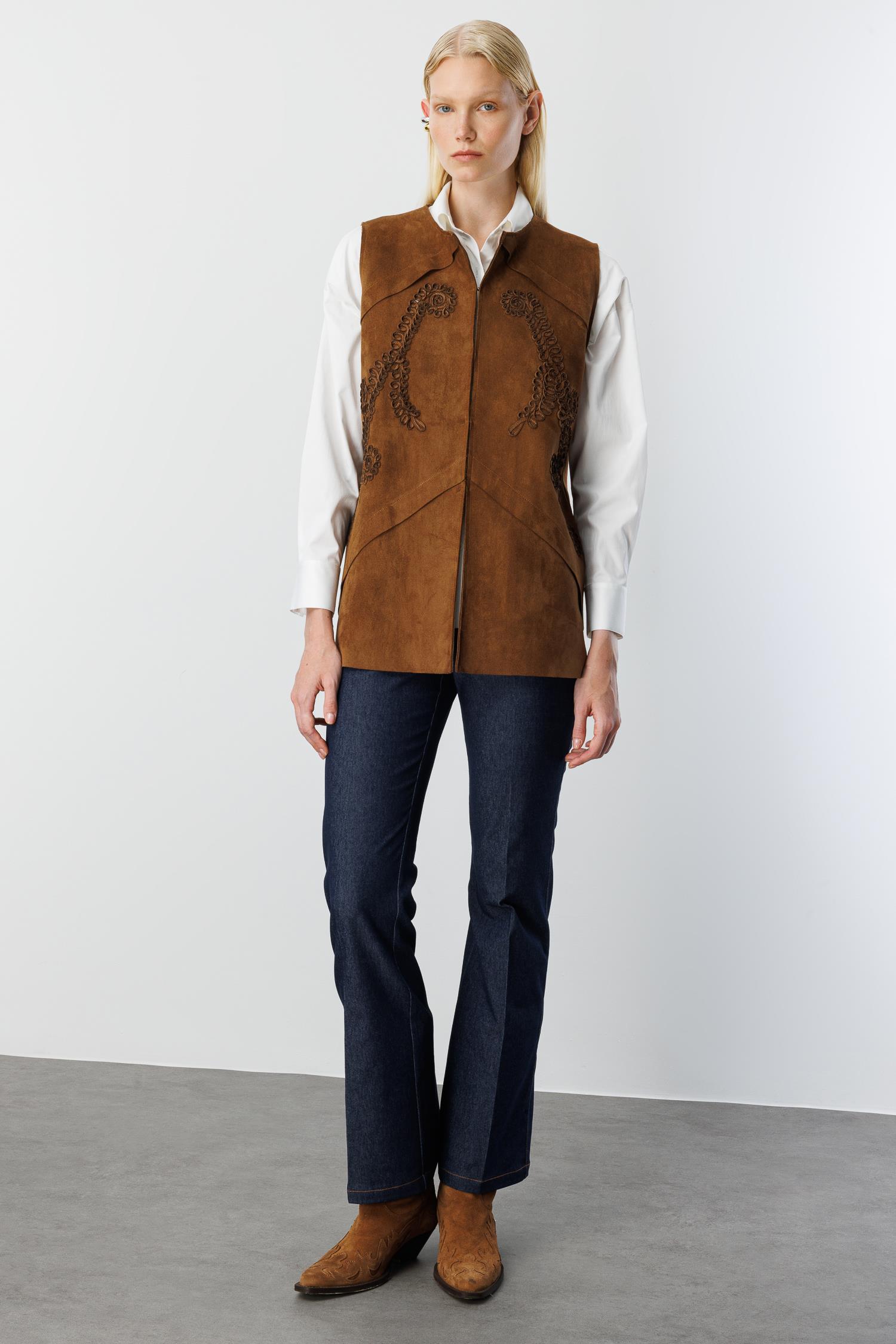 Modailgi Sıfır Yakalı Havalı Dikiş ve Lase Nakış Detaylı Uzun Süet Yelek - Taba