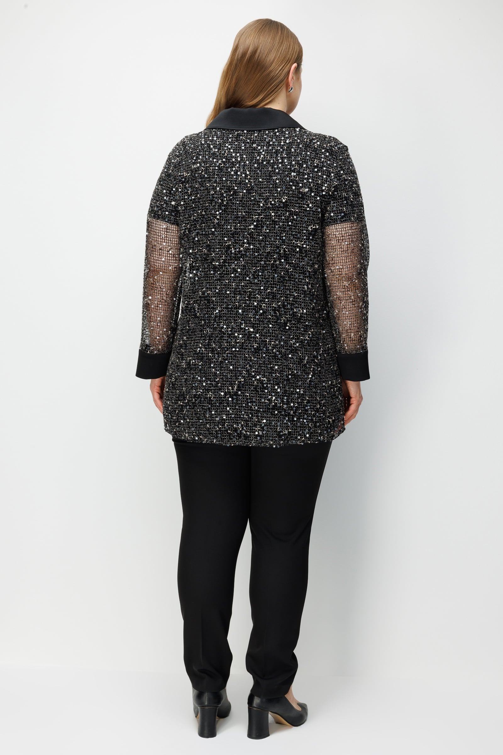 Kollarda modern ve feminen bir transparanlık yaratan File Doku ve kumaşla bütünleşen payet detayları.