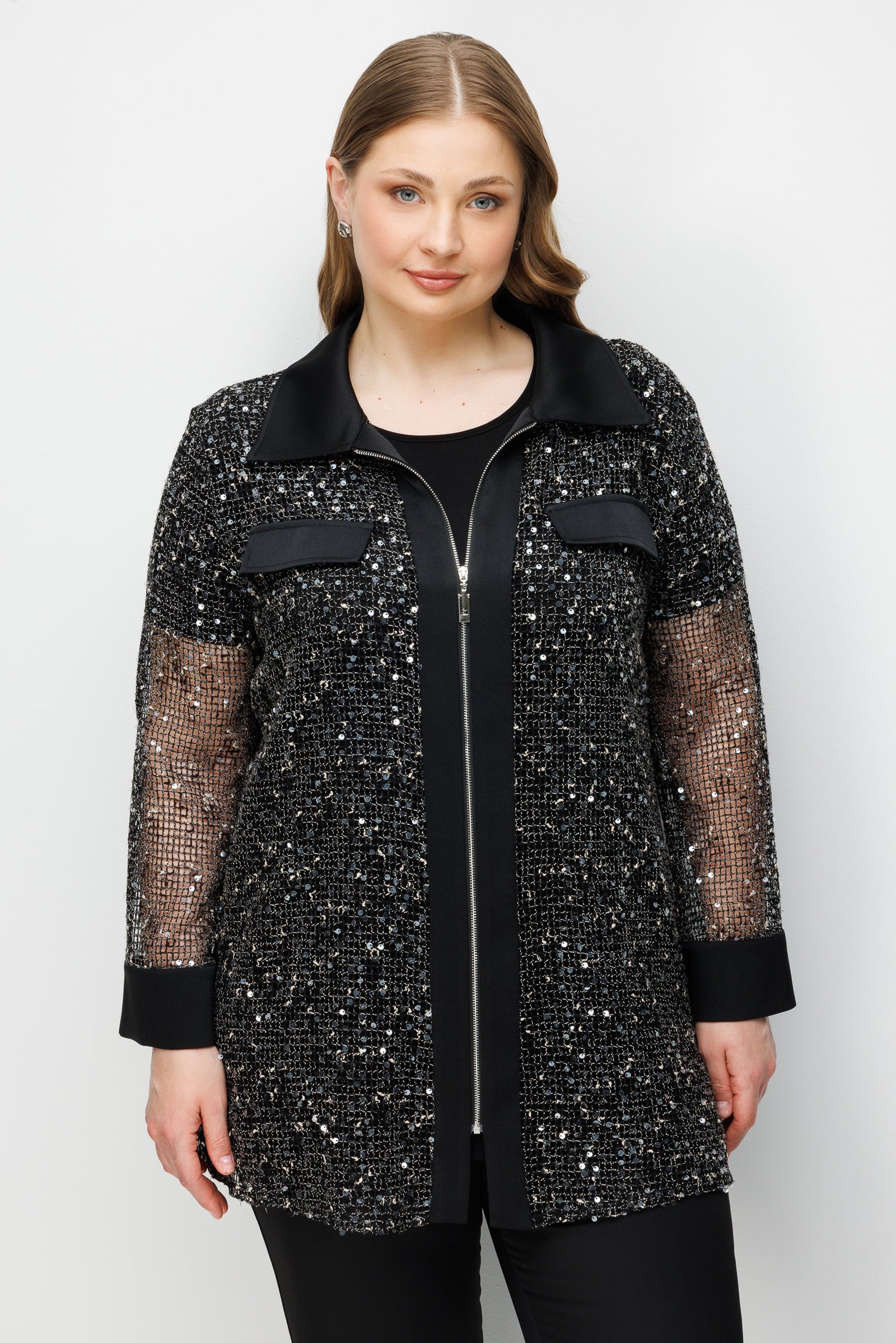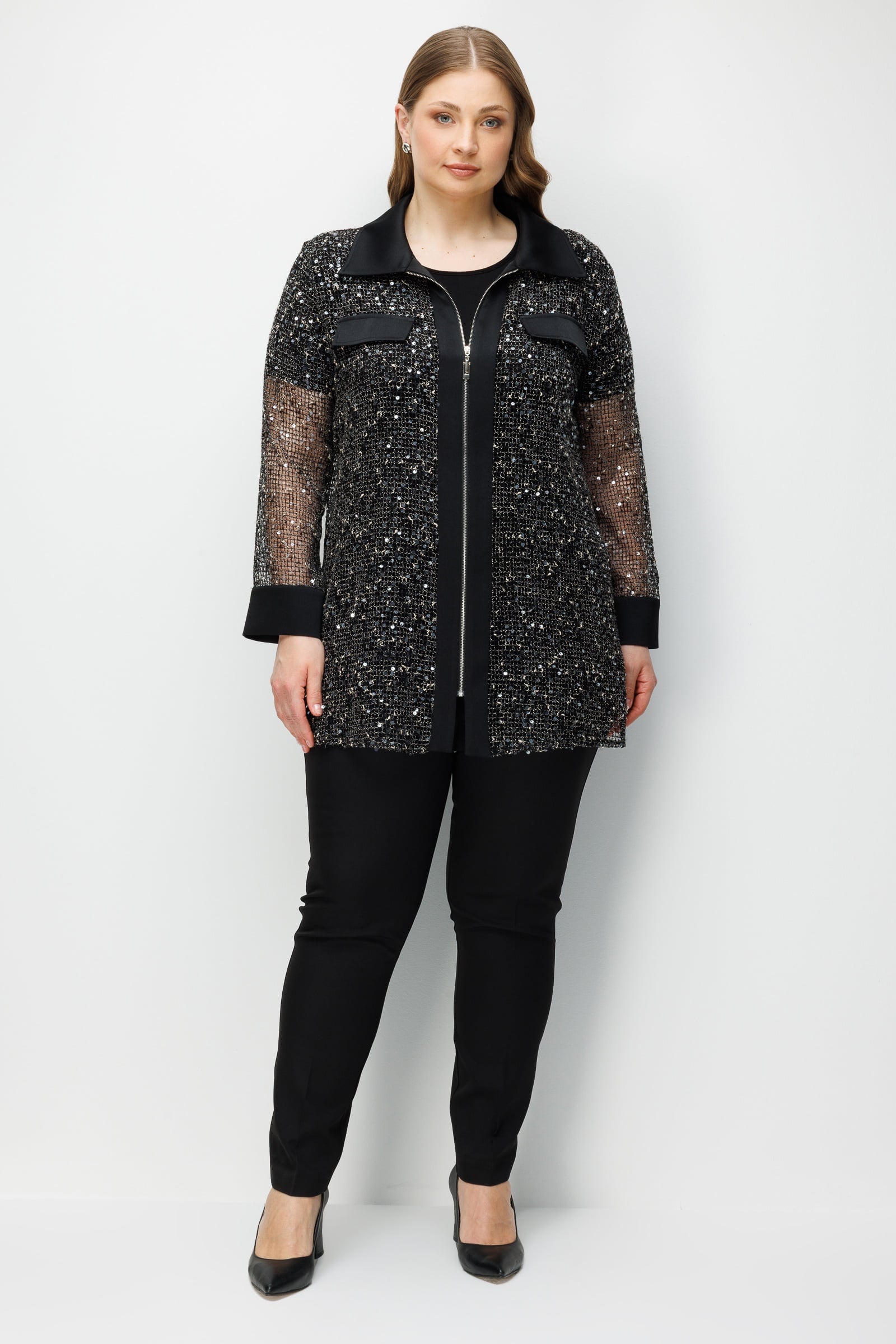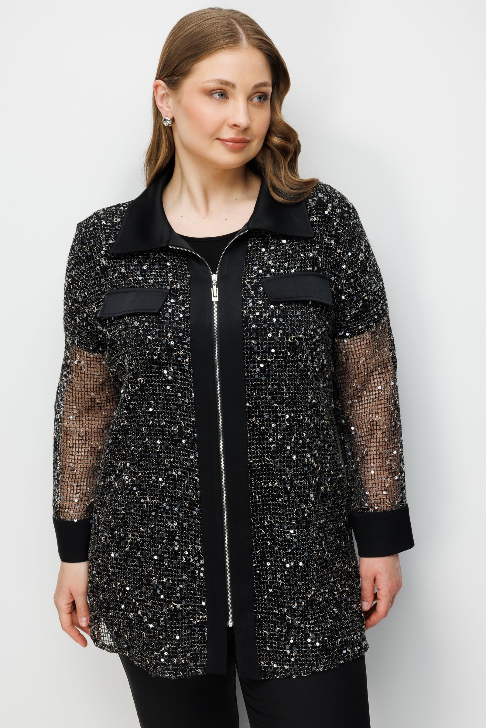 Model: Modern dış giyim formunu gece şıklığıyla harmanlayan, ceket görünümlü ve dökümlü kesime sahip tunik.