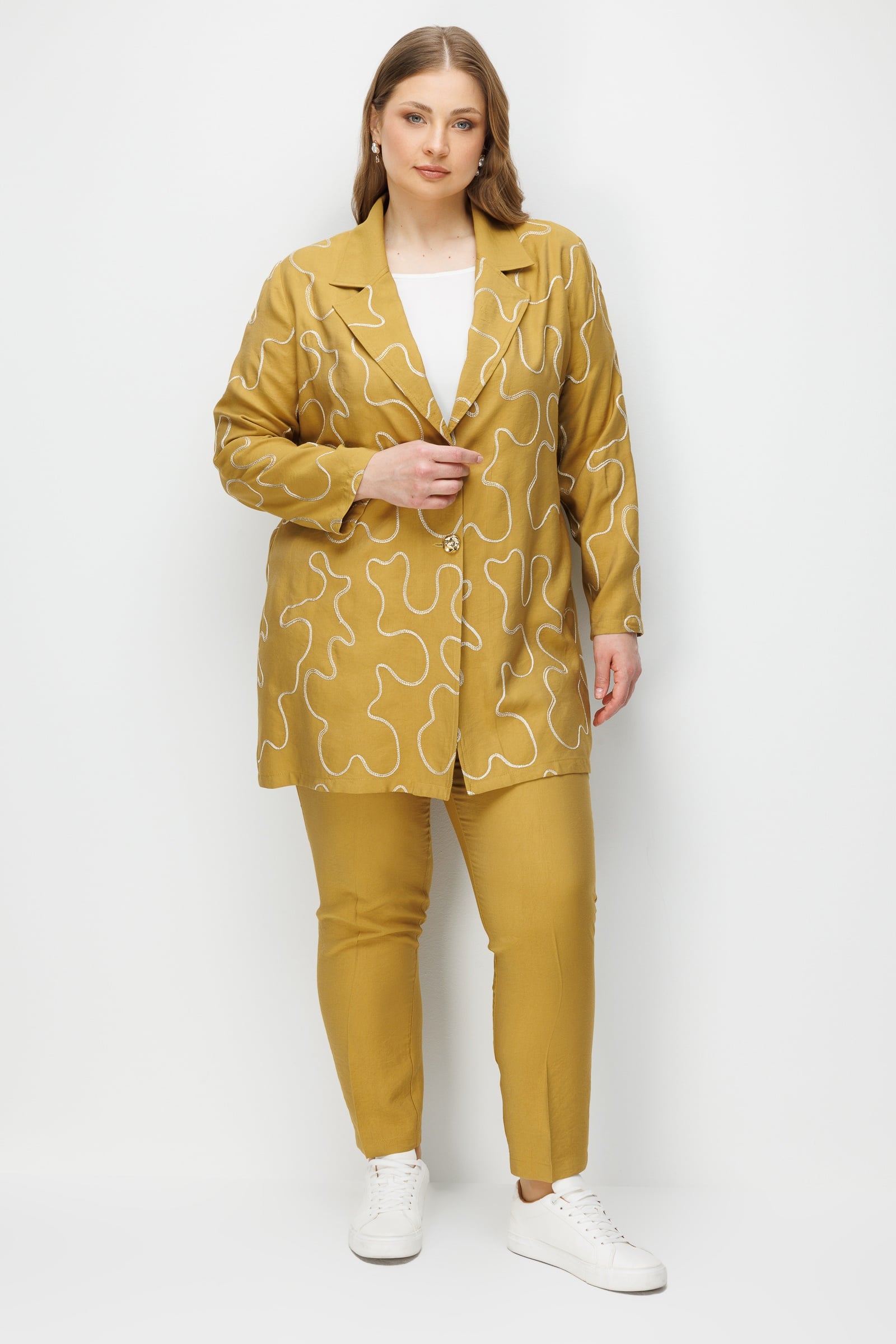 Bu tunik, kışın alışılmış ağır renk paletine karşı bir başkaldırı ve modern bir enerji manifestosu olarak tasarlandı. Klasik erkek yaka disiplini, asit sarısının fütüristik enerjisiyle buluşarak maskülen ve feminen dengesini yeniden tanımlıyor. Üzerindeki akıcı ve soyut nakışlar, kentsel karmaşanın içindeki estetiği temsil ederken; parçanın çok yönlü kullanımı (hem ceket hem tunik) günümüz kadınının dinamik hayatına uyum sağlıyor.