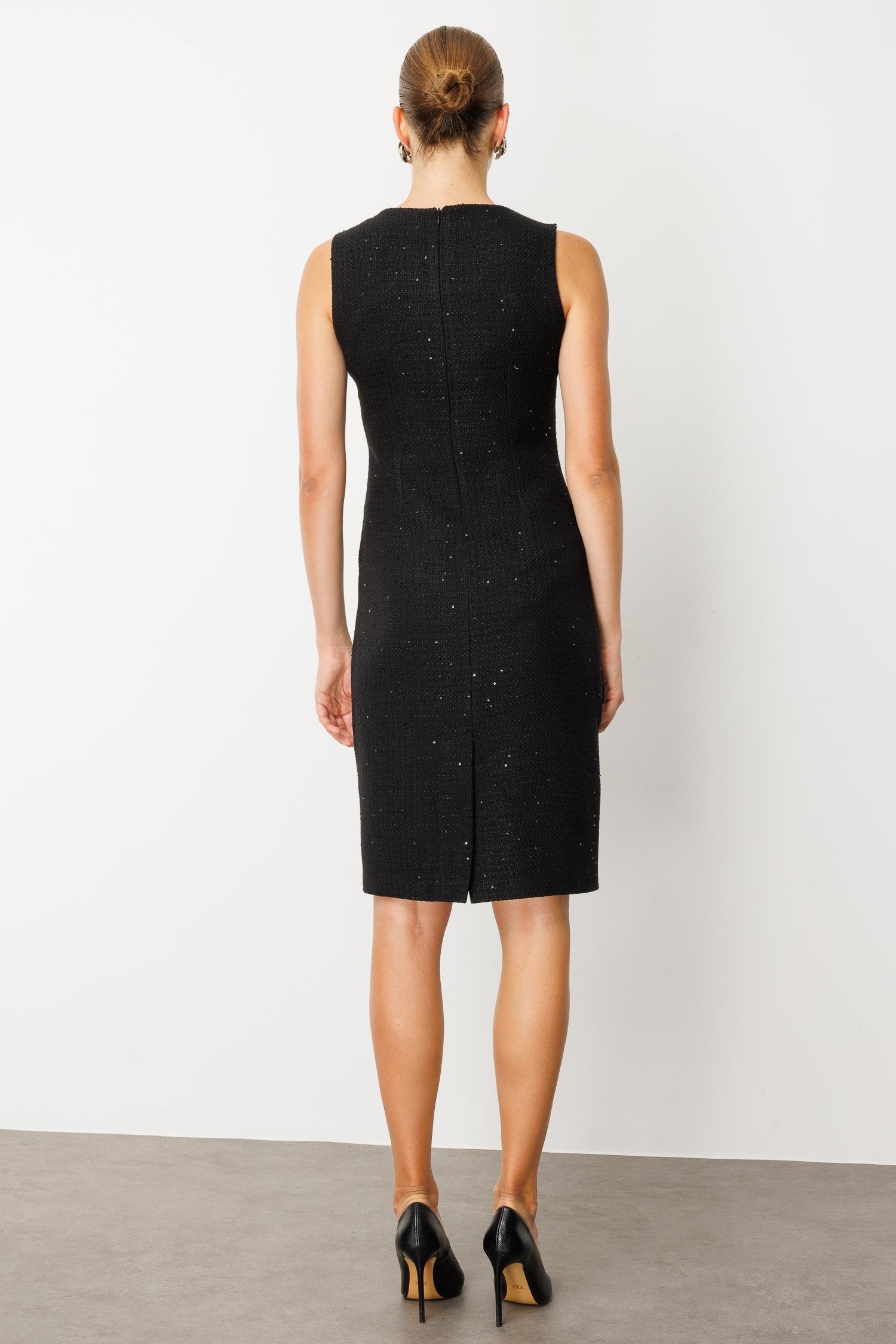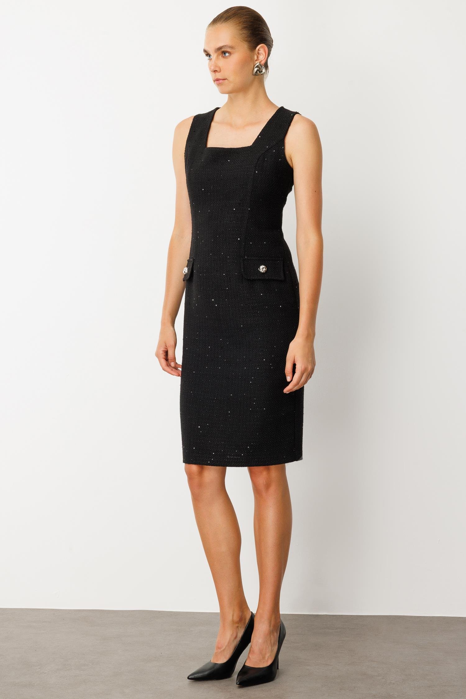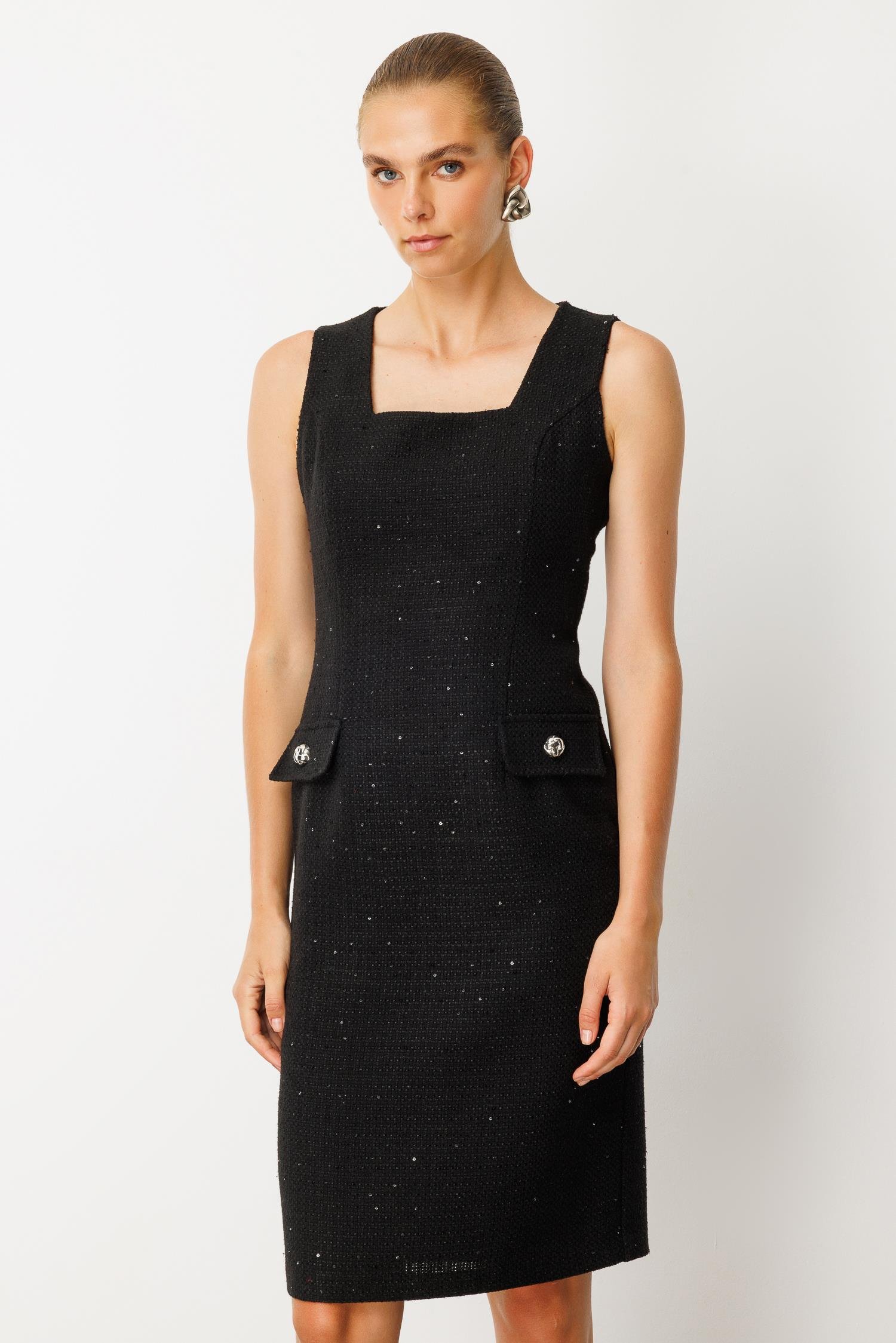 Modailgi U Yaka Kolsuz Yarım Kuplu Kapak Cep Detaylı Formlu Elbise – Siyah