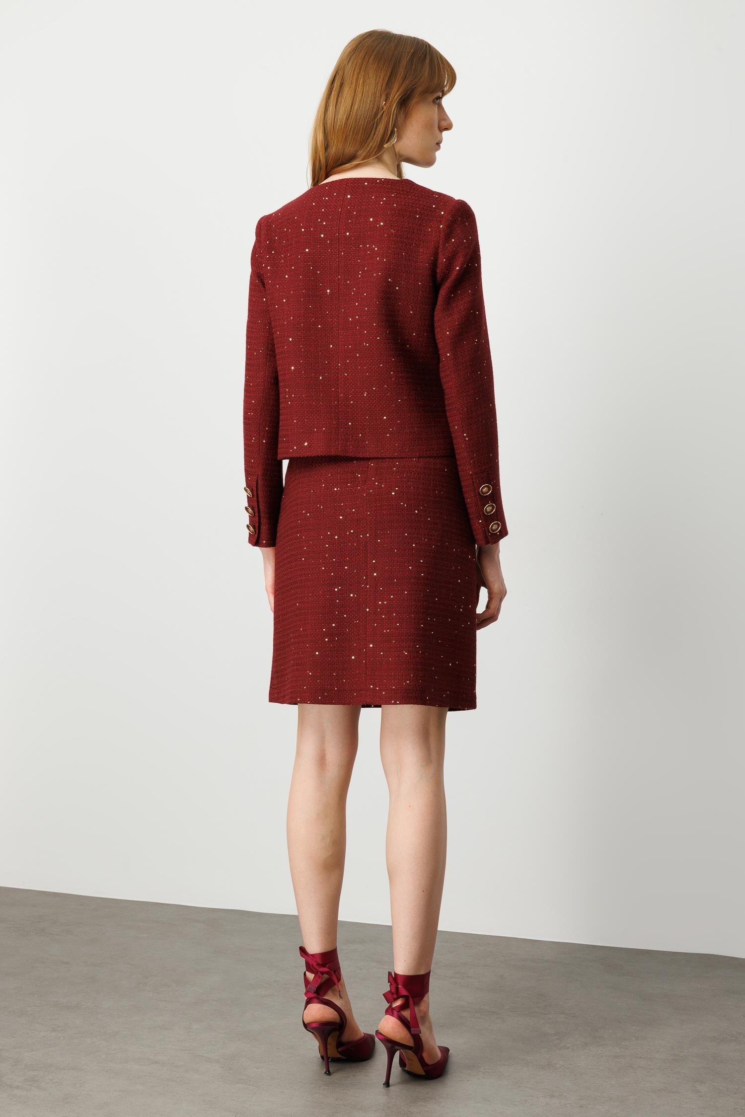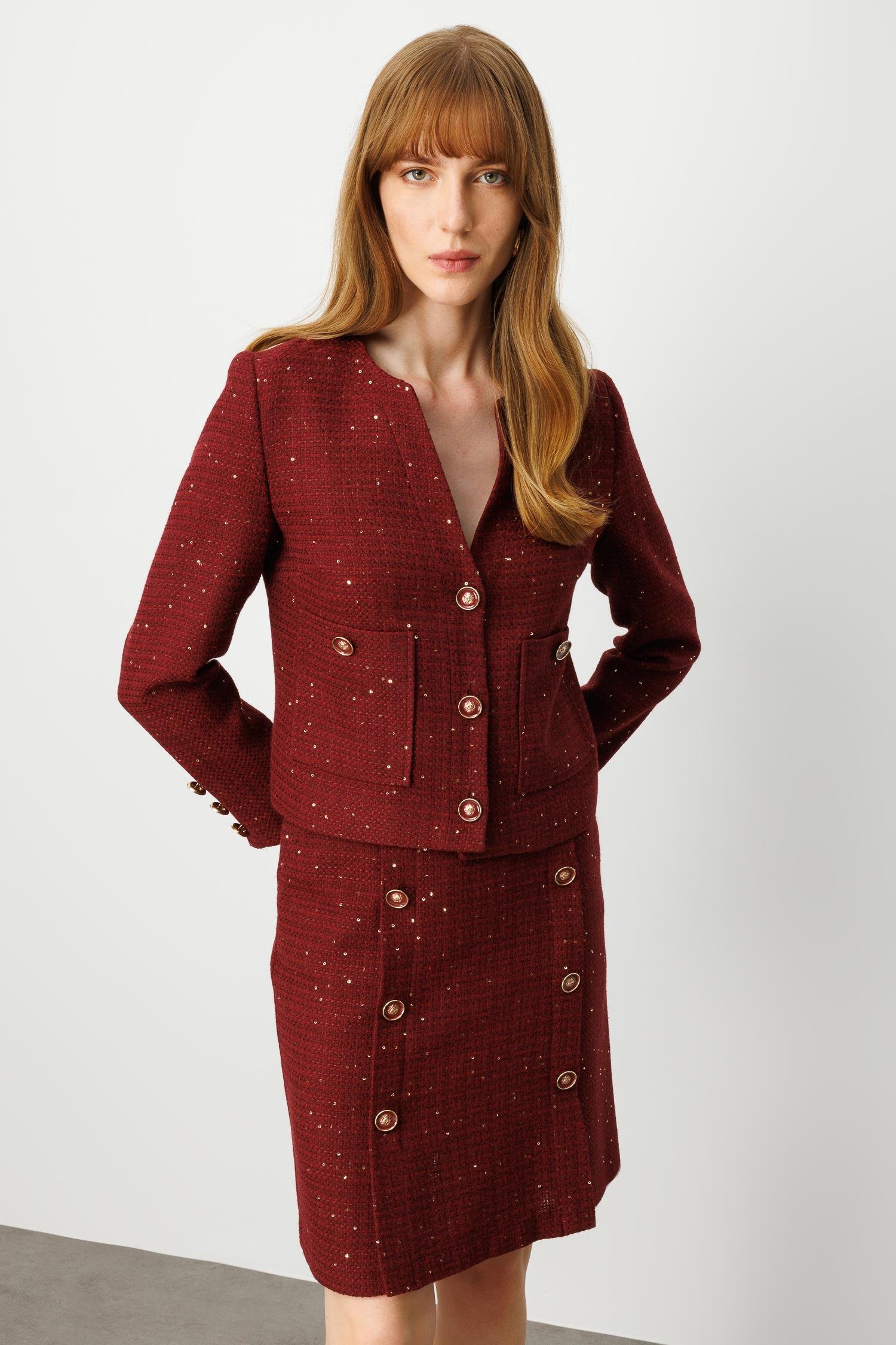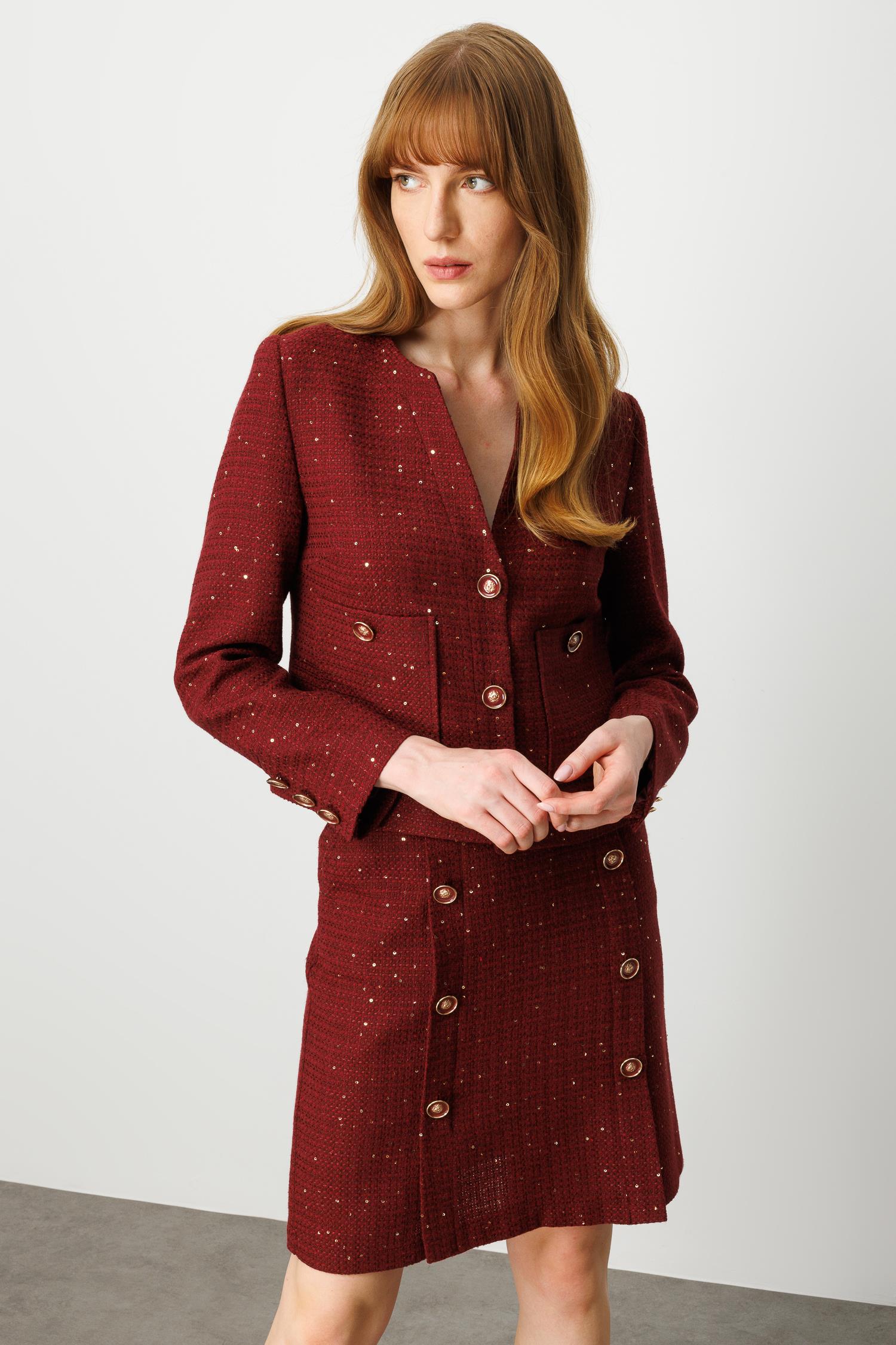 Klasik şıklığın modern bir yorumu olarak tasarlanan bu Modailgi ceket, tuvit dokunun zamansız asaletini yeniden tanımlıyor. Bordo rengin sıcak tonlarıyla güçlenen model, hem ofis stilinde hem özel davetlerde zarafet ve özgüveni bir araya getiriyor. Sofistike detaylar ve modern formuyla, Modailgi kadınının şehirli zarafetini en iyi şekilde yansıtıyor.