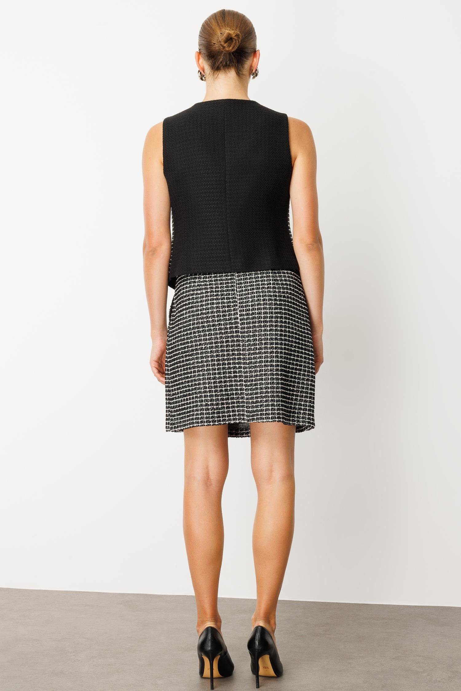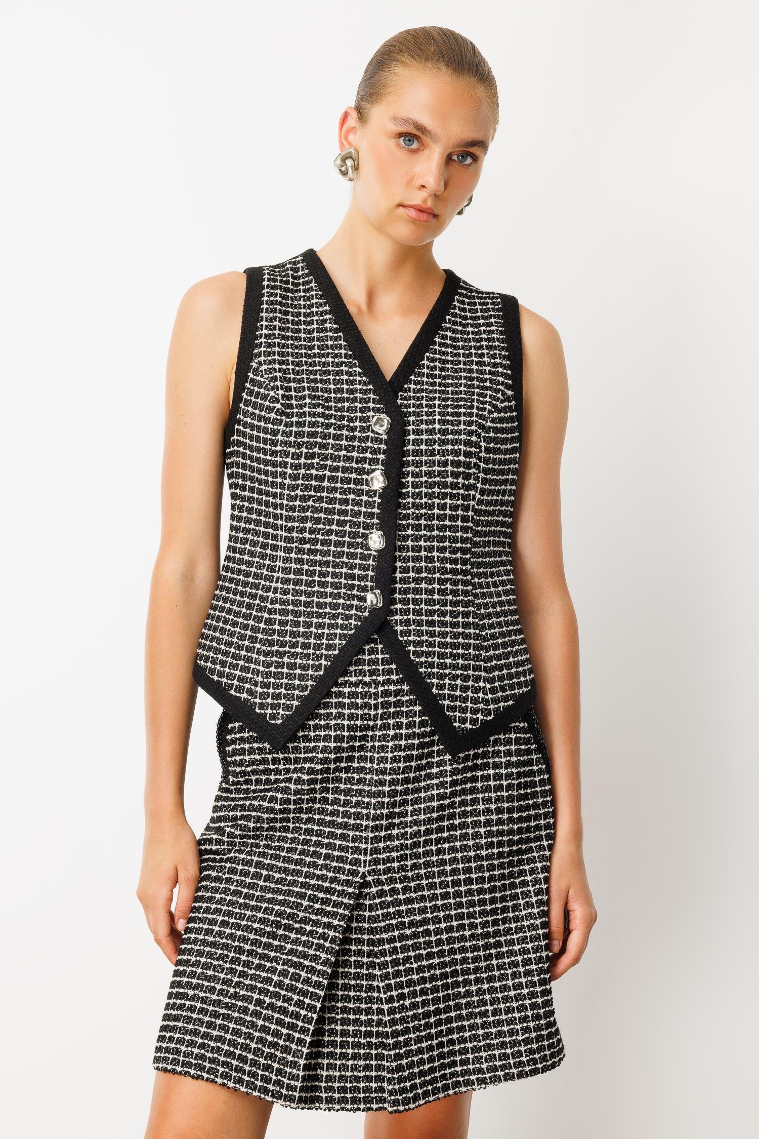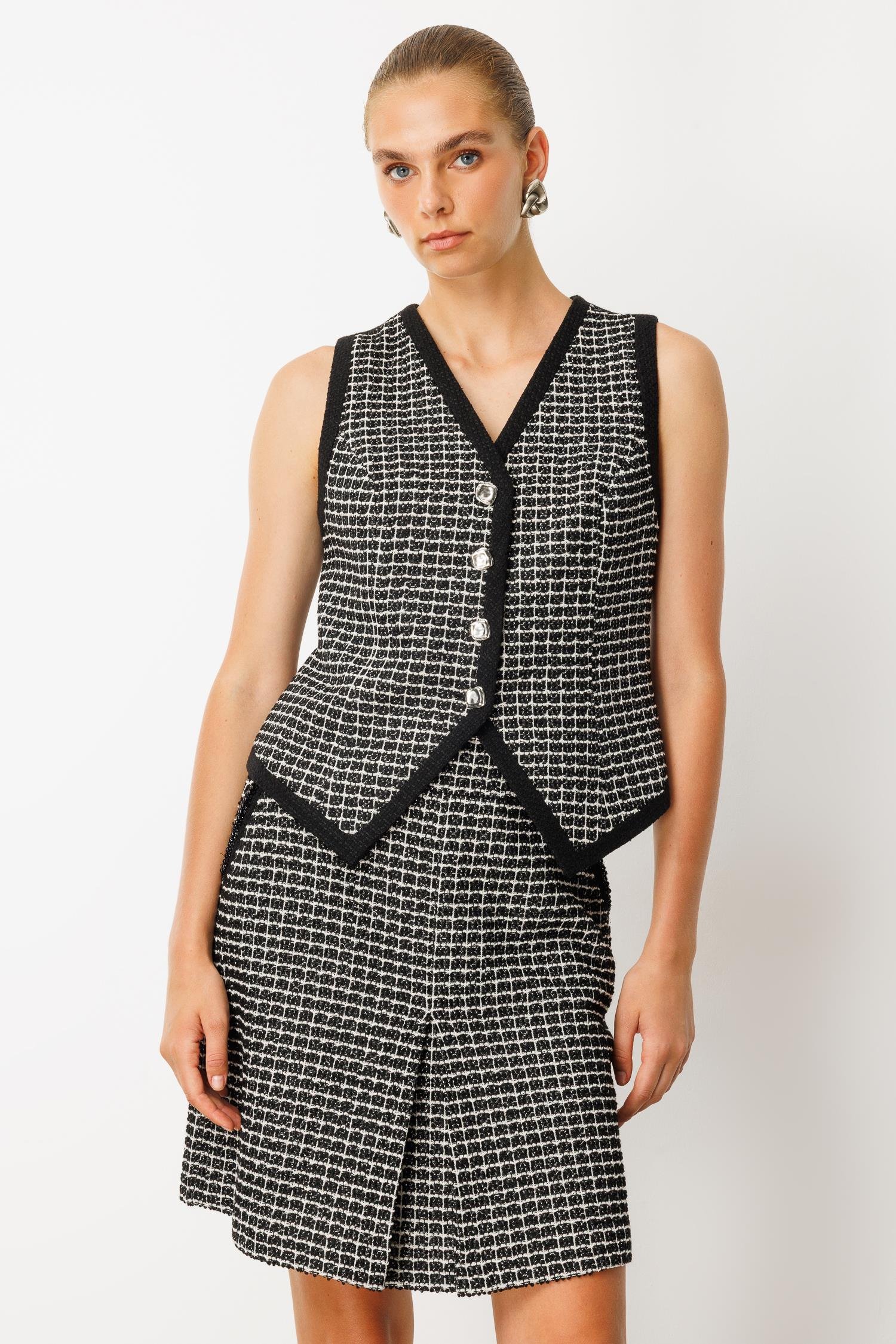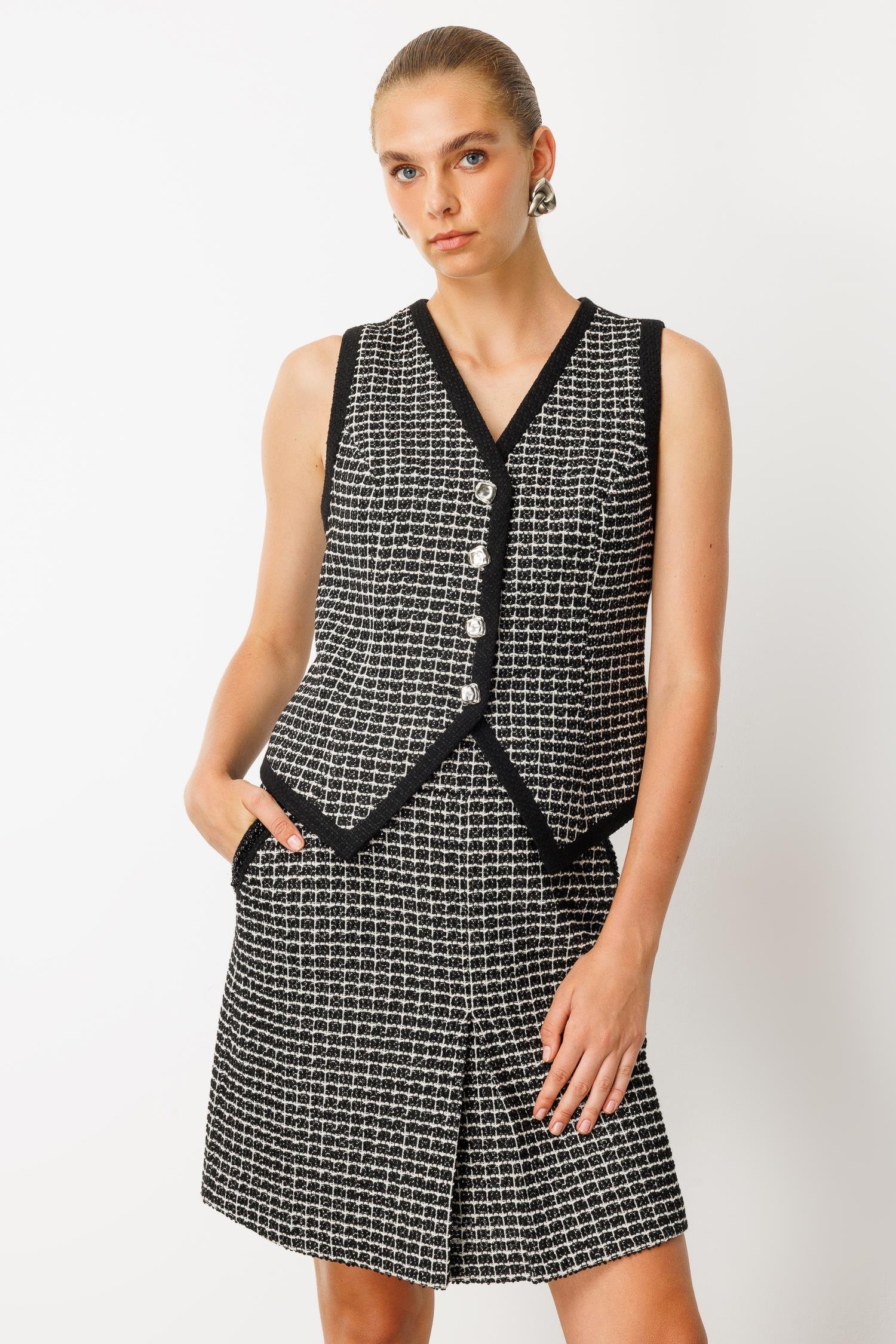 Modailgi’nin zamansız tuvit dokusunu modern kesimle buluşturduğu bu yelek, klasik zarafetin güçlü bir yorumudur. Siyahın asaleti ve geometrik çizgilerin dengesiyle oluşturulan tasarım, şehirli kadının güçlü duruşunu yansıtır. Hem takım kombinlerinde hem tek parça olarak kullanılabilen bu yelek, her adımda sofistike bir stilin anahtarını taşır.