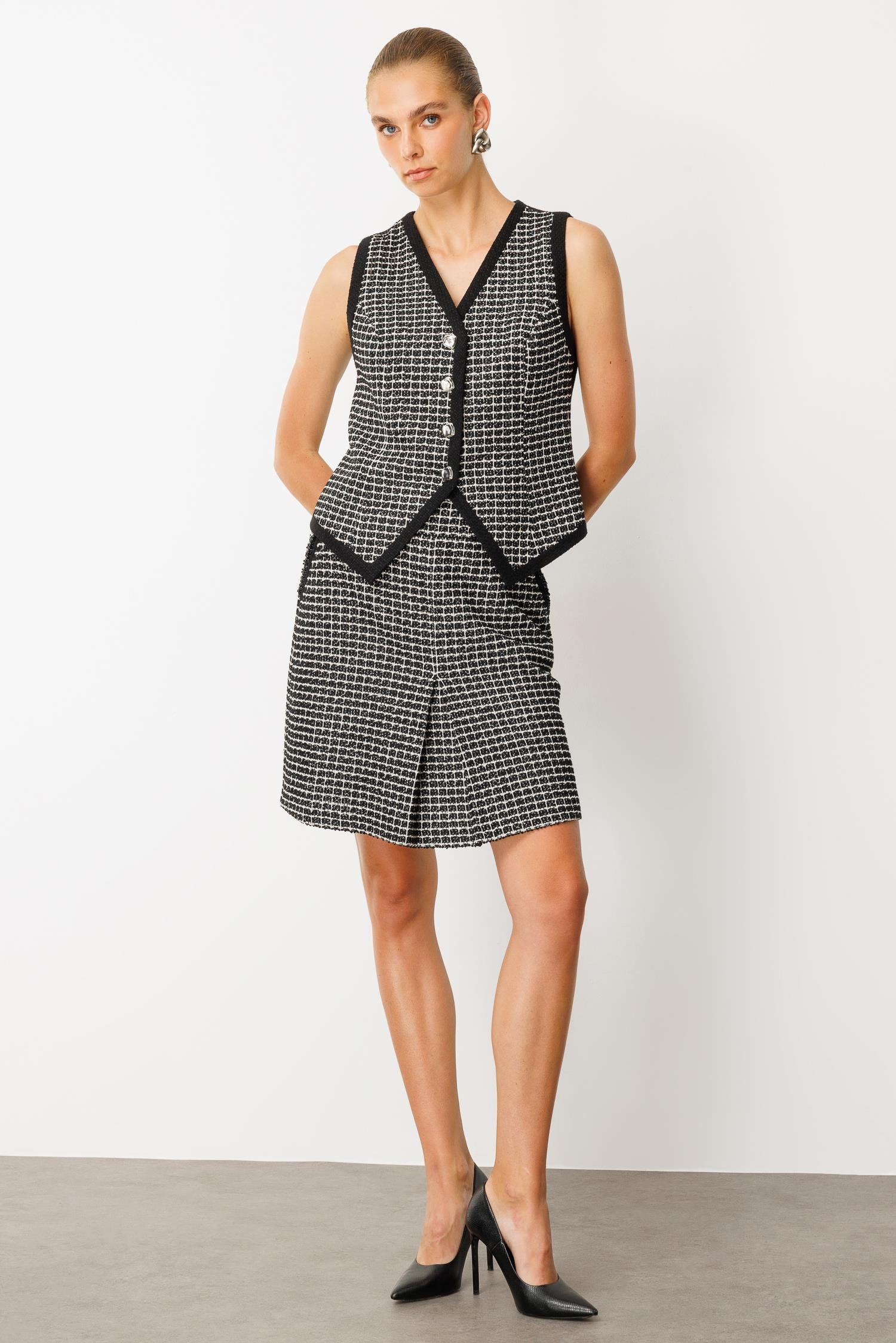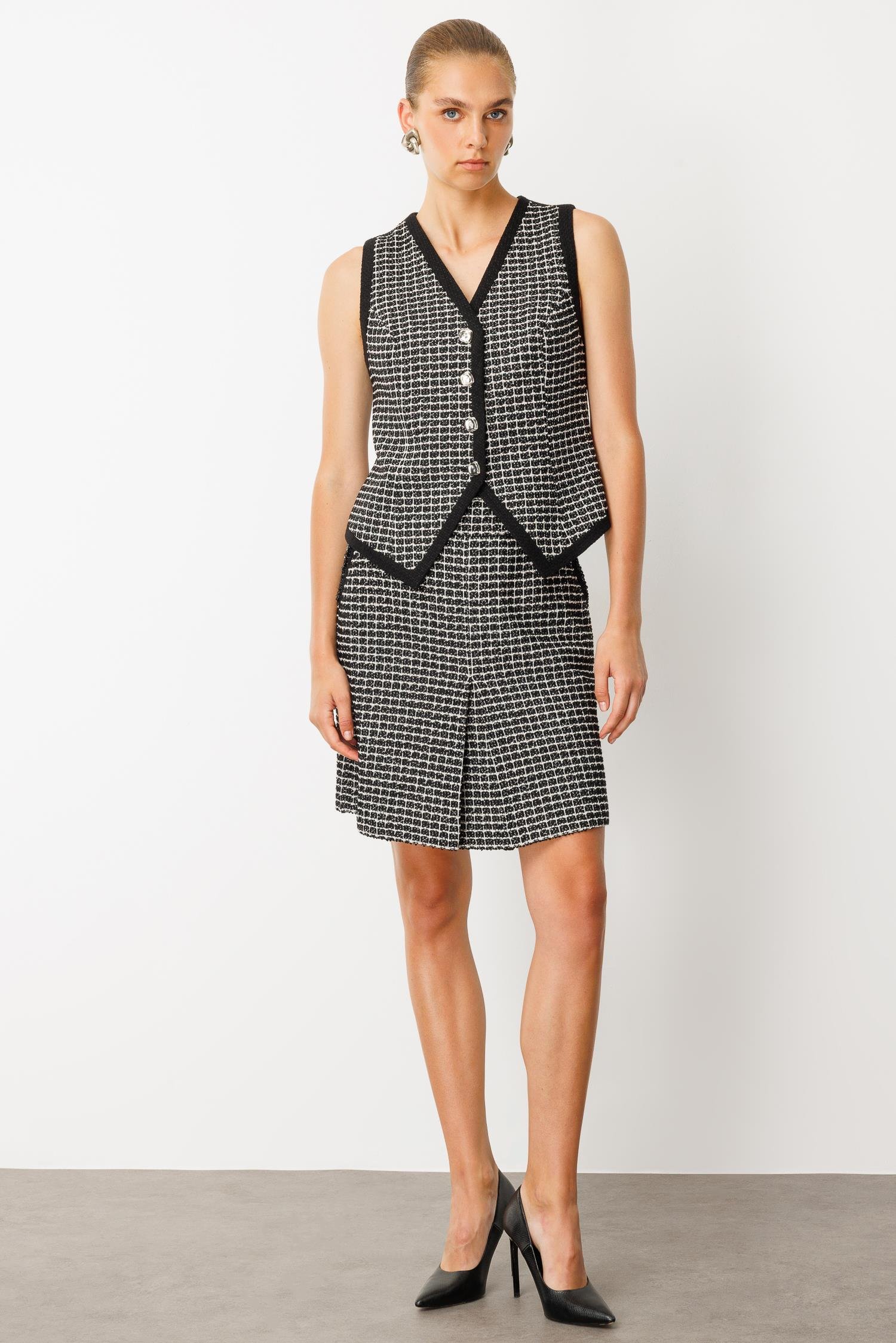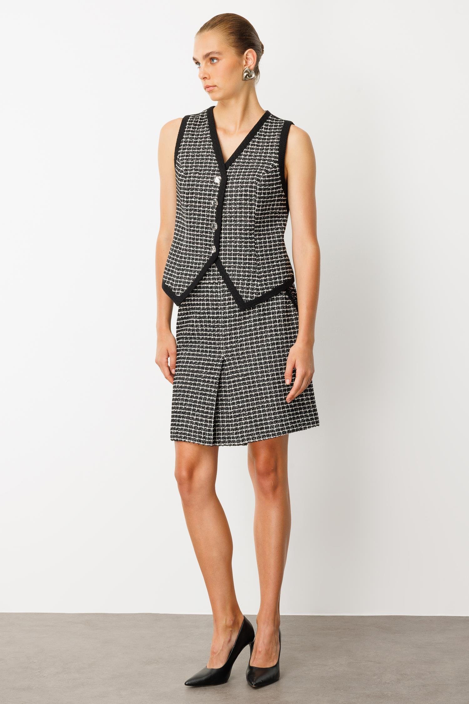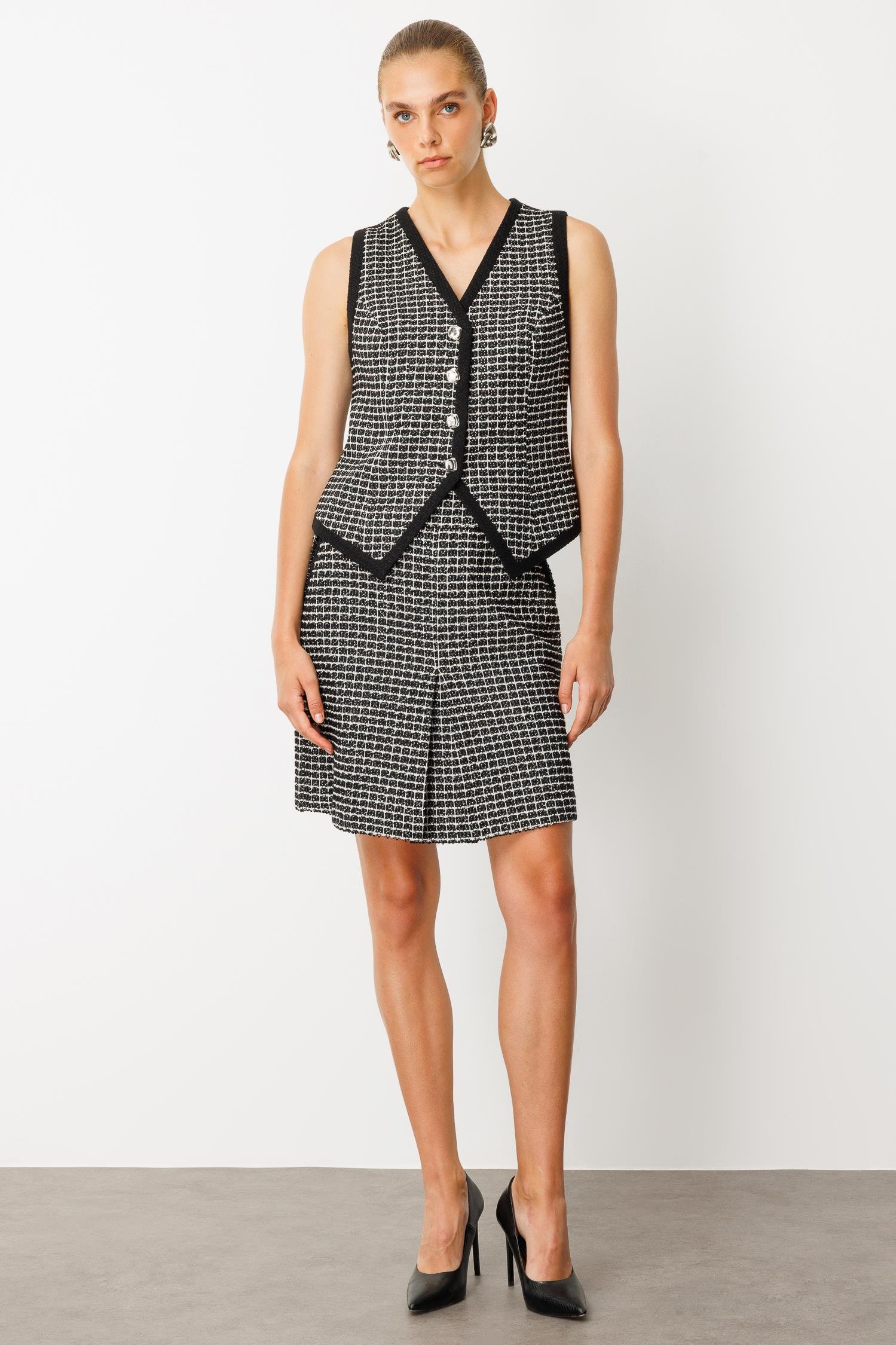 Modailgi V Yaka Enküstre Detaylı Ön Beden Simetrik Kesim Kısa Tuvit Yelek - Siyah