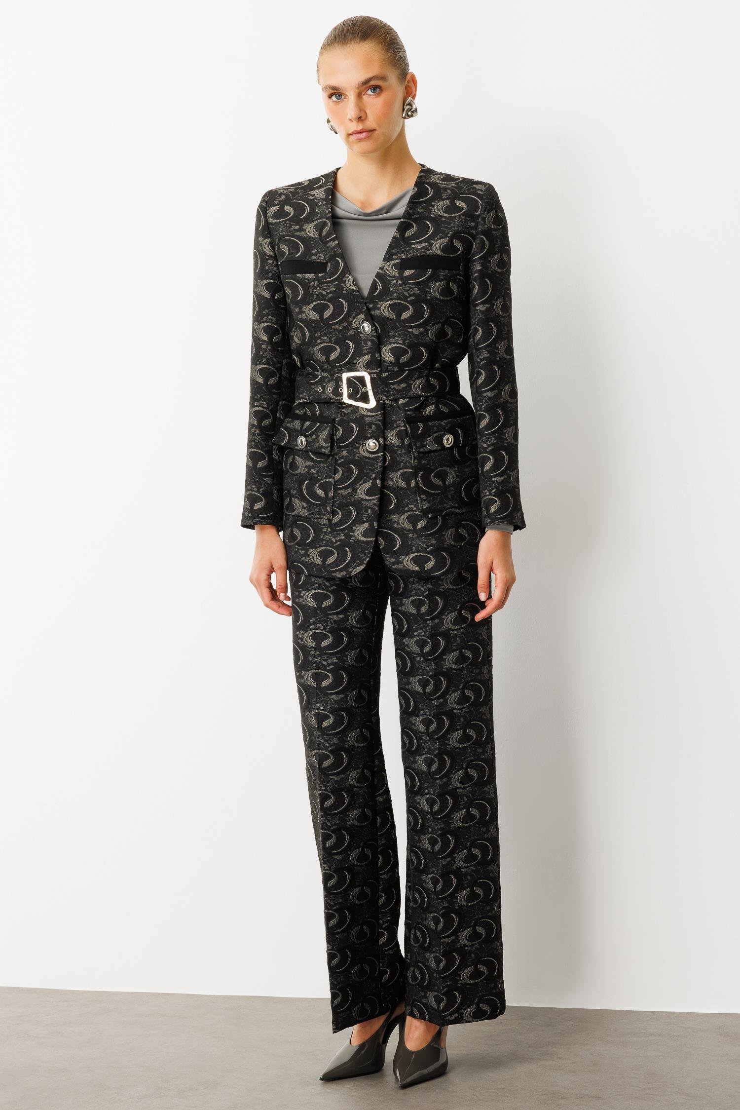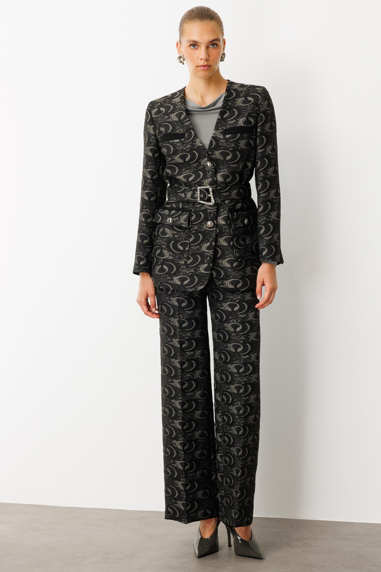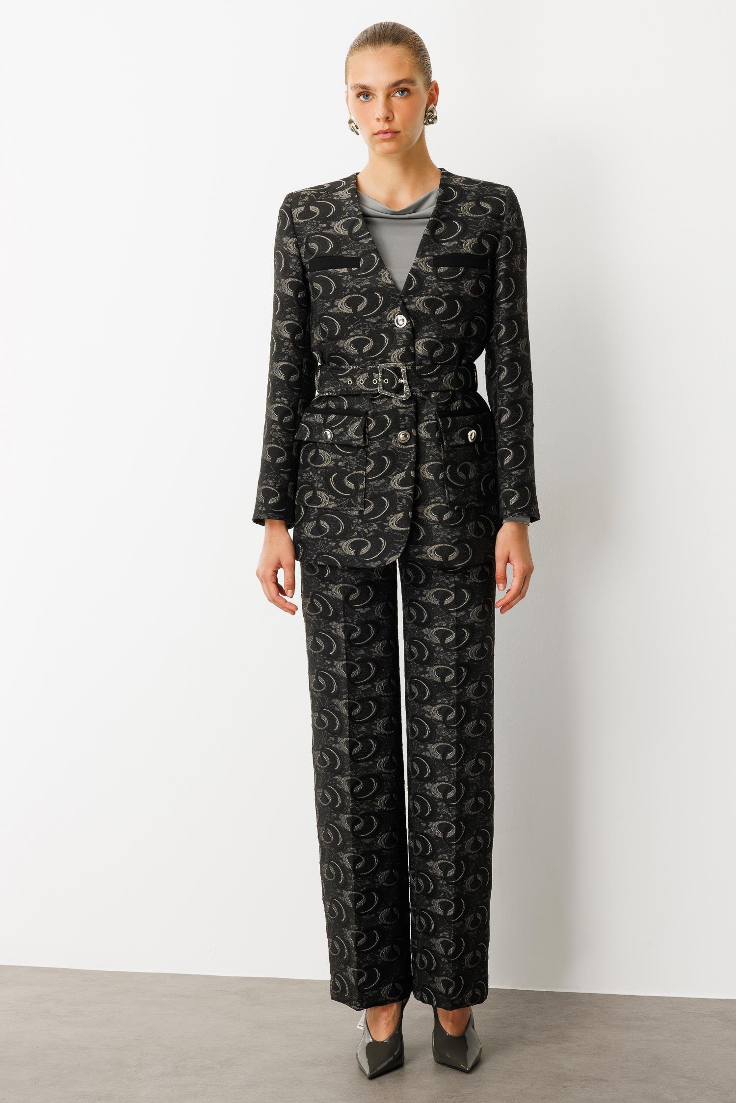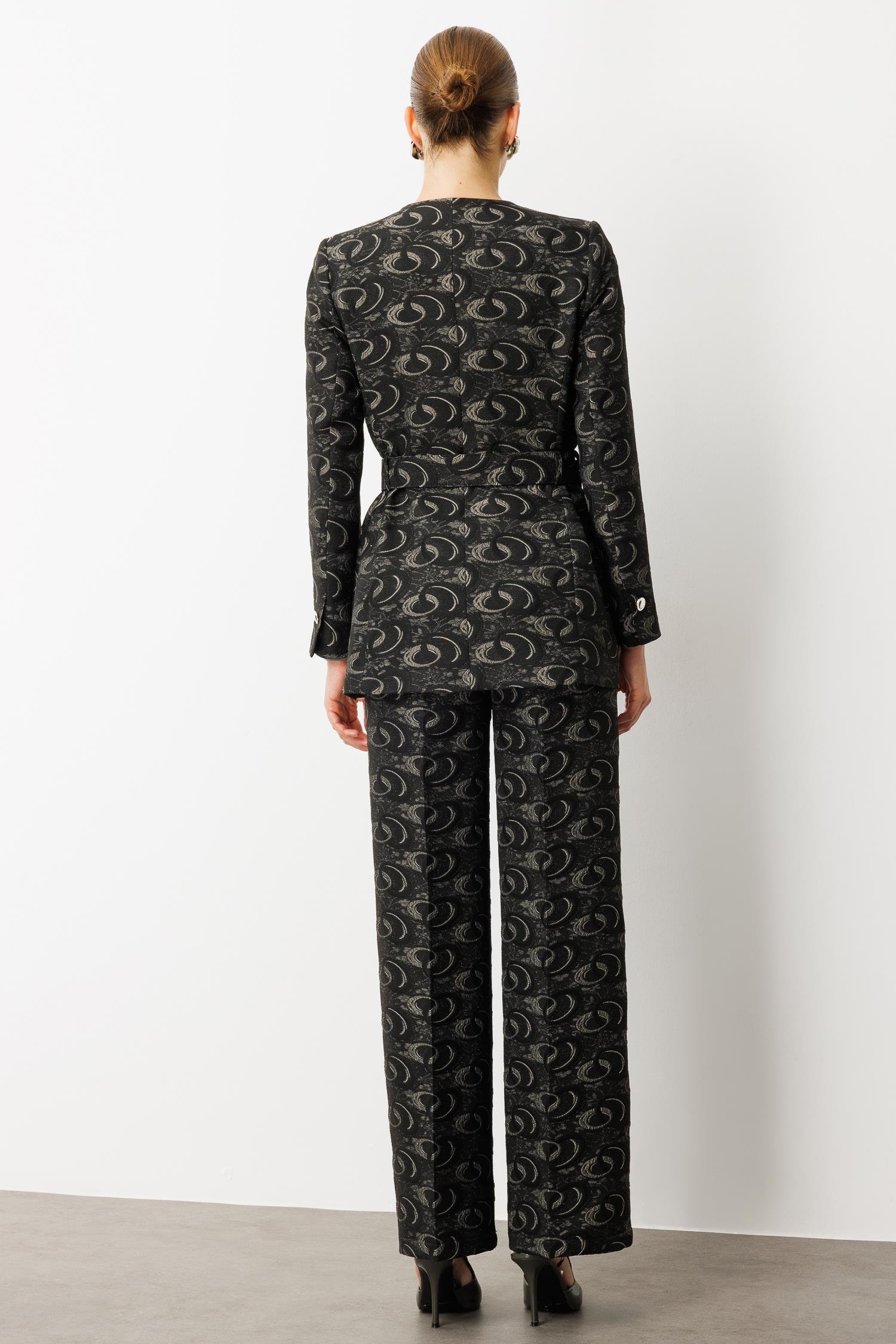 • Model: V yaka, kuşak kemerli, düz kesim jakar ceket