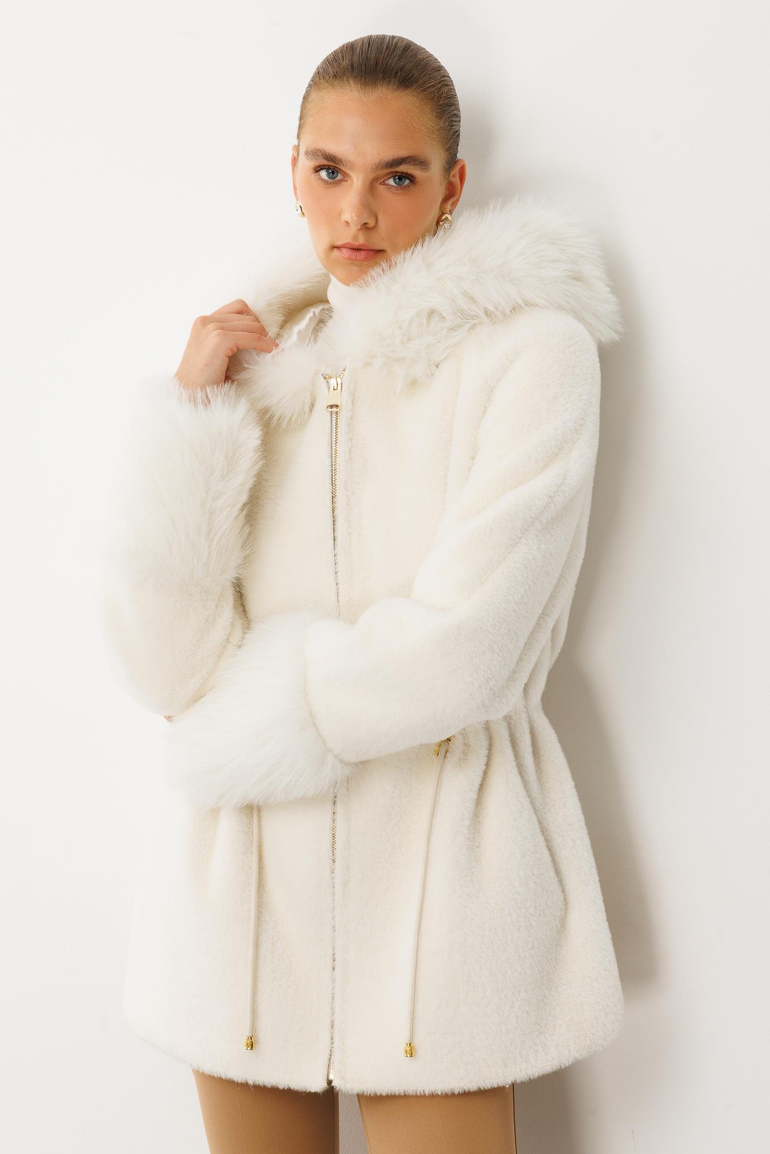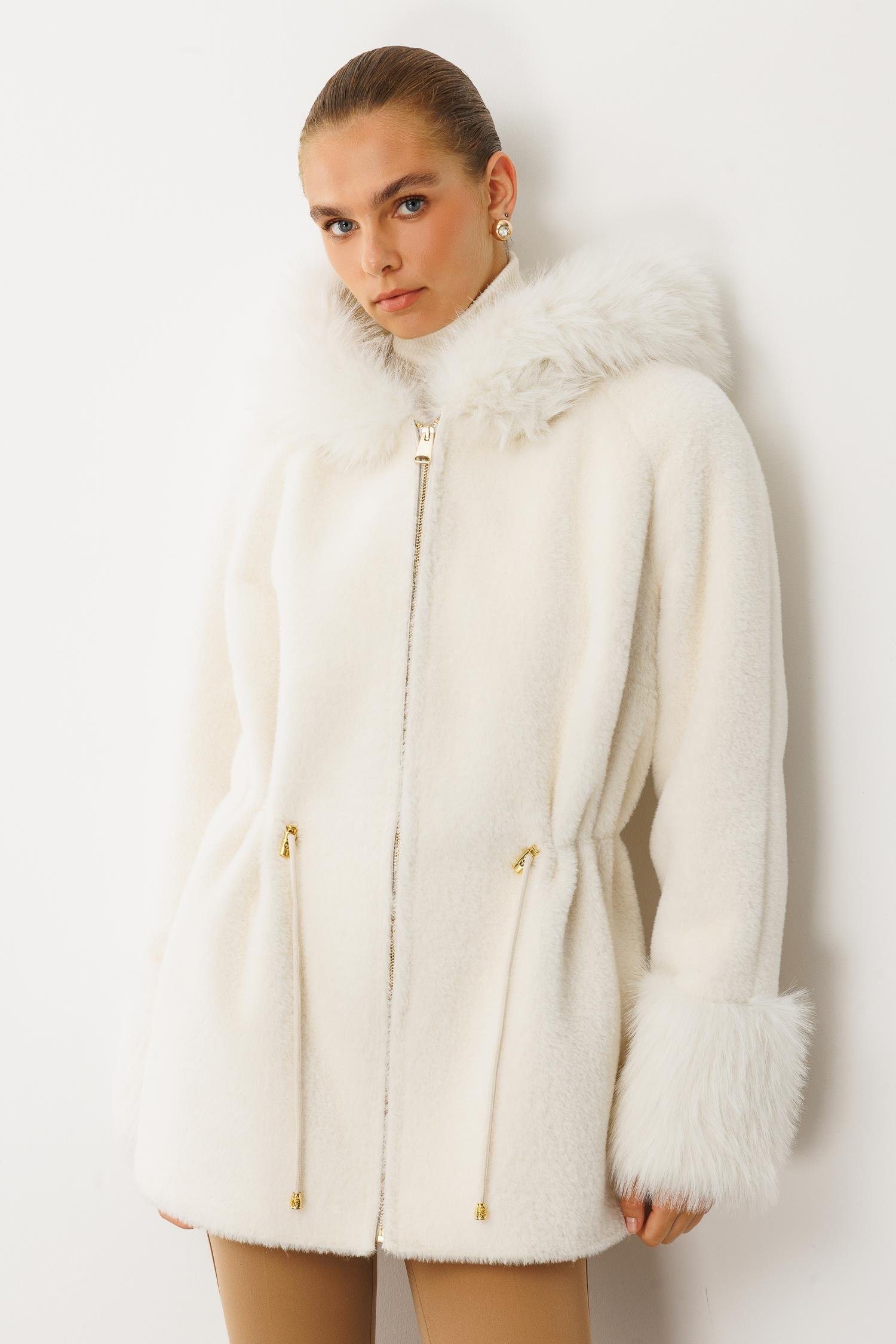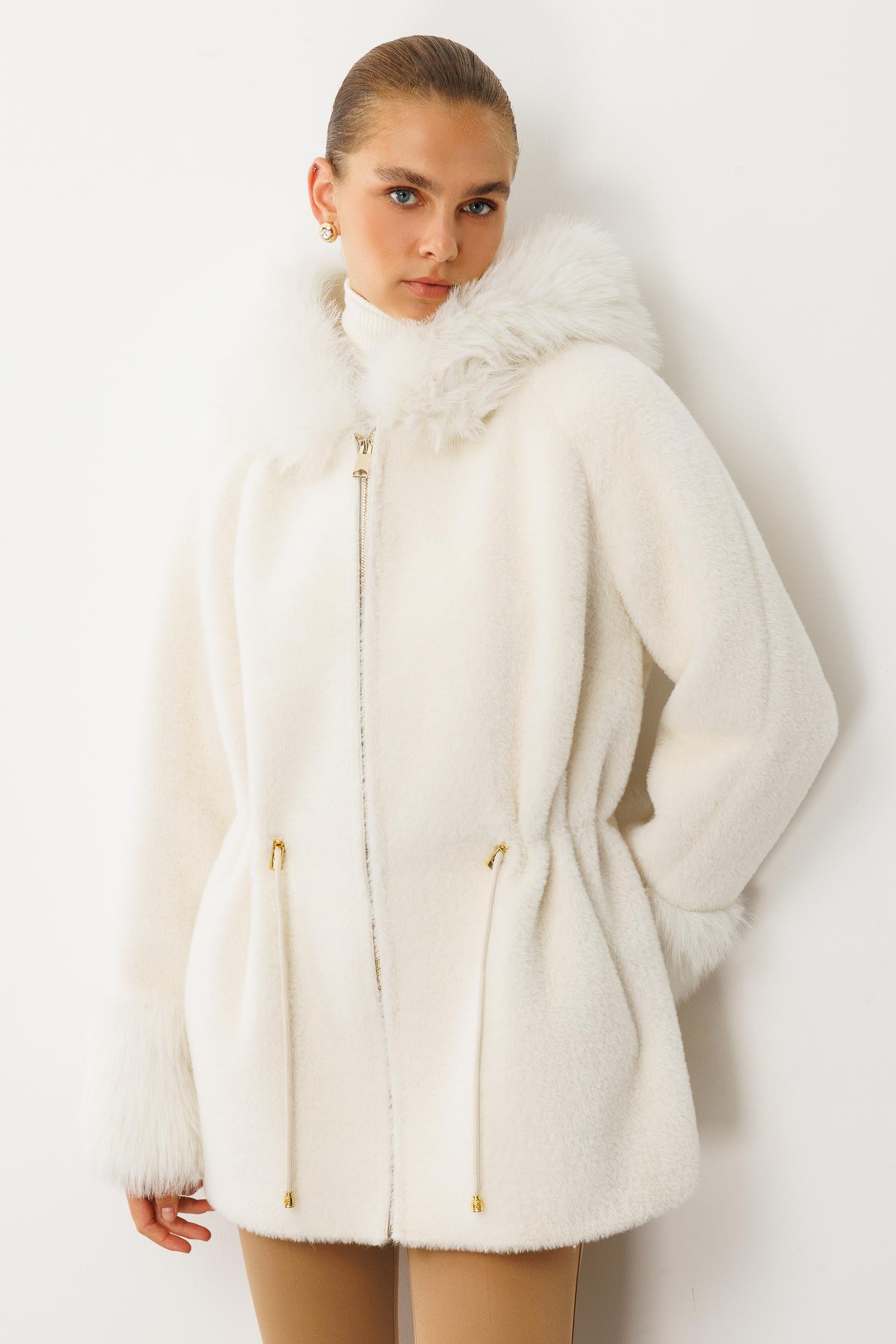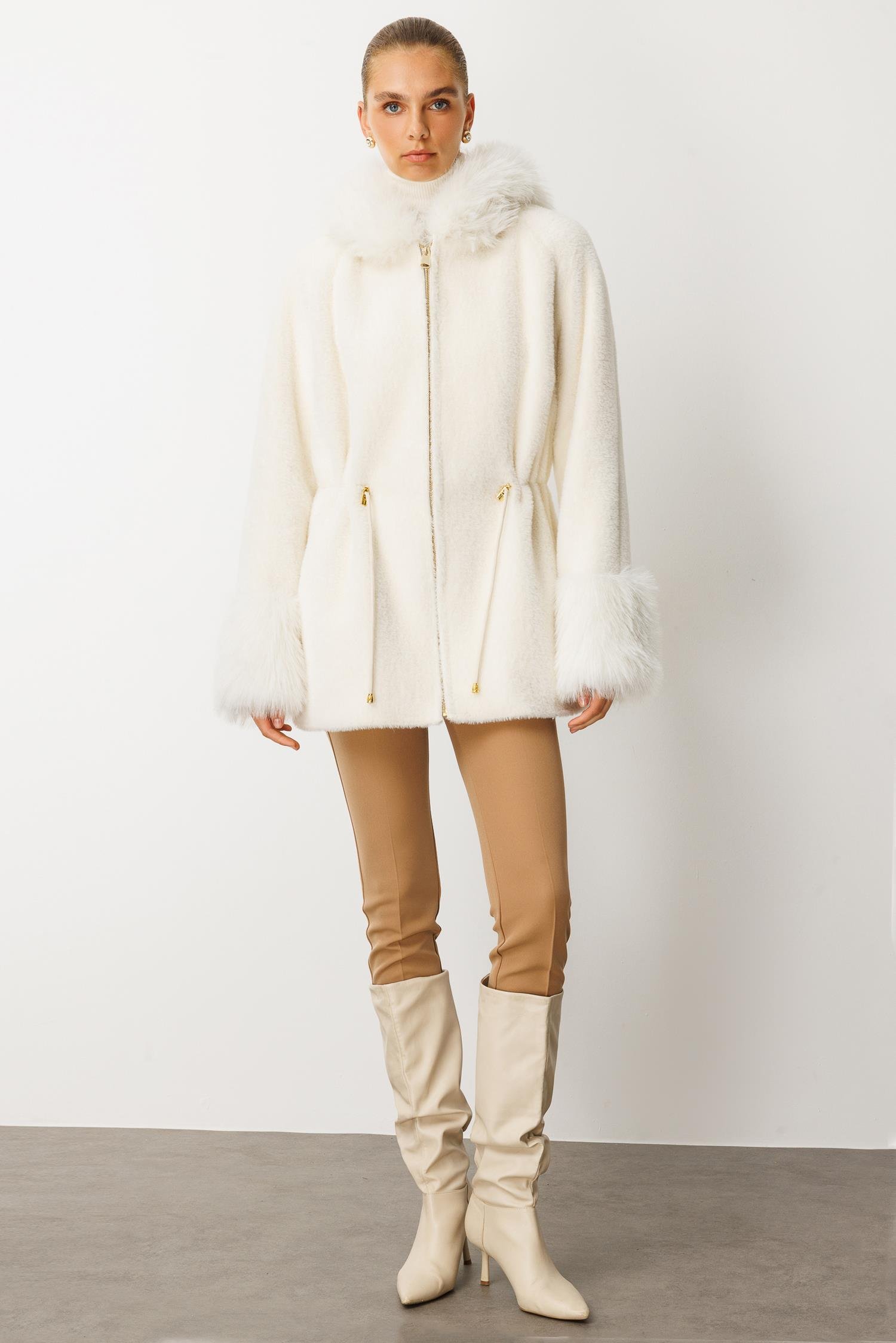 Modailgi Yaka ve Kol Manşeti Kürklü Fermuarlı Alcantara Kaban - Ekru