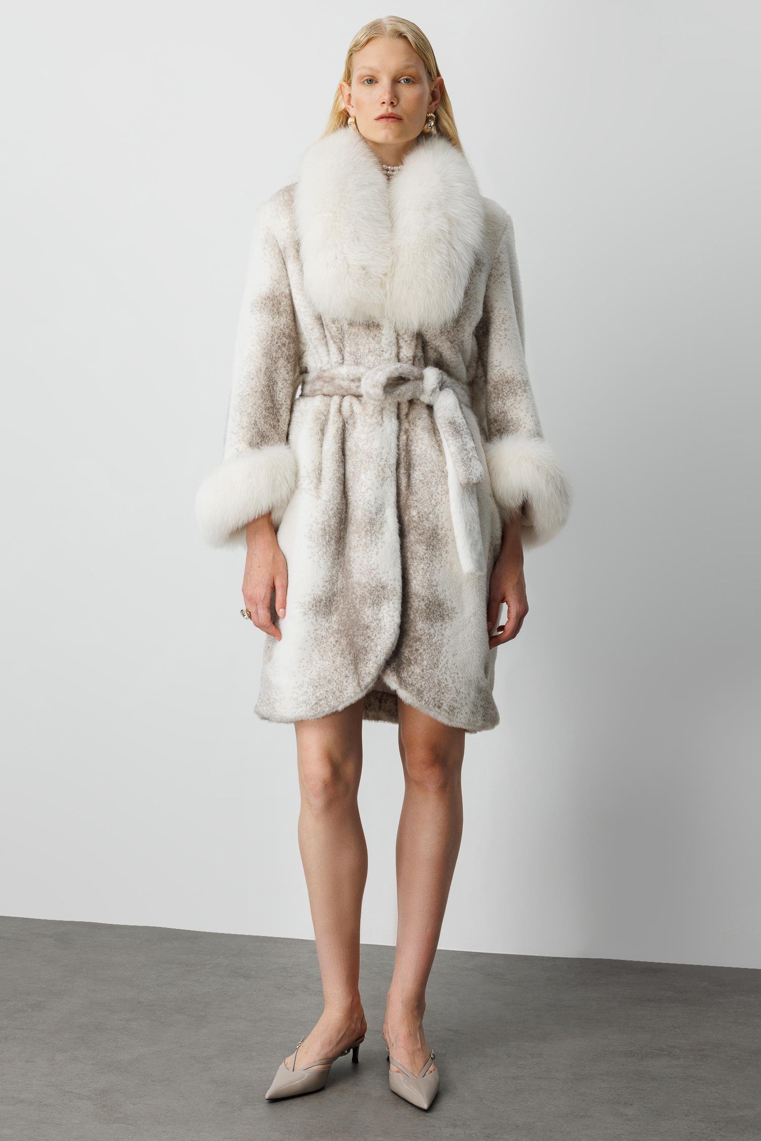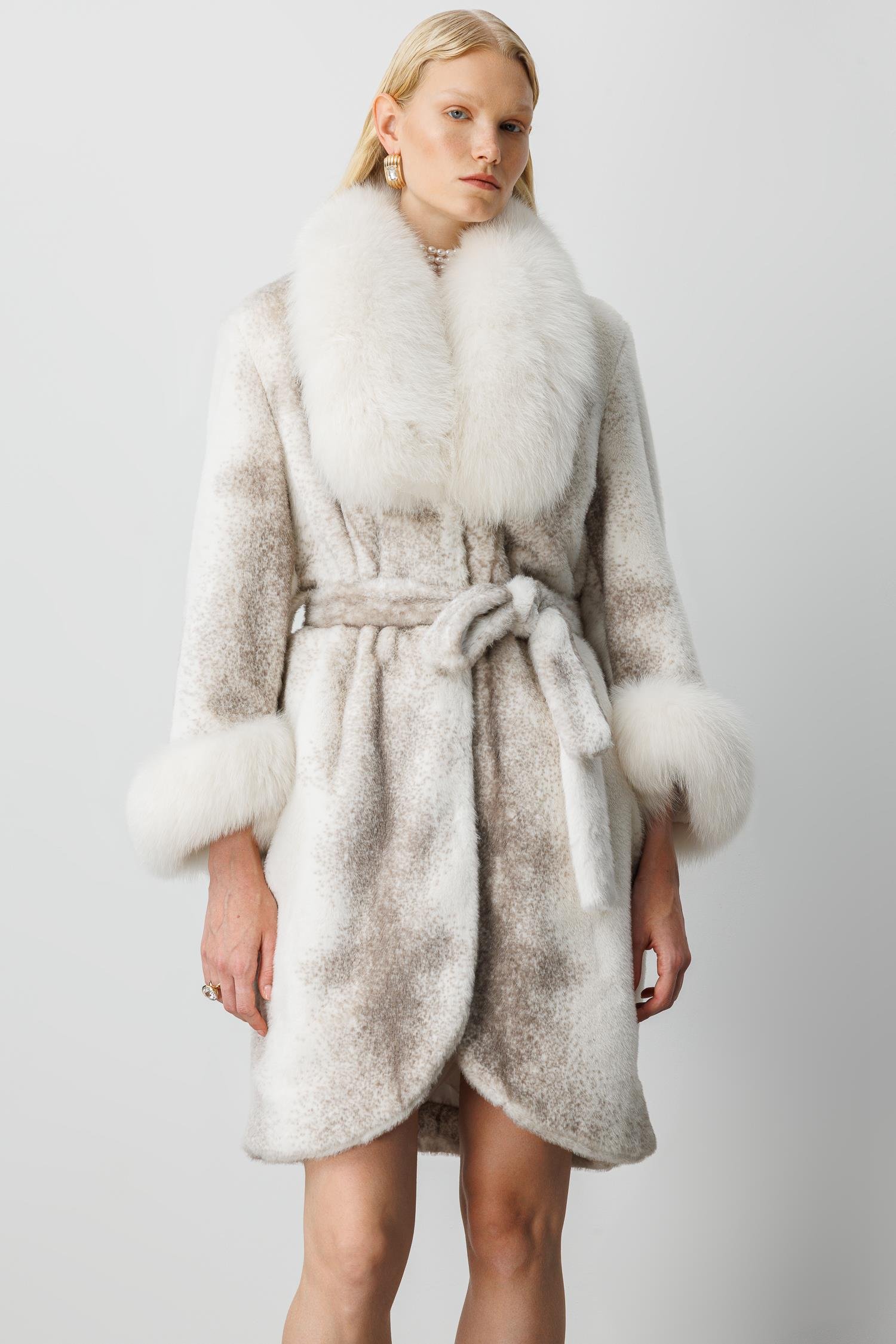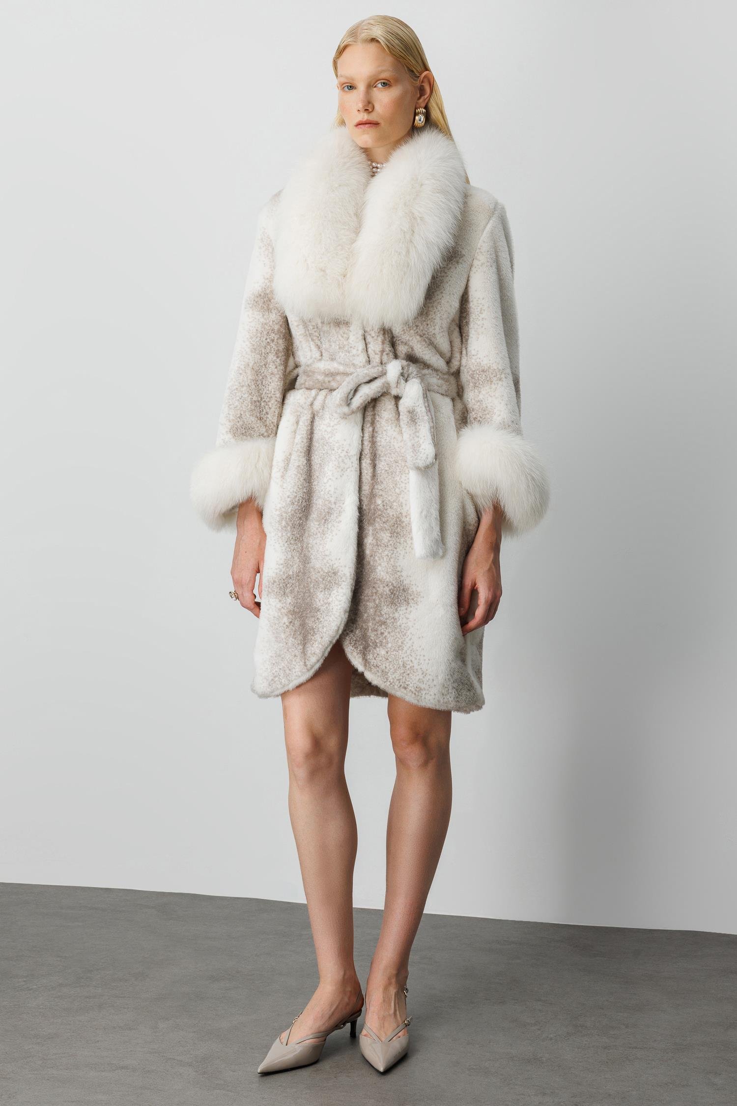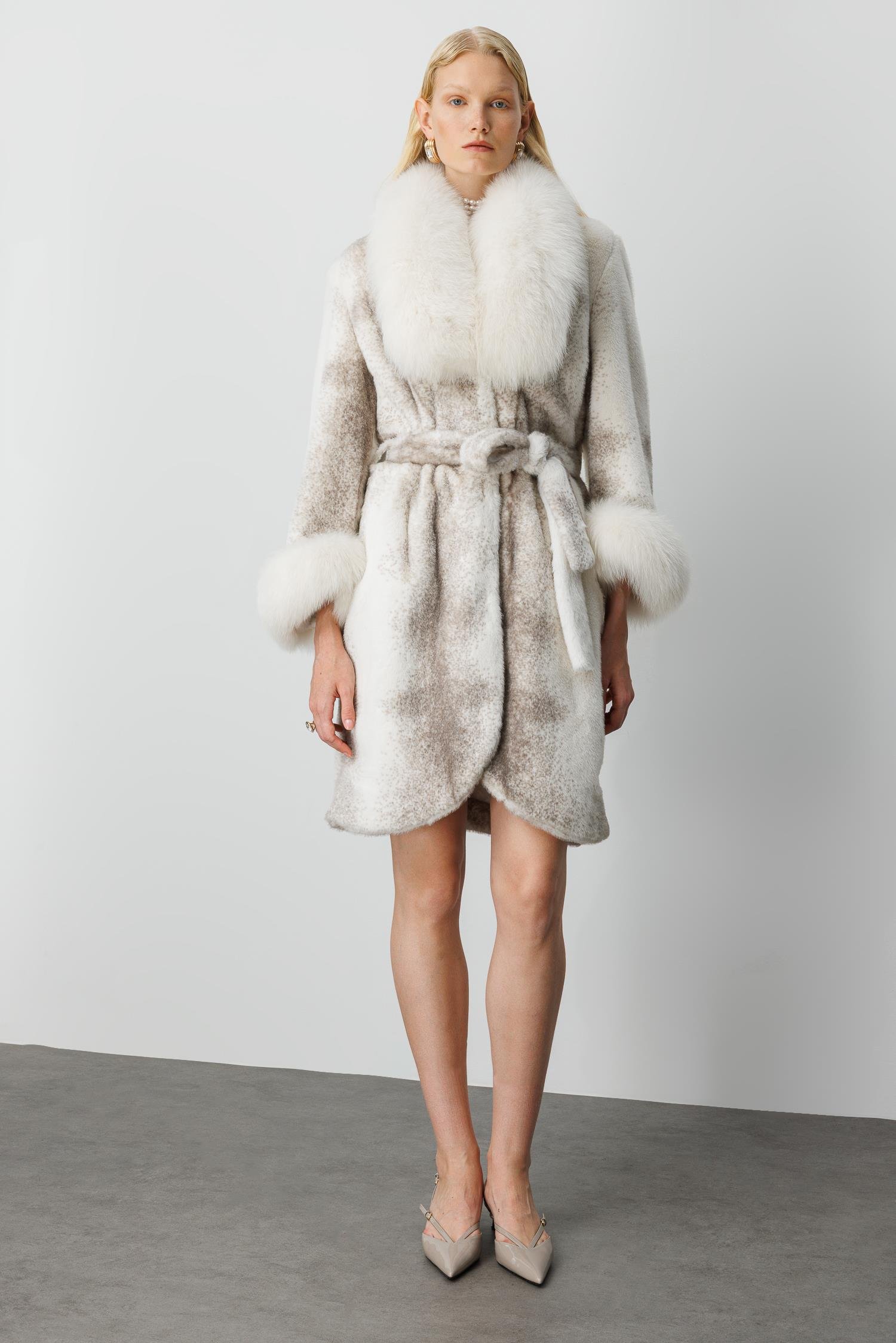 Modailgi Yaka ve Kol Manşeti Kürklü Desenli Alcantara Kaban - Ekru