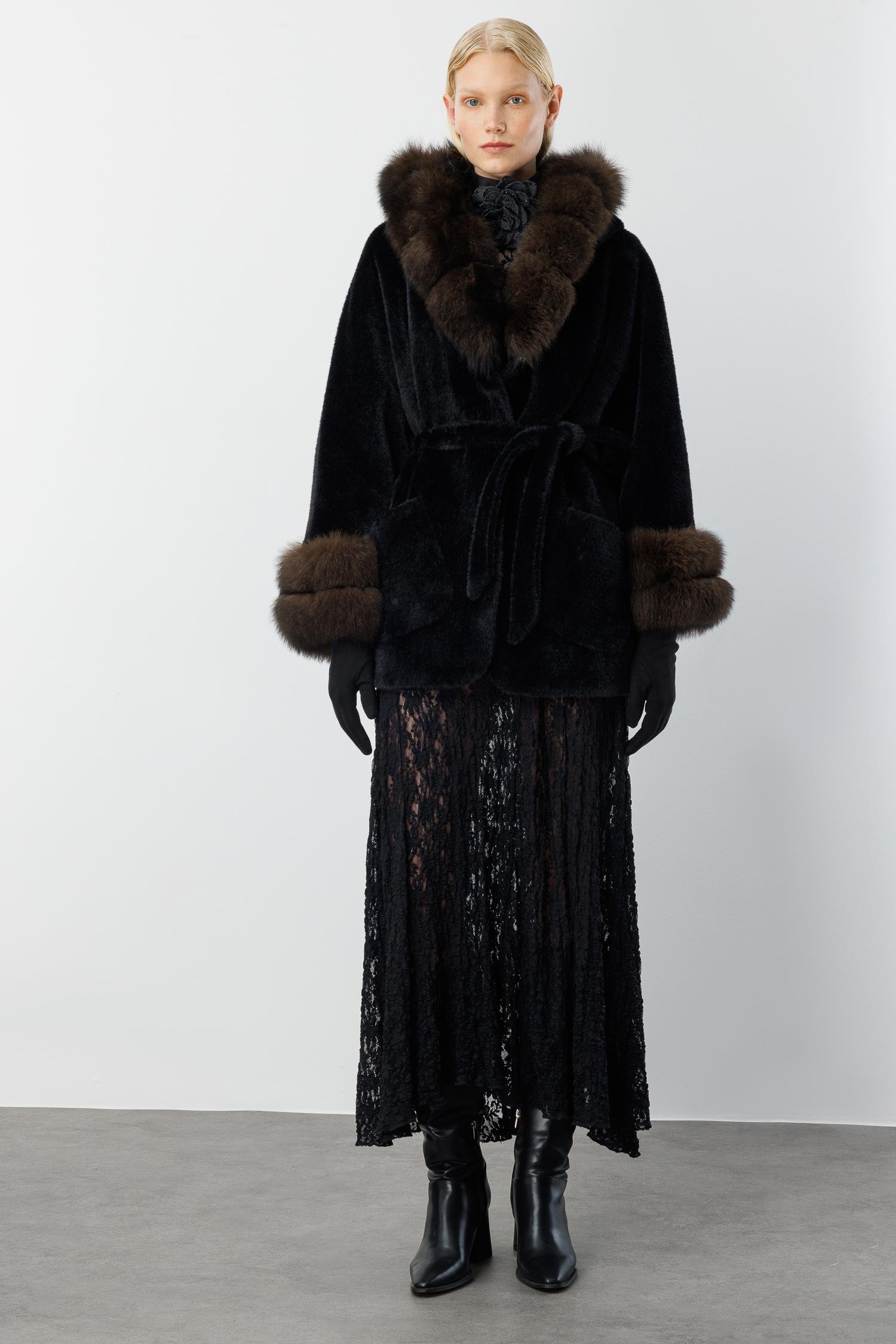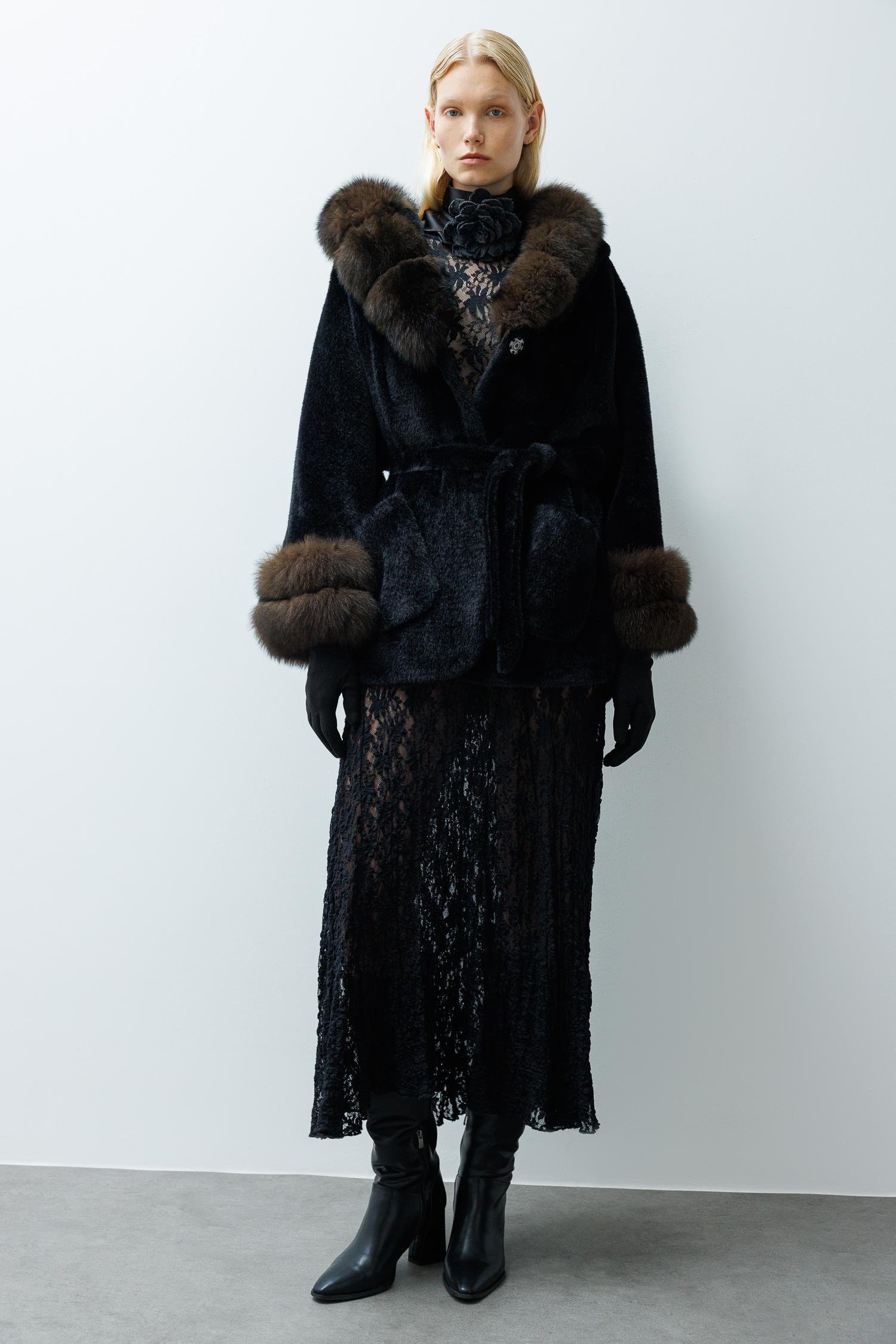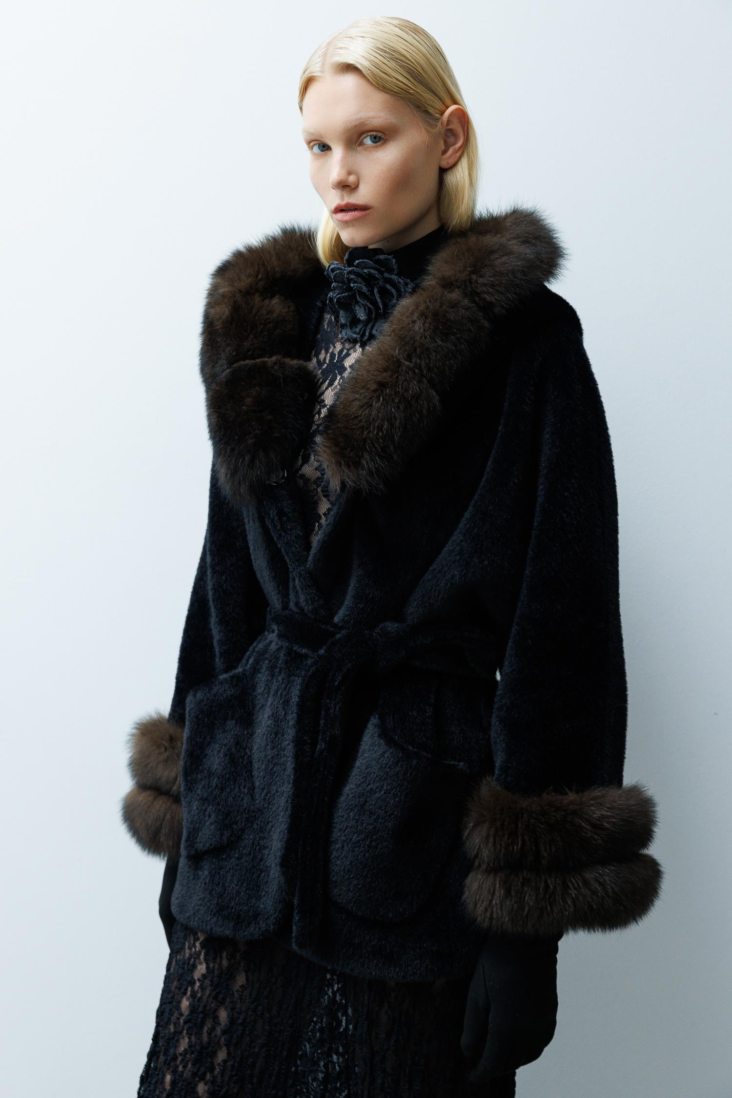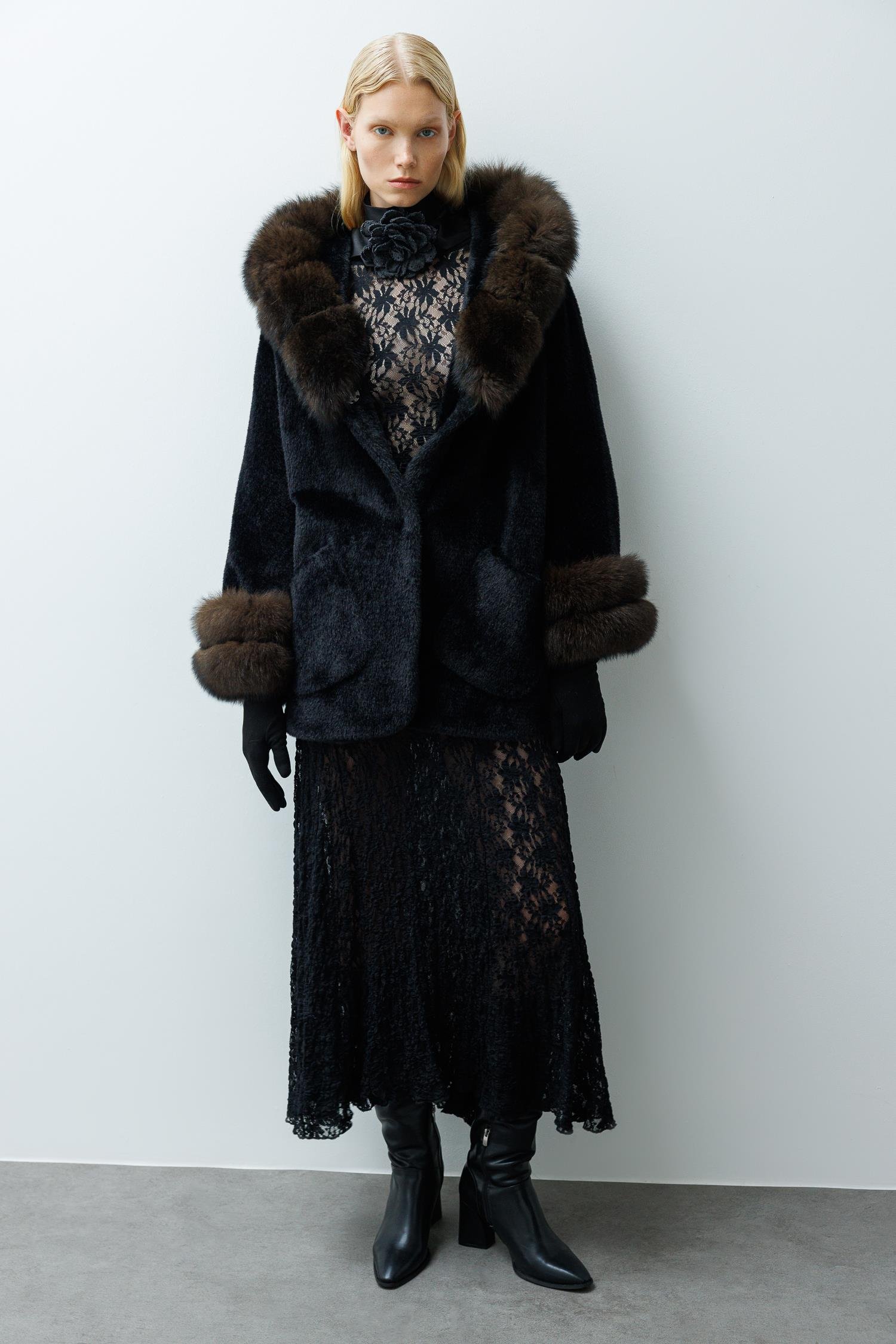 Yaka ve kol manşetlerinde hacimli kürk detayları