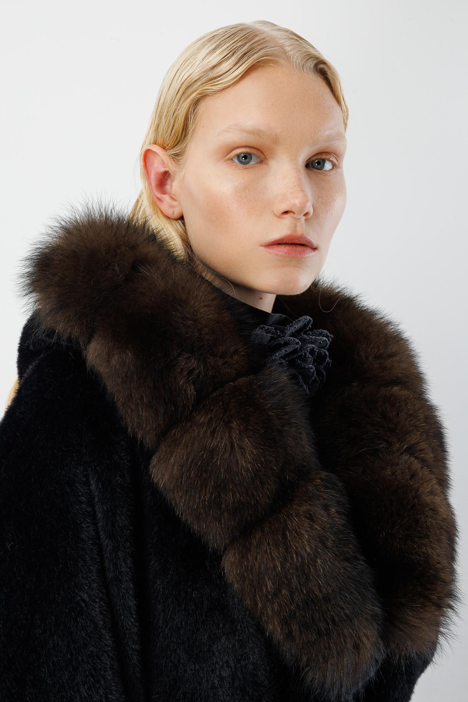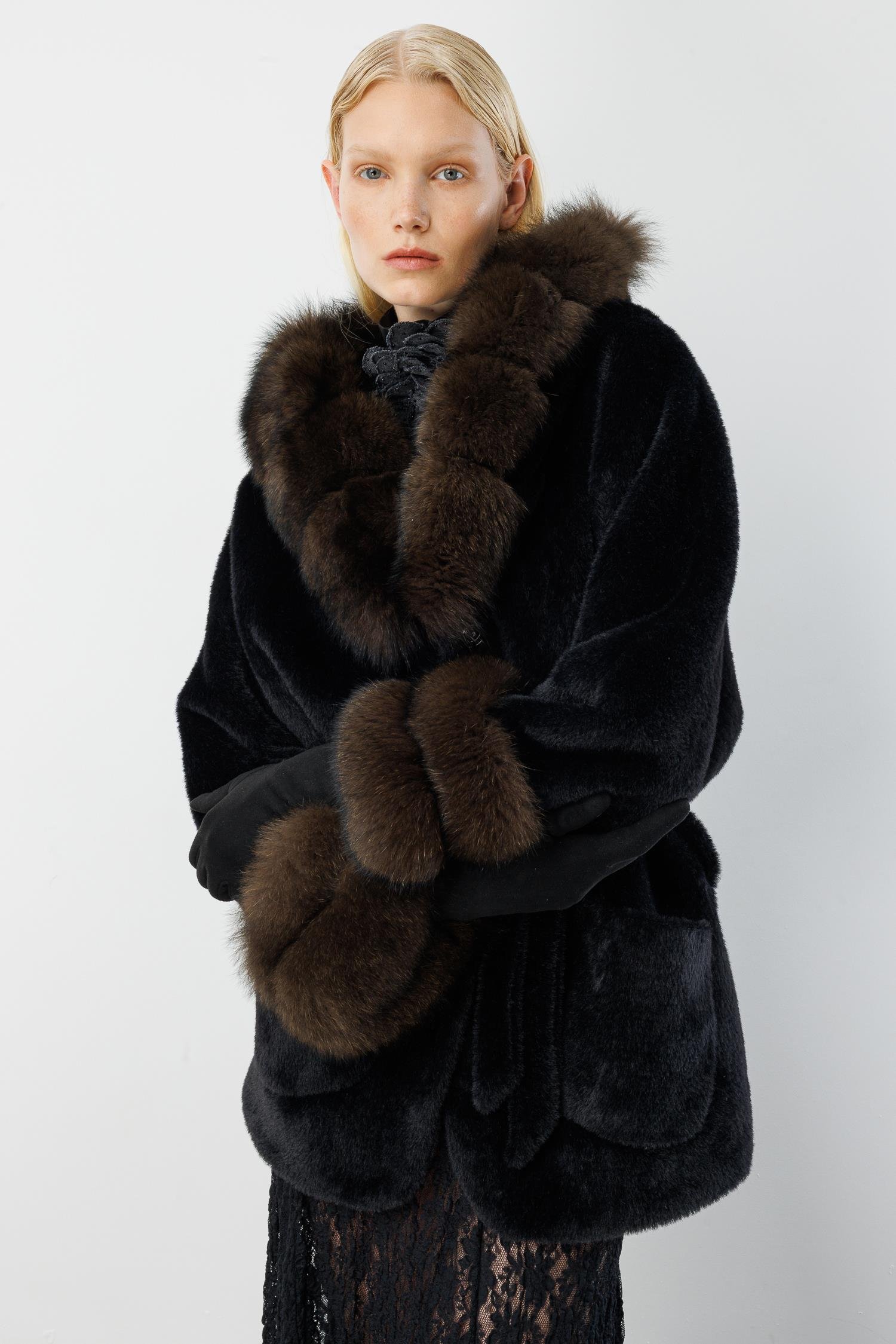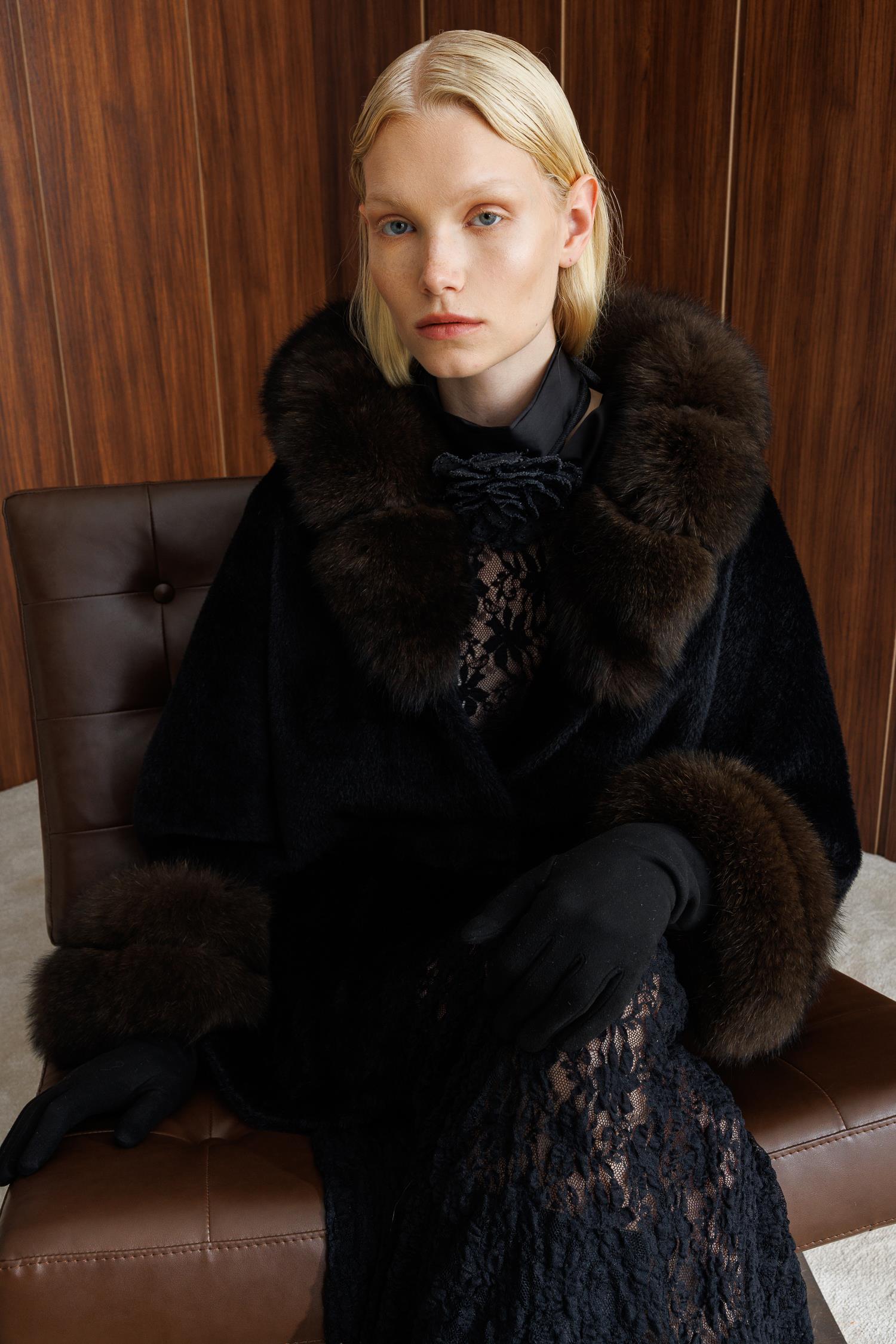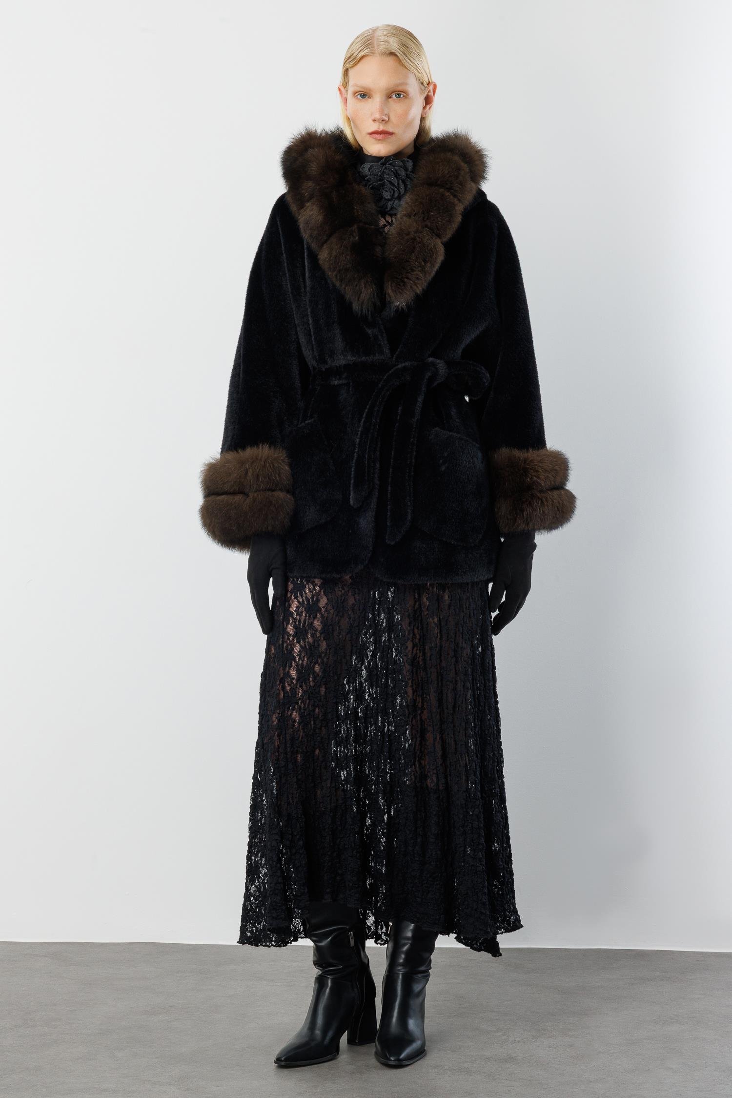Yaka ve kol manşetlerinde hacimli kürk detayları