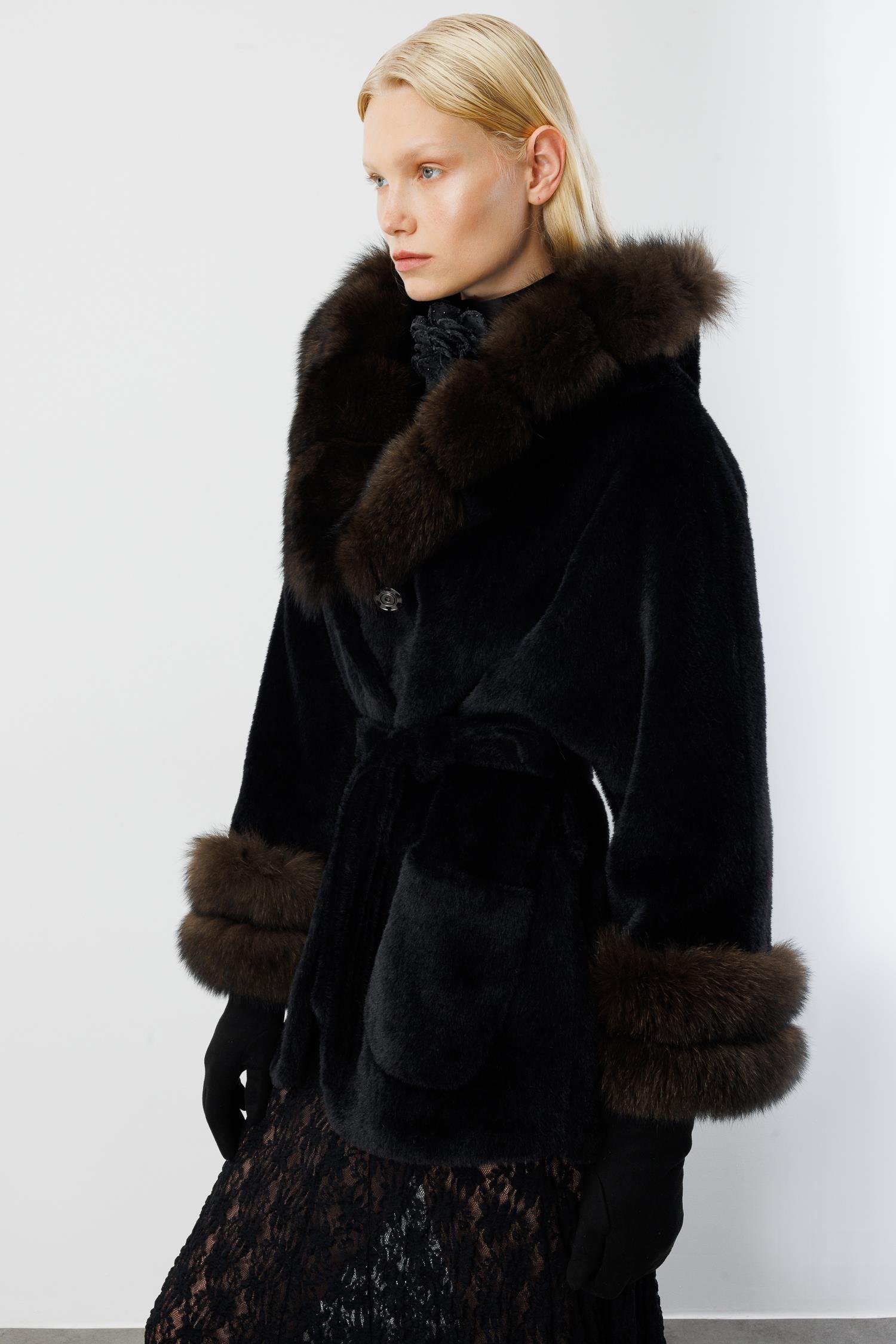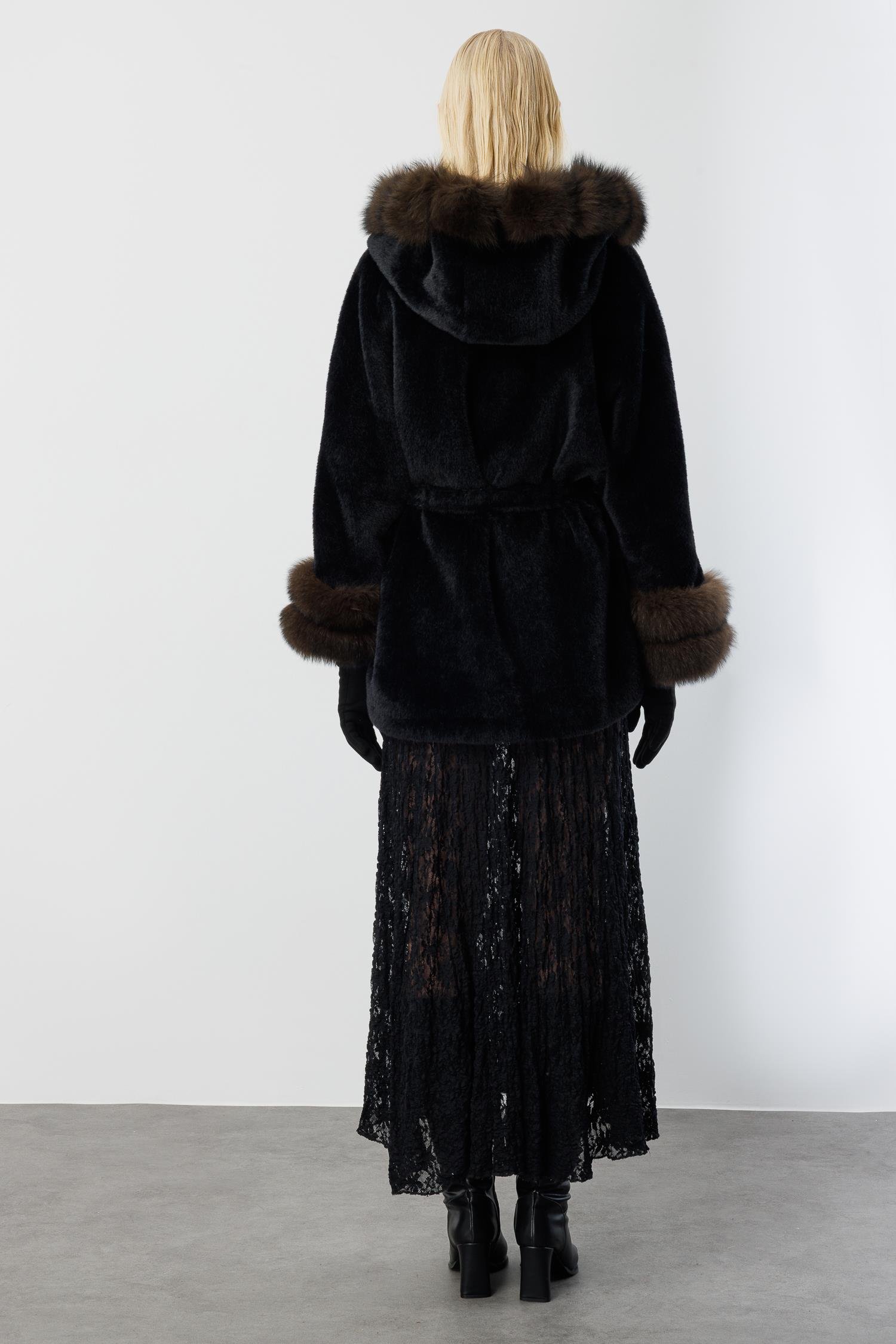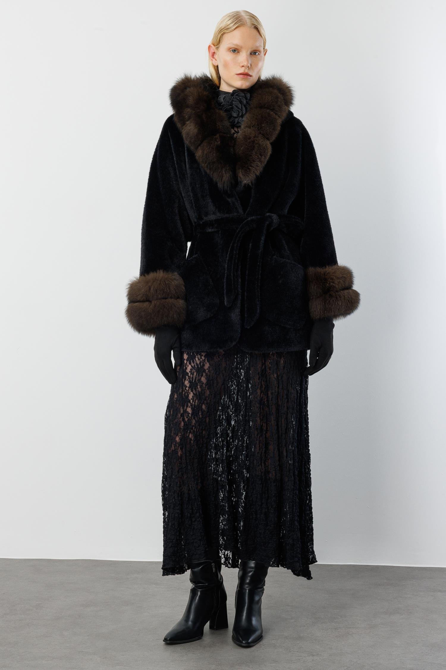 Modailgi Yaka ve Kol Manşeti Kürklü Kısa Alcantara Kaban - Siyah