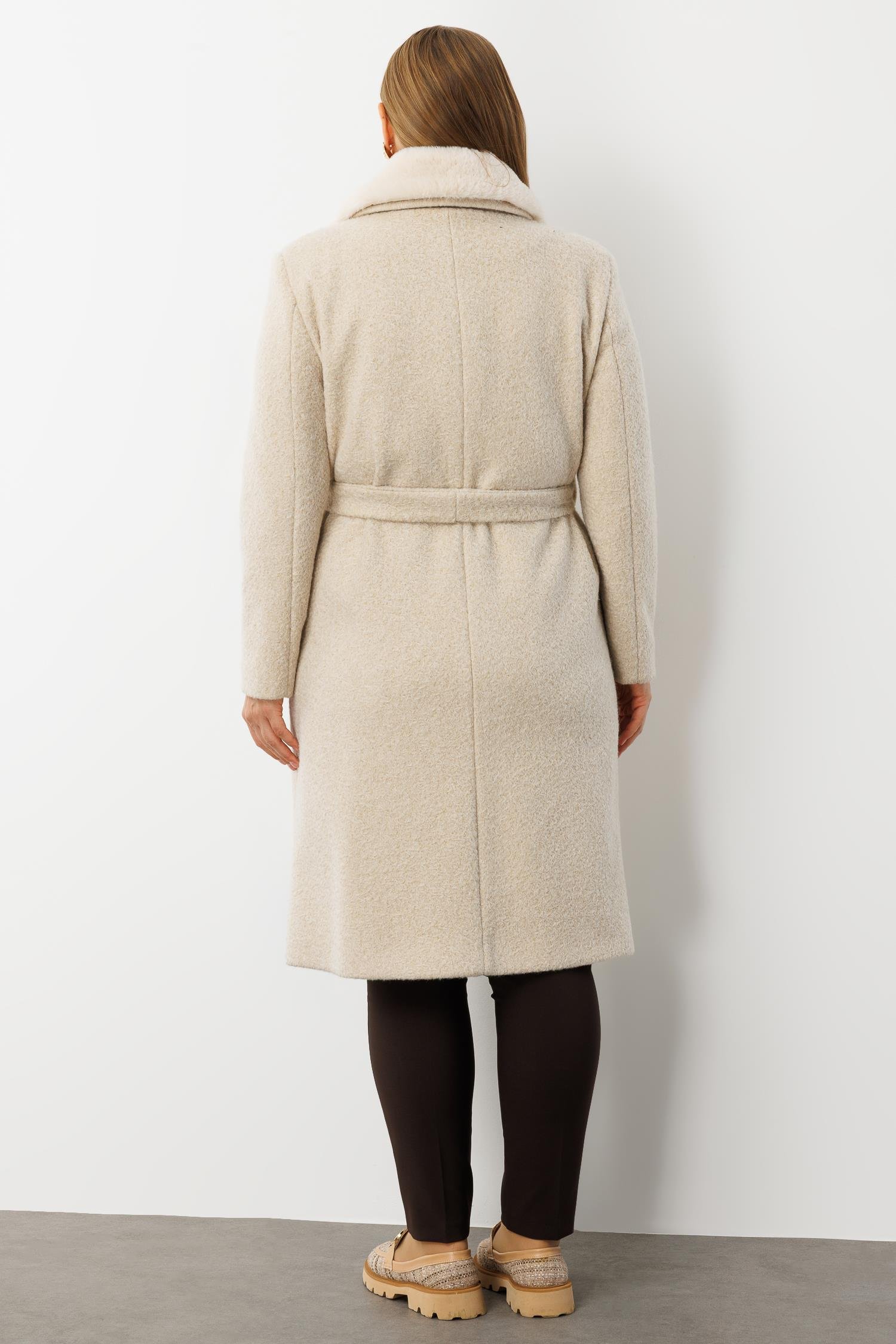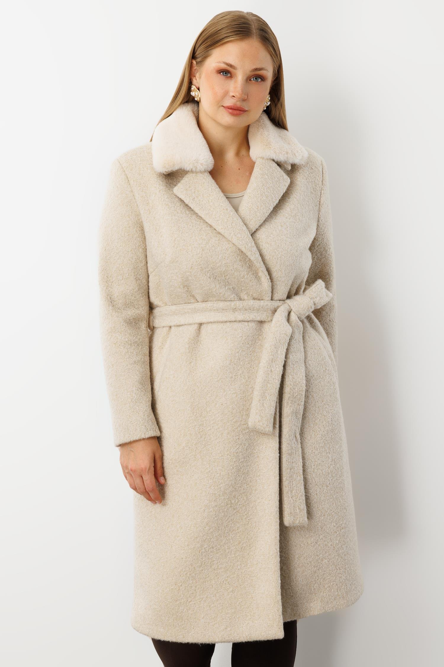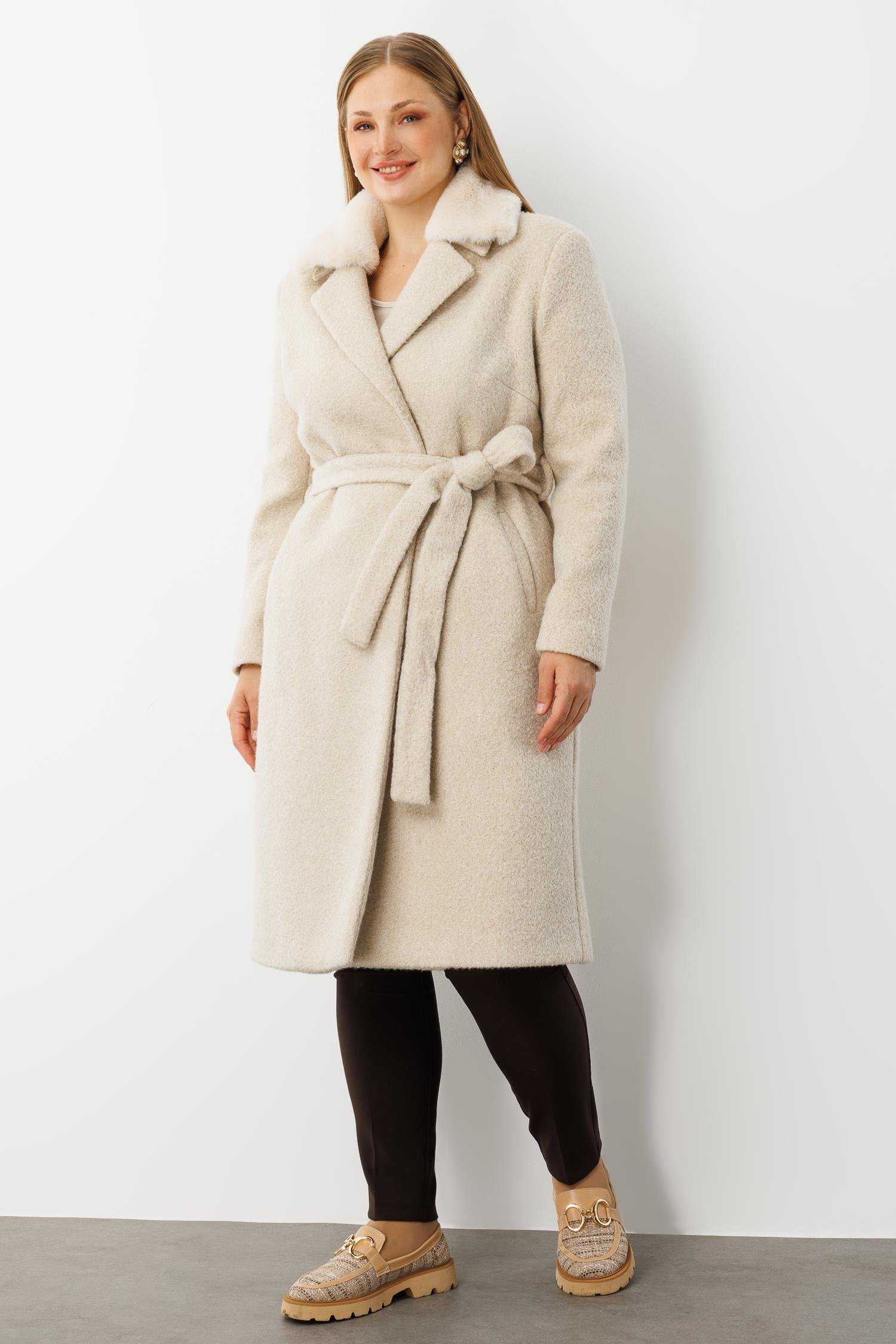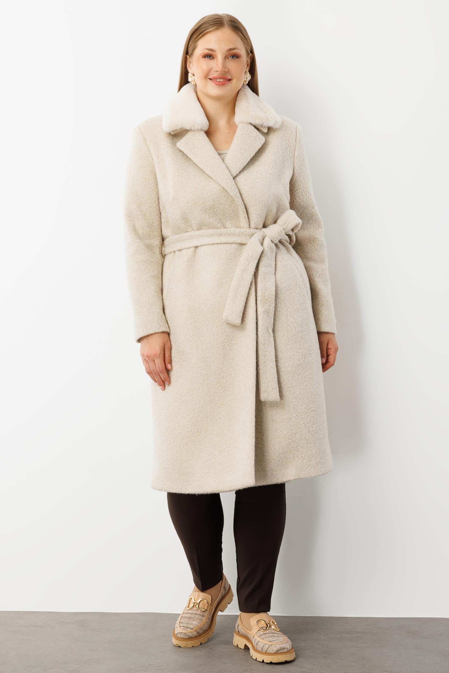 • Model: Kruvaze kesim, belden kuşaklı uzun kaşe kaban • Renk: Kemik • Kumaş: Kırçıllı dokulu premium kaşe kumaş • Detaylar: • Geniş yakalı ve çıkarılabilir peluş kürk detay • Belde kendi kumaşından bağlama kuşağı • Astarlı iç yapı ile sıcak ve konforlu kullanım • Düz kesim formu ile zarif bir siluet • Minimal dikiş detaylarıyla modern görünüm • Soğuk havalarda şıklık ve sıcaklığı bir arada sunar