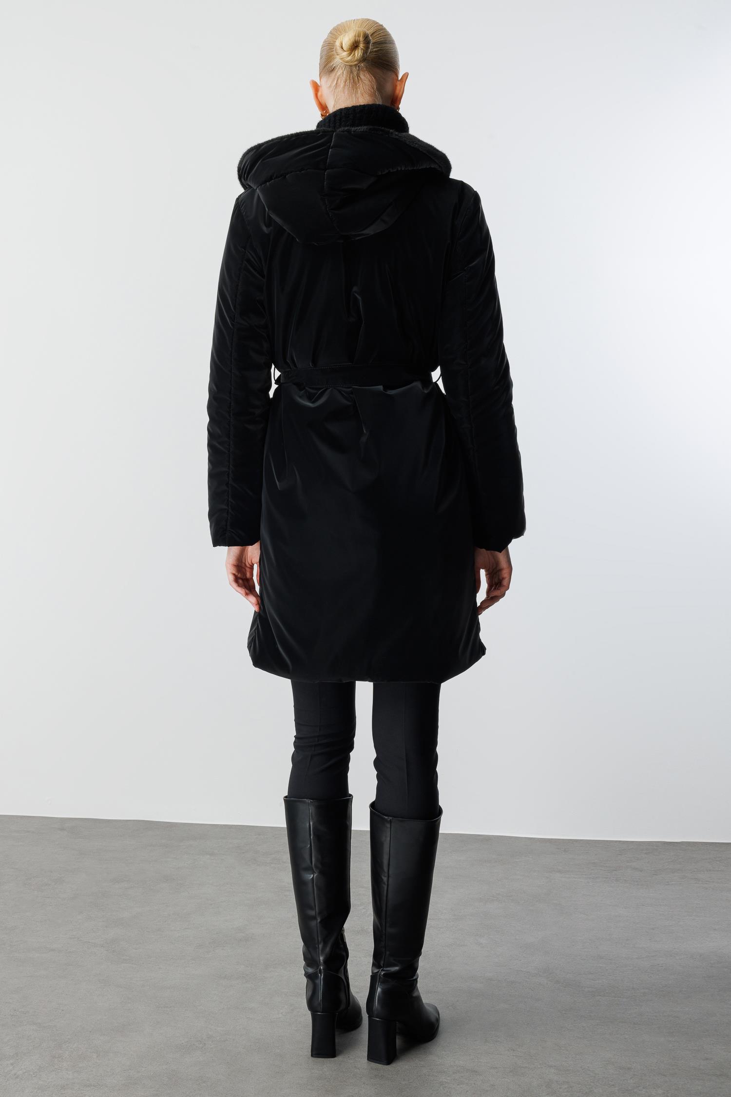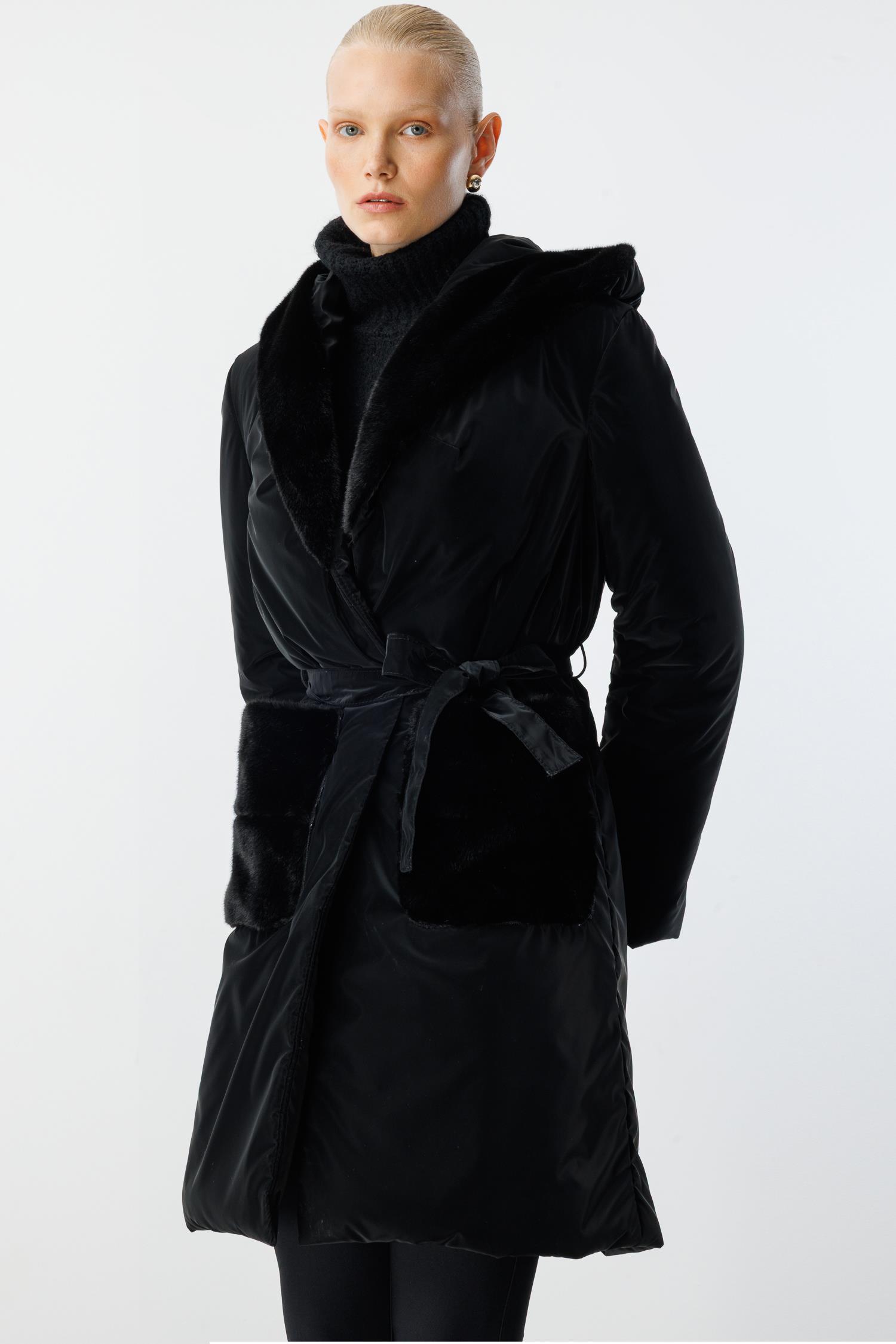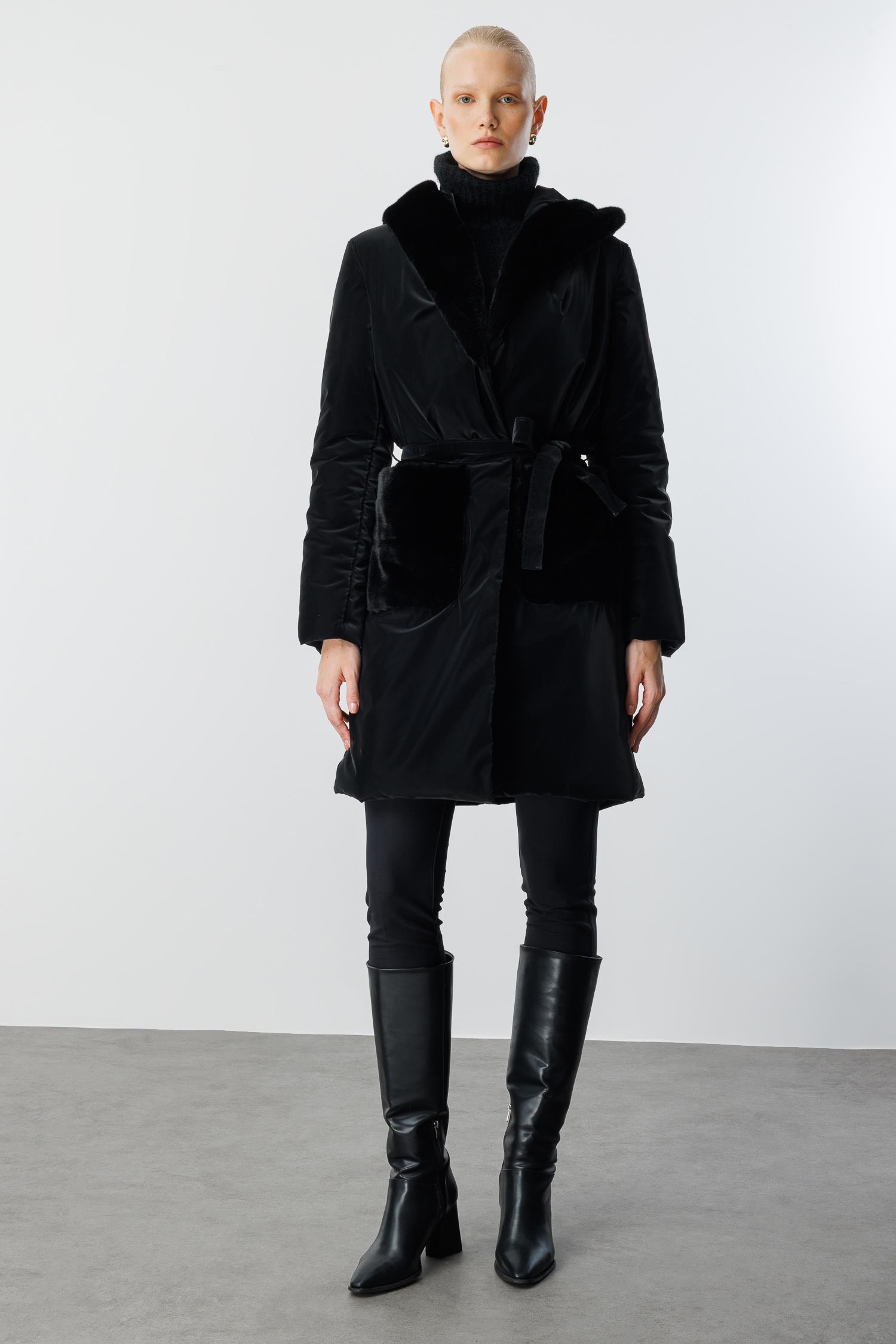 Modailgi Yakası Kürklü Torba Cepli Nova Kumaş Şişme Kaban - Siyah