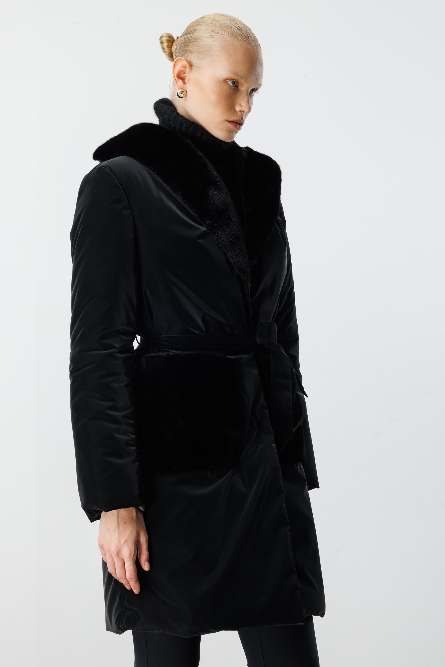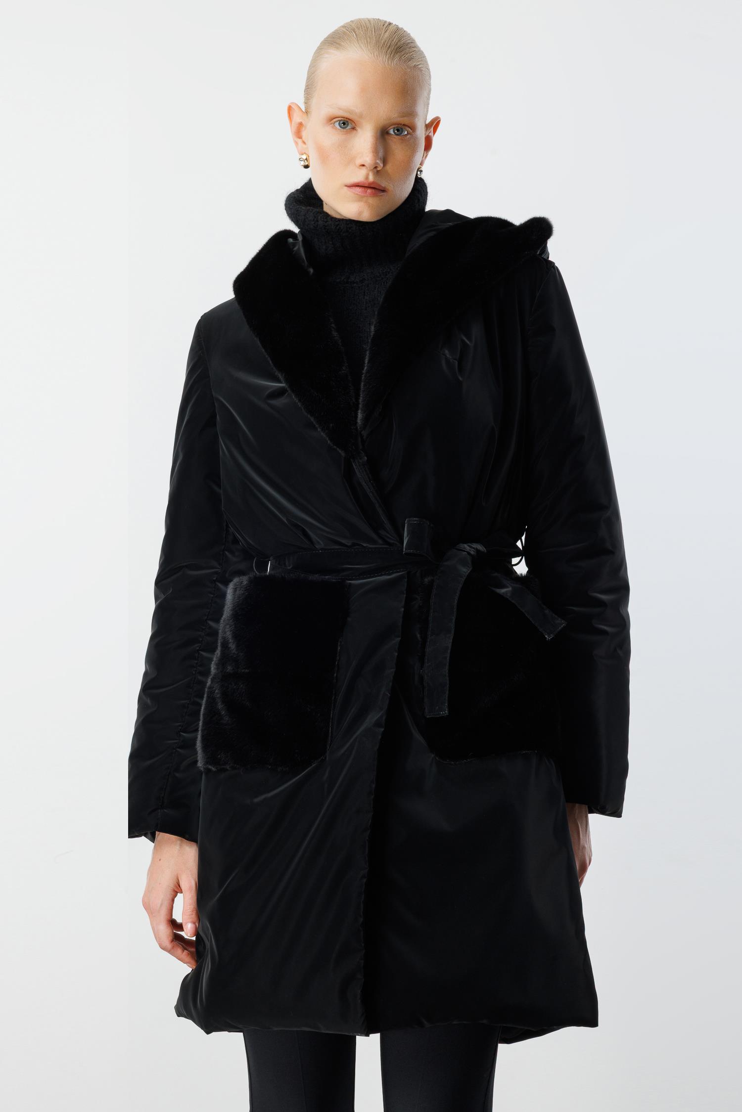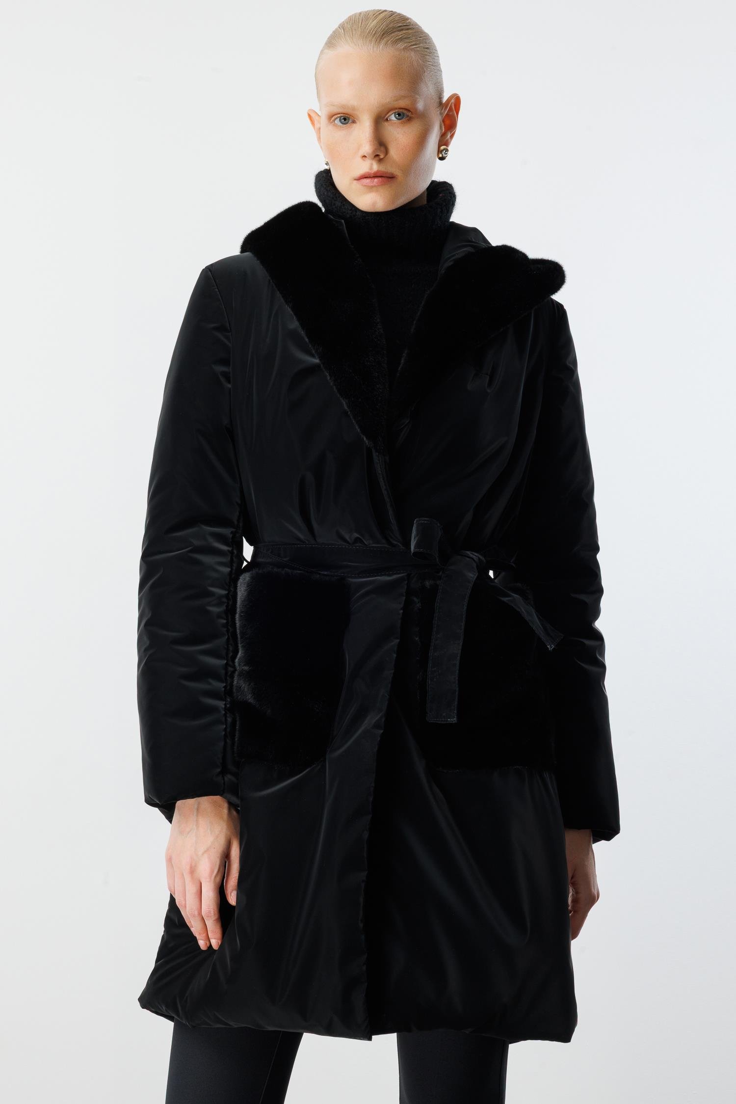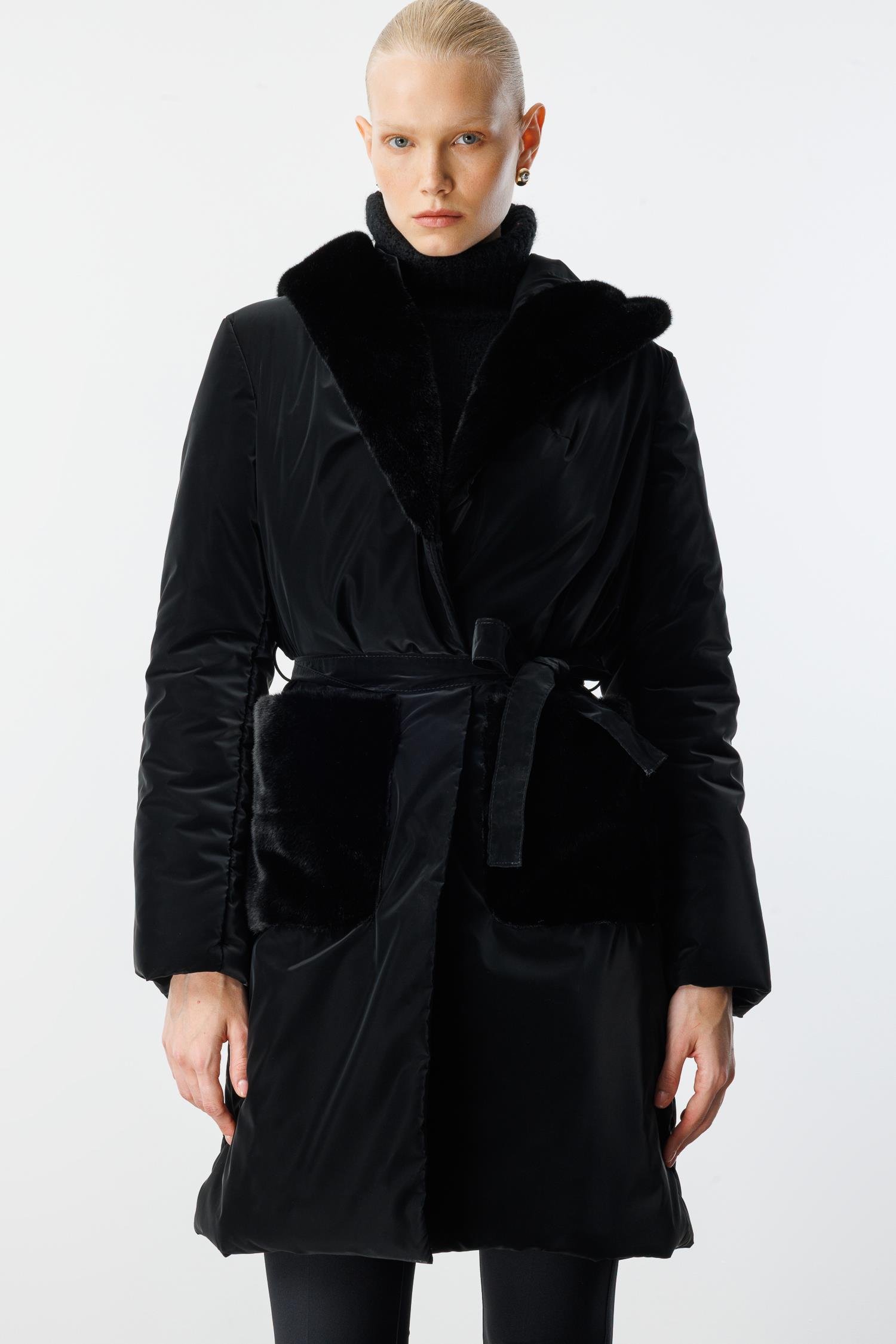 Modailgi’nin zarif şehir kadınına hitap eden bu şişme kaban, klasik siyah rengin asaletini kürk detaylarıyla birleştiriyor. Nova kumaşın parlak yüzeyiyle ışığı yansıtan modern bir siluet sunarken, konforlu formu ile soğuk günlerde lüks bir koruma sağlıyor.