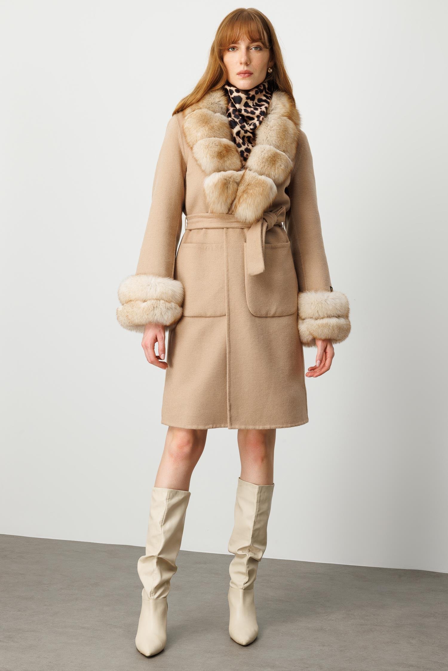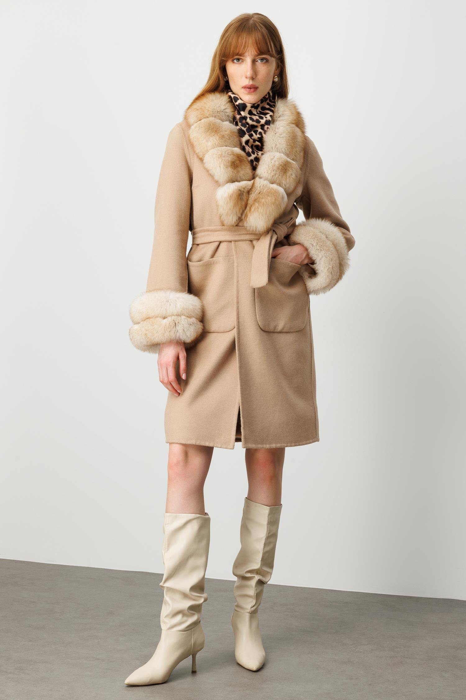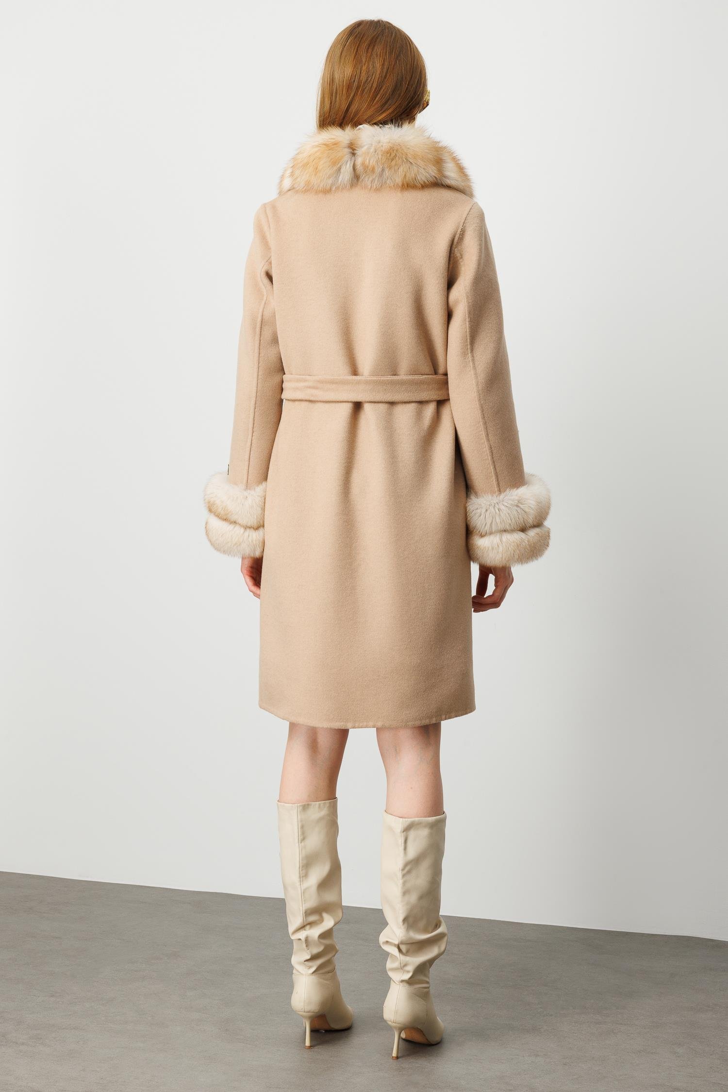 Modailgi Yakası ve Kol Manşeti Tilki Kürklü Belden Kuşaklı Alpaca Kaban - Camel