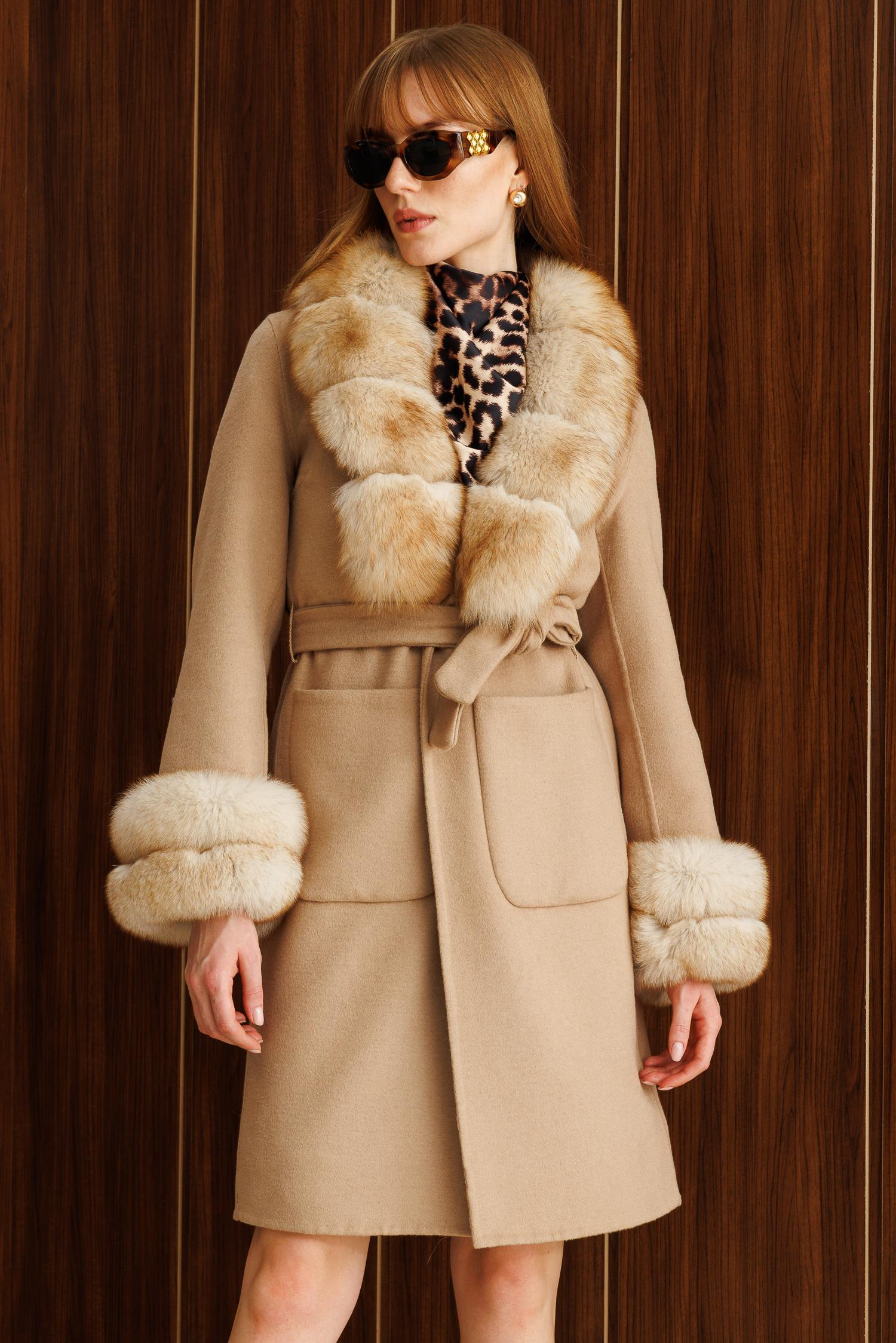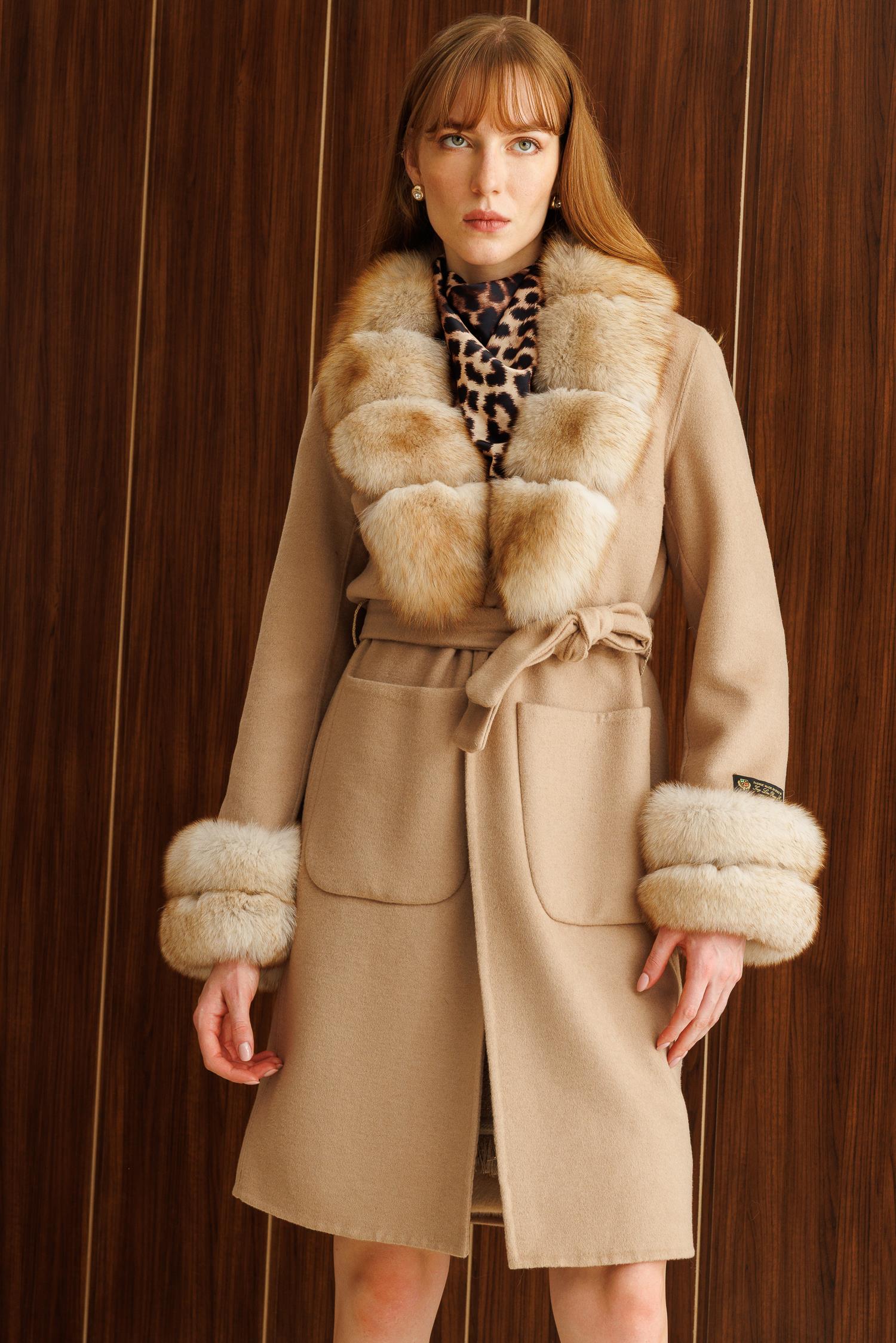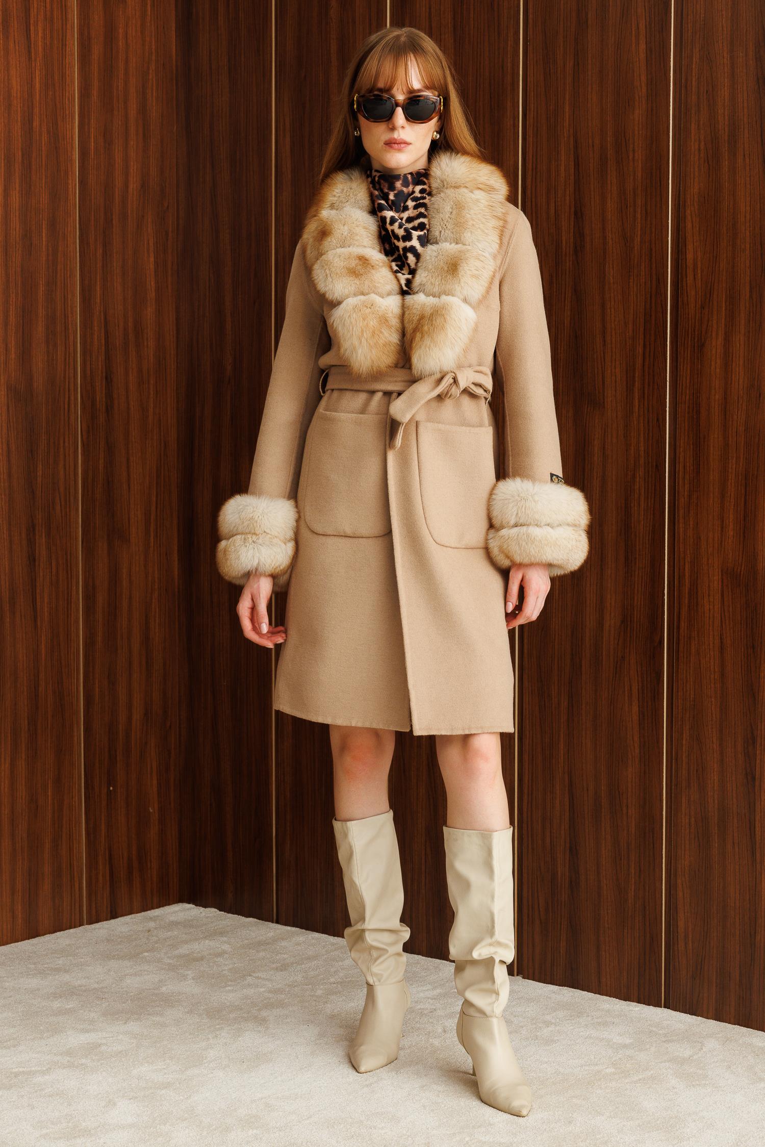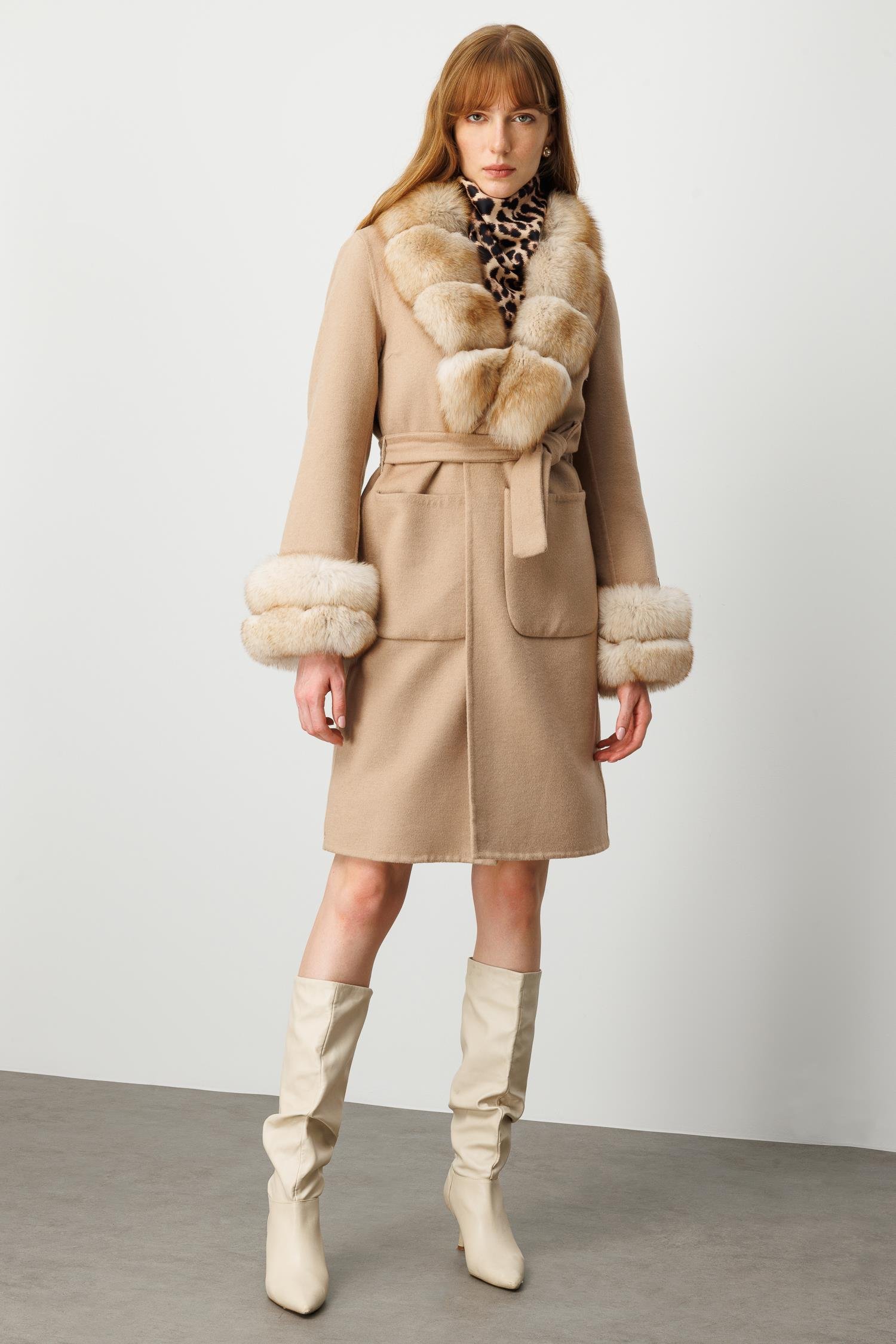 Modailgi Yakası ve Kol Manşeti Tilki Kürklü Belden Kuşaklı Alpaca Kaban - Camel