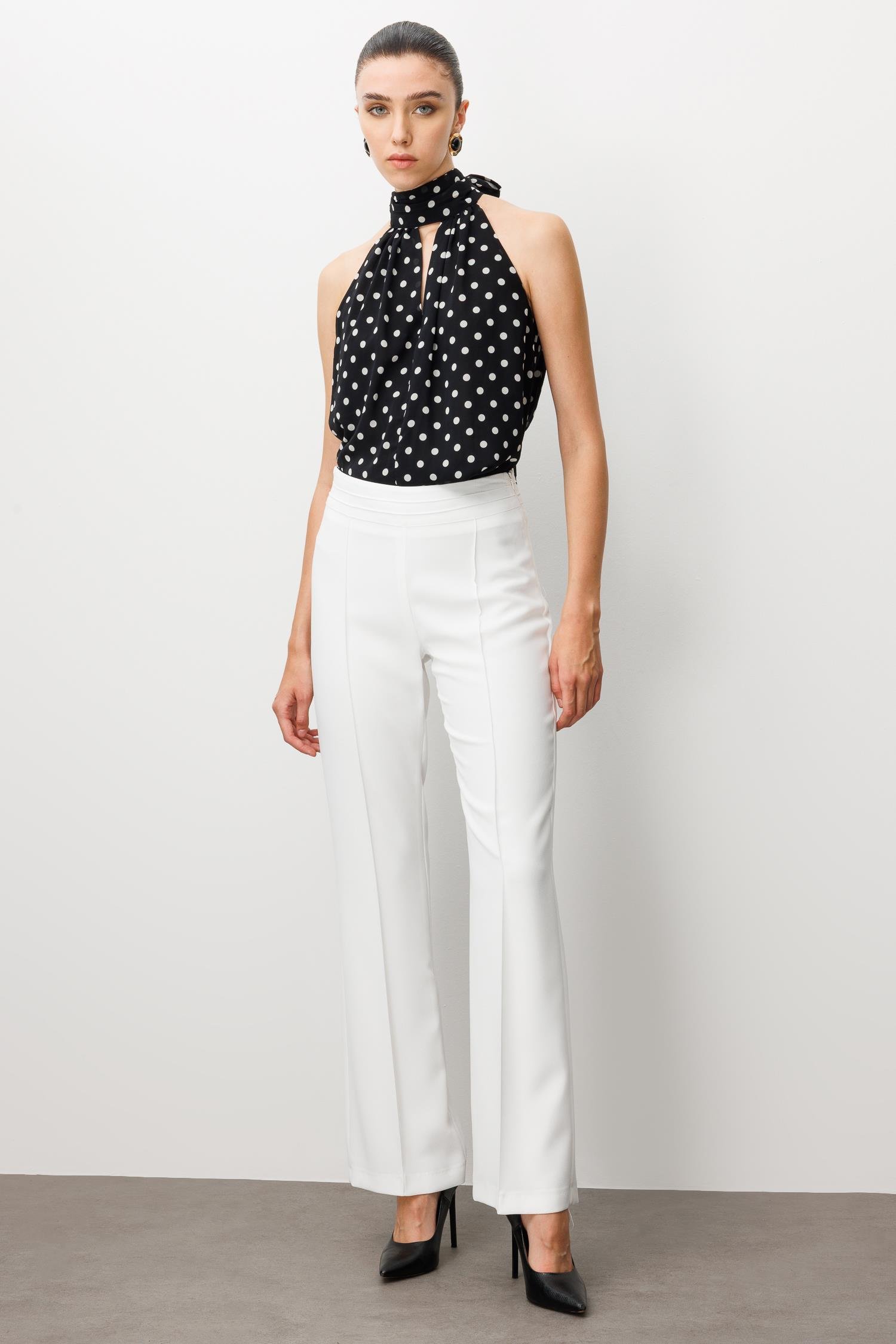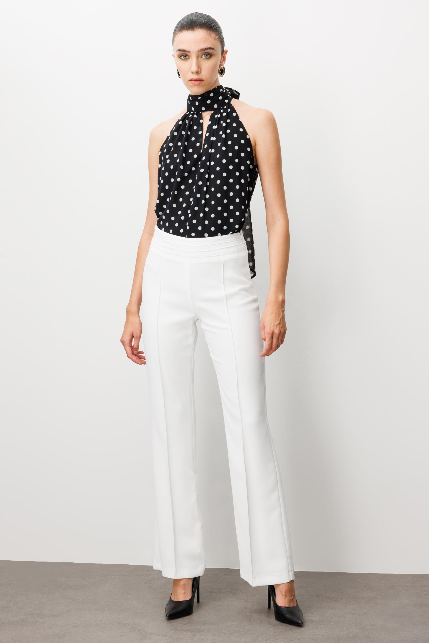 • Üst Giyim: Puantiyeli saten bluzlar, şifon gömlekler veya dar kesim trikolarla mükemmel uyum sağlar.