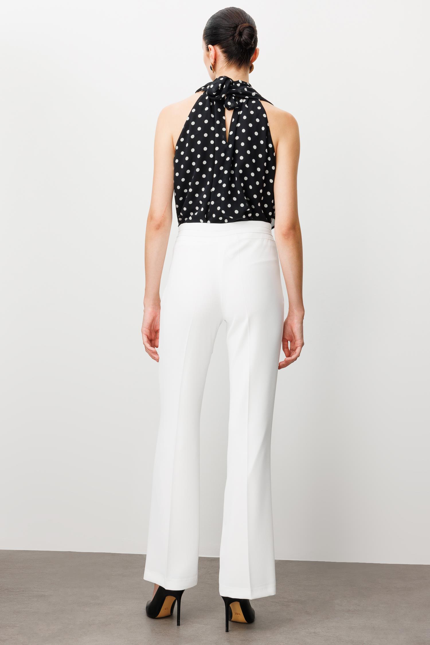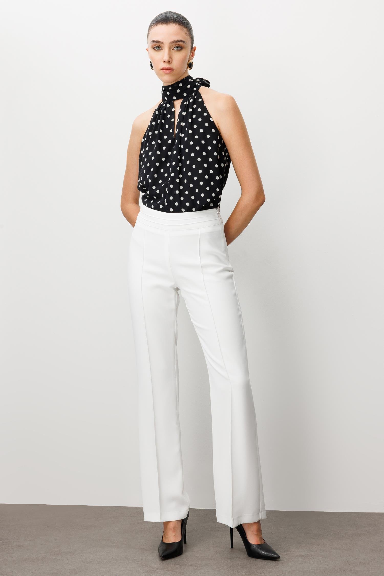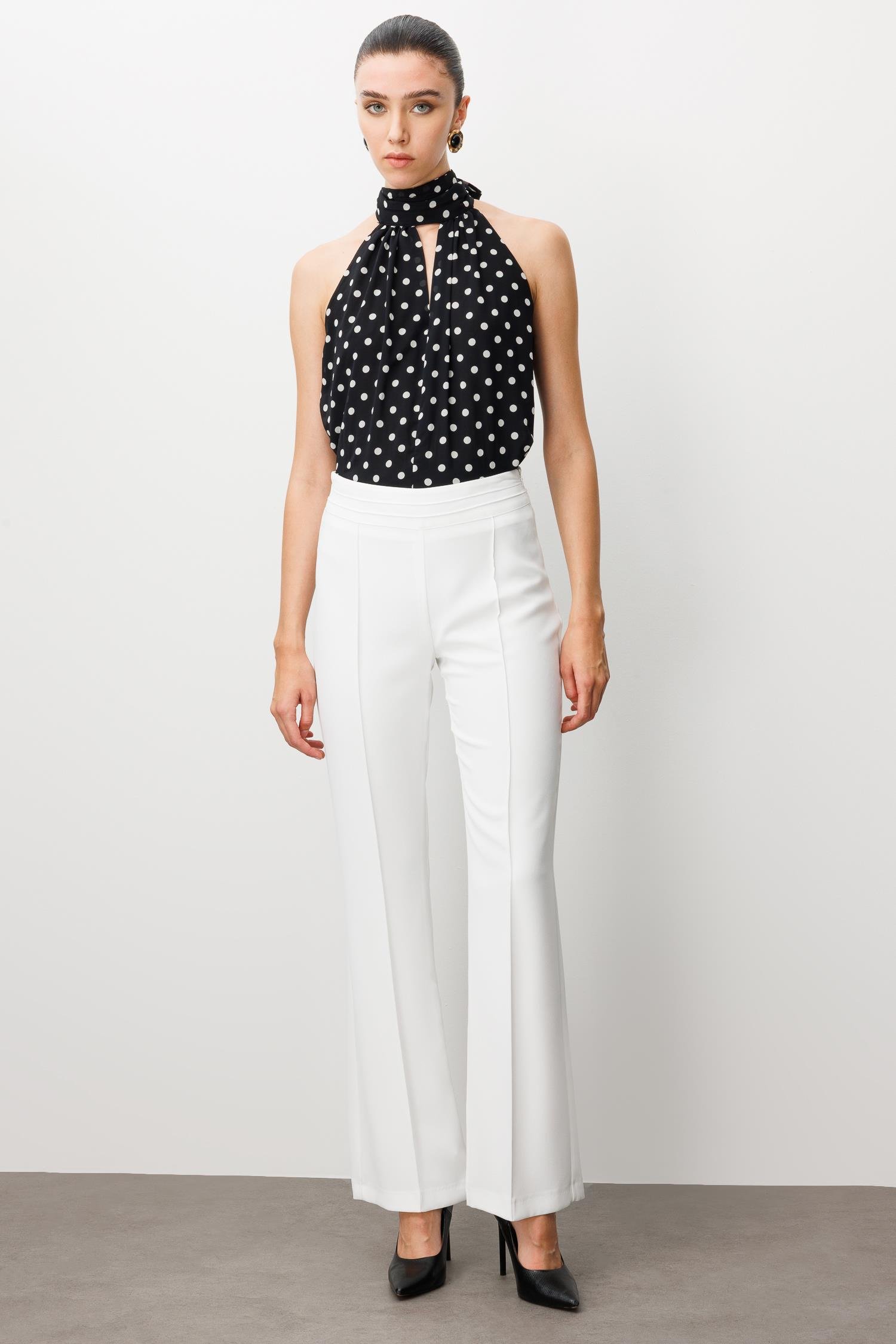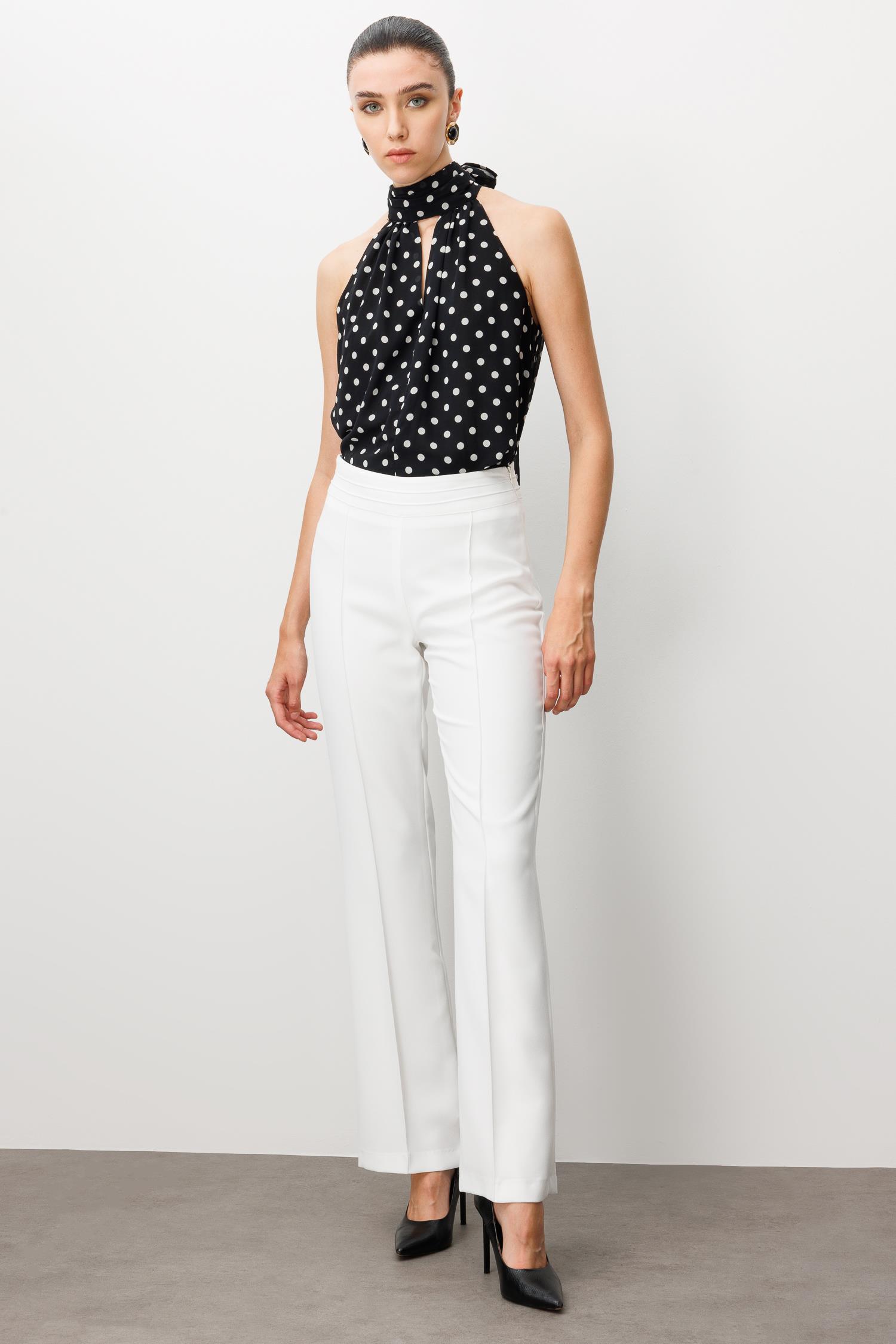 Modailgi’nin zarif çizgisini modern dokunuşlarla birleştiren bu pantolon, minimal detaylarıyla şıklığı ön plana çıkarıyor. Ekru tonunun sofistike görünümü, klasik İspanyol paça formuyla birleşerek hem gündüz hem gece kullanımı için ideal bir alternatif sunuyor.