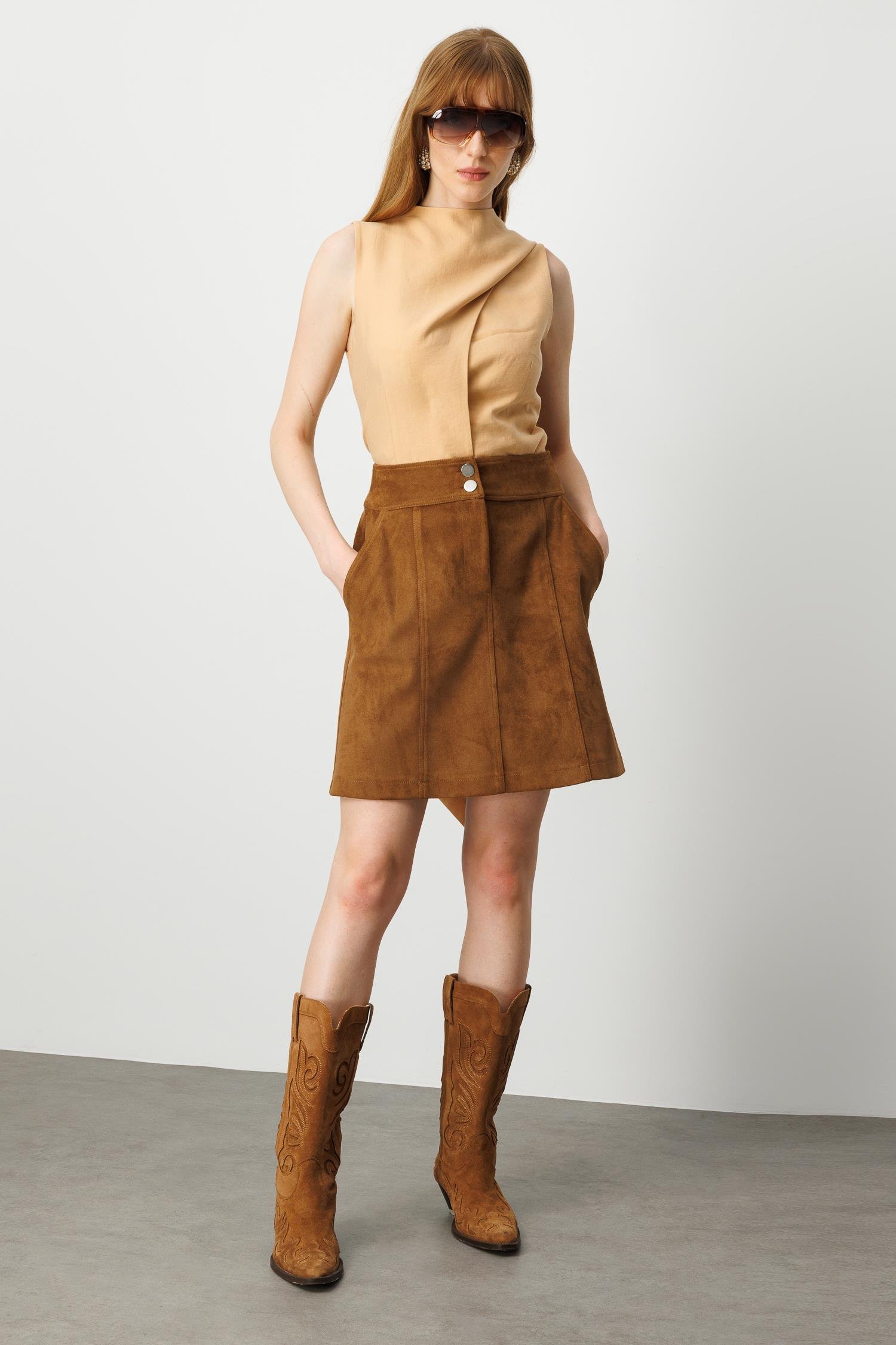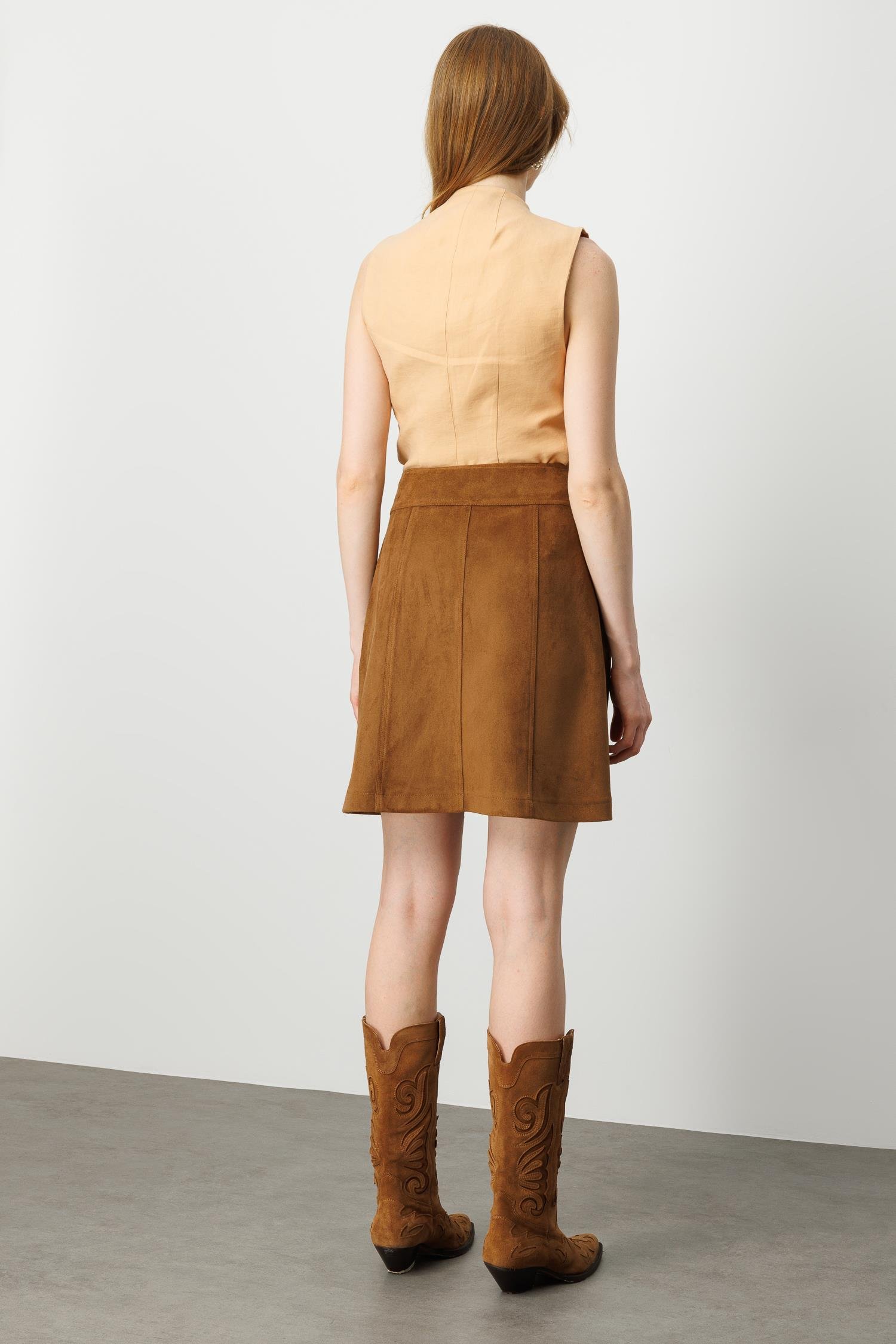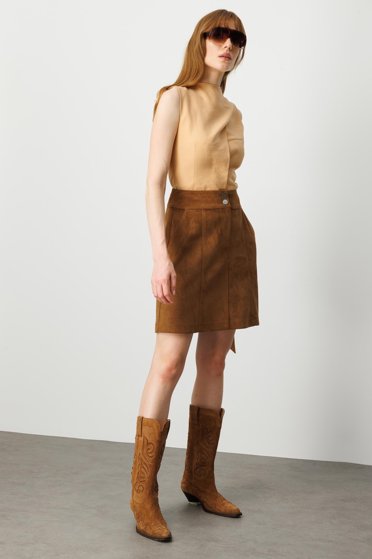 Modailgi Yüksek Bel Yandan Cepli Spor Dikişli Kısa Çan Etek - Taba