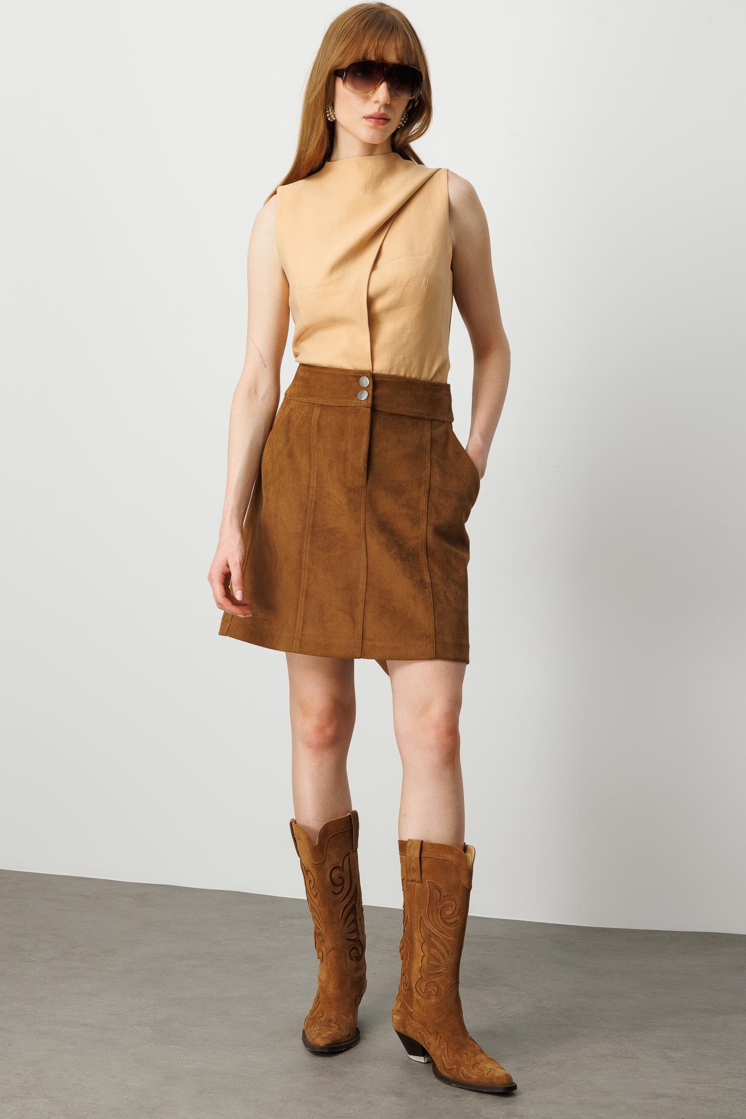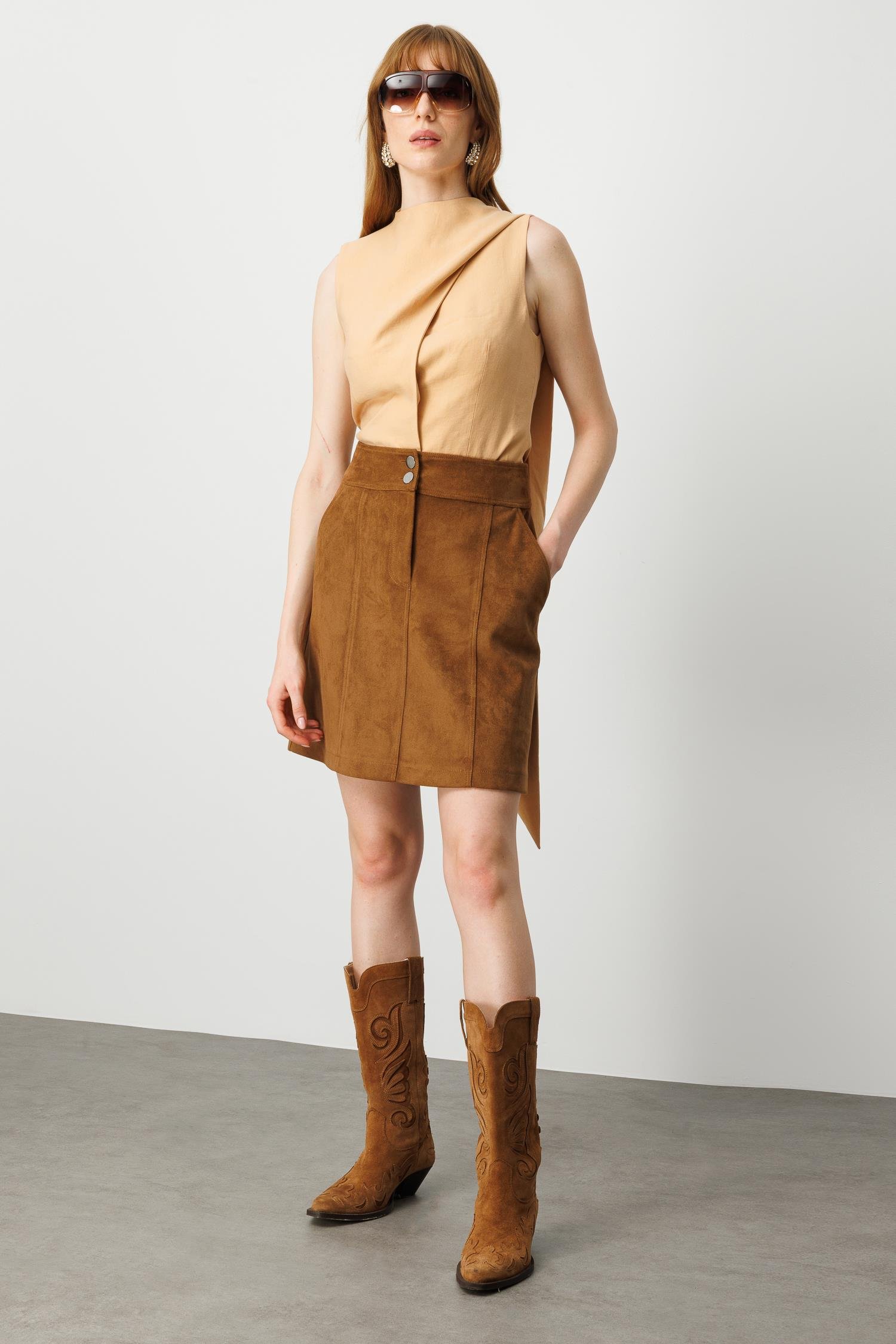 Bu etek, Modailgi’nin şehirli kadını için konfor ve şıklığı aynı anda sunma arzusuyla tasarlandı. Western esintili taba tonu, doğal süet dokusu ve zarif formu ile zamansız bir gardırop parçası. Güne kahve tonlarının sıcaklığıyla başlamak isteyen kadınlar için…