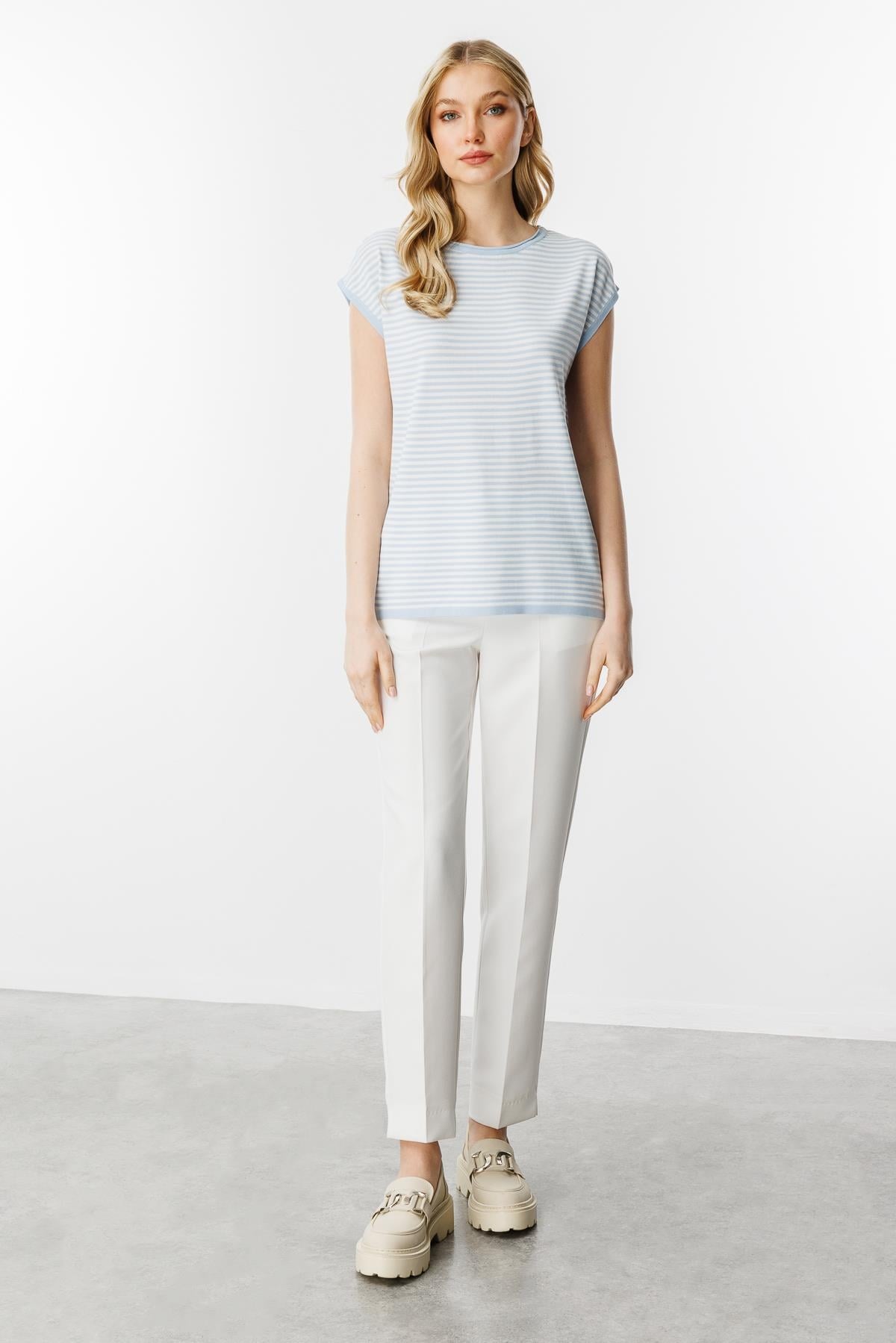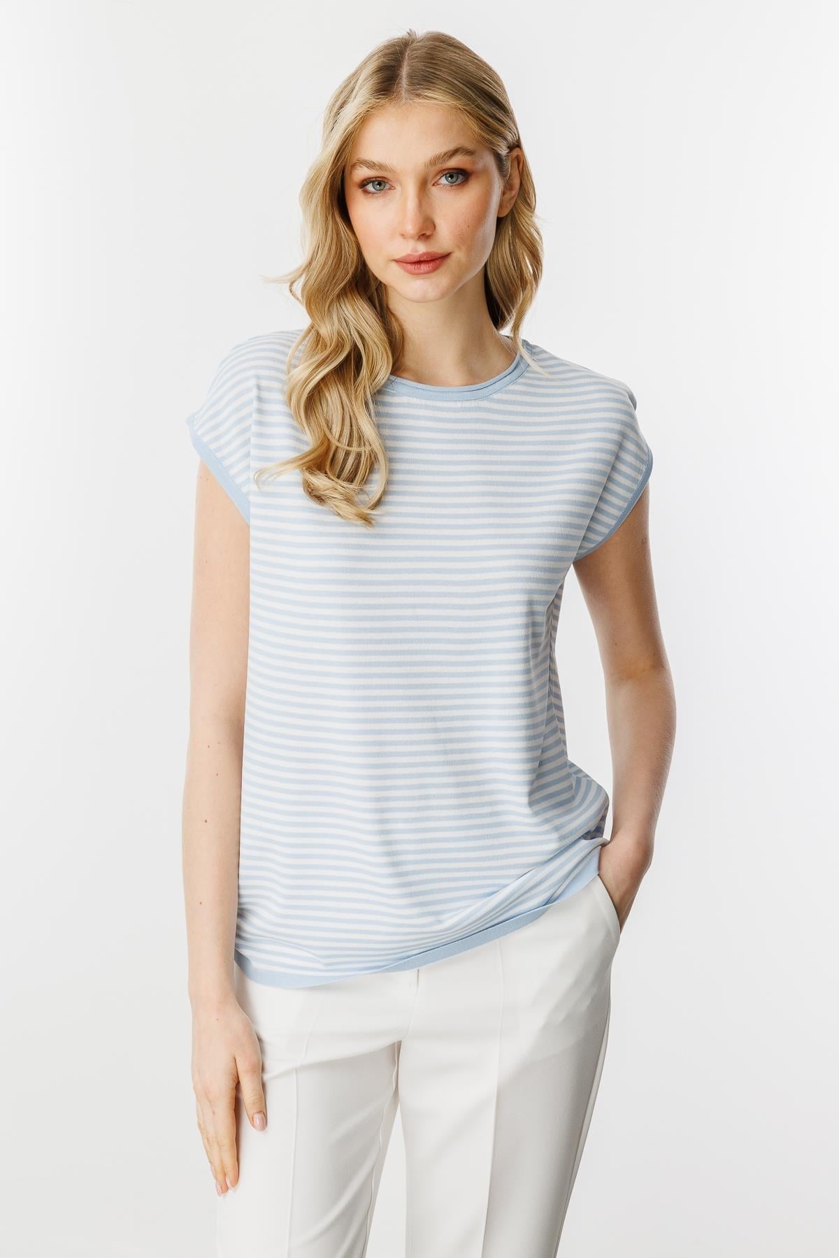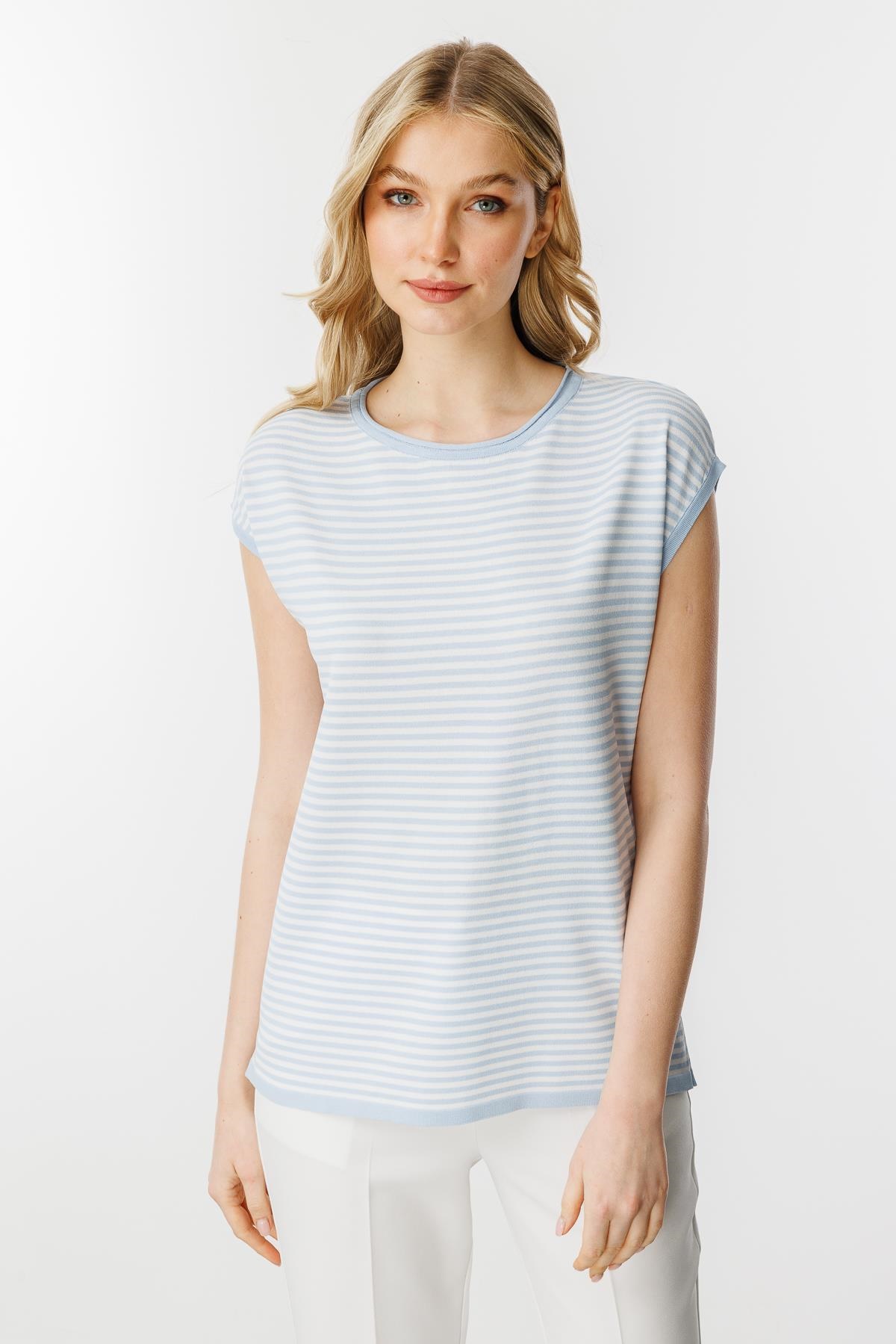 Mutlu Ertan Kadın Çizgili Basic Triko Bluz Mavi - Ekru 20187 (20187)